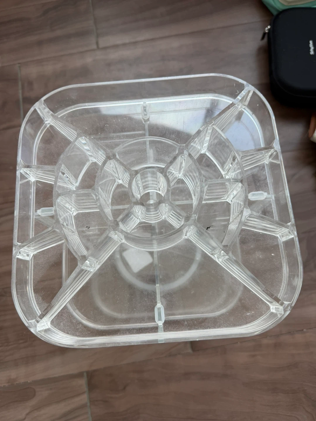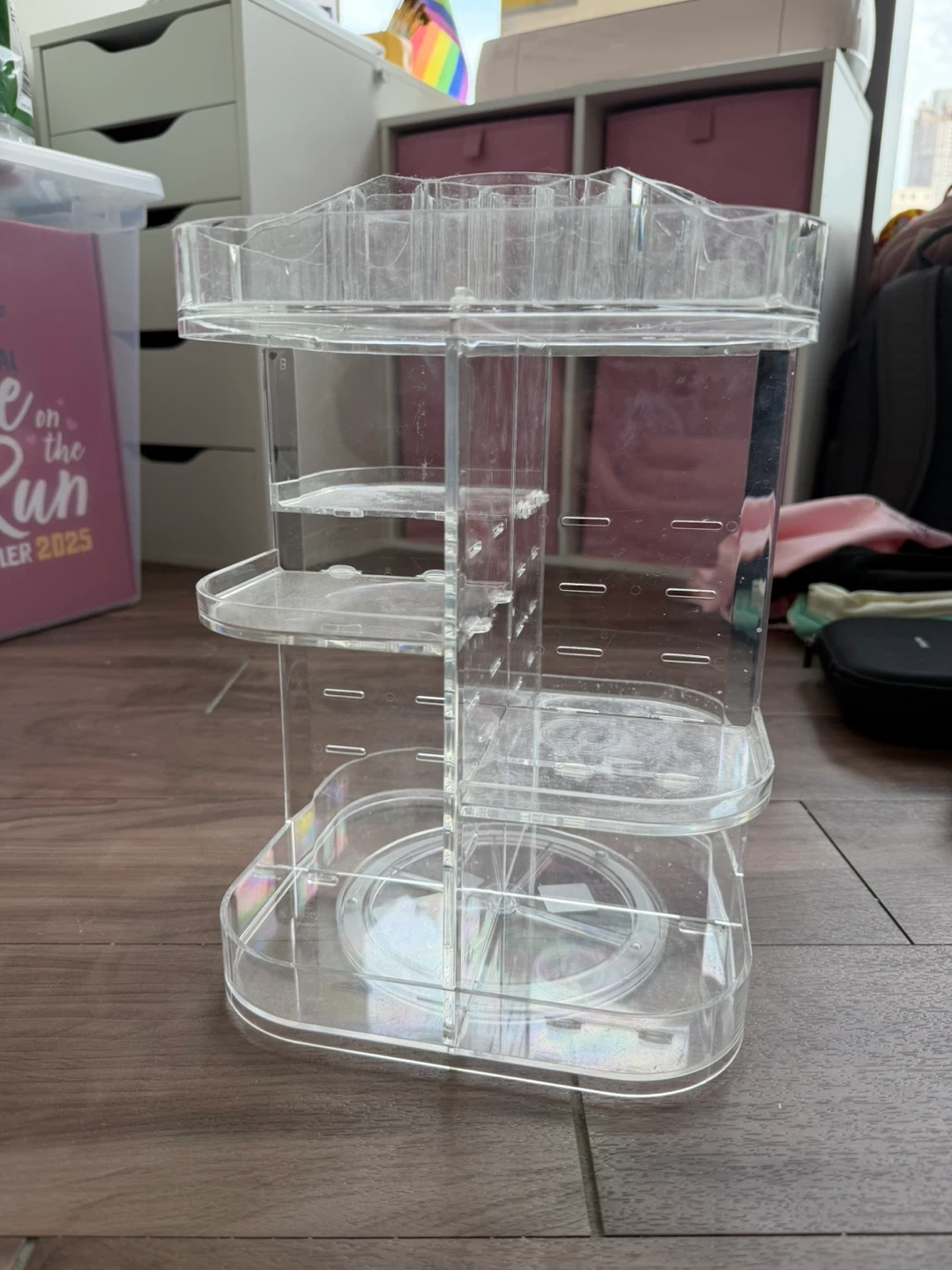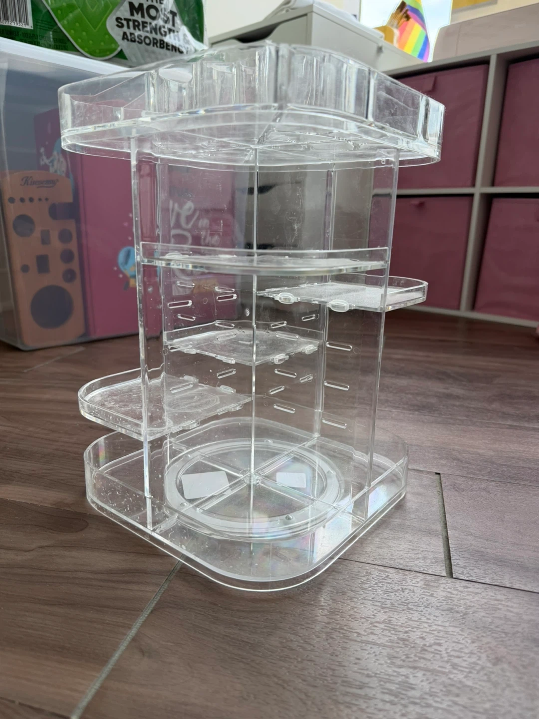 Clear acrylic makeup organizer with multiple compartments. It rotates 360 degrees for easy access to your cosmetics. This organizer includes several ADJUSTABLE tiers for various items like lipstick, brushes, and bottles.