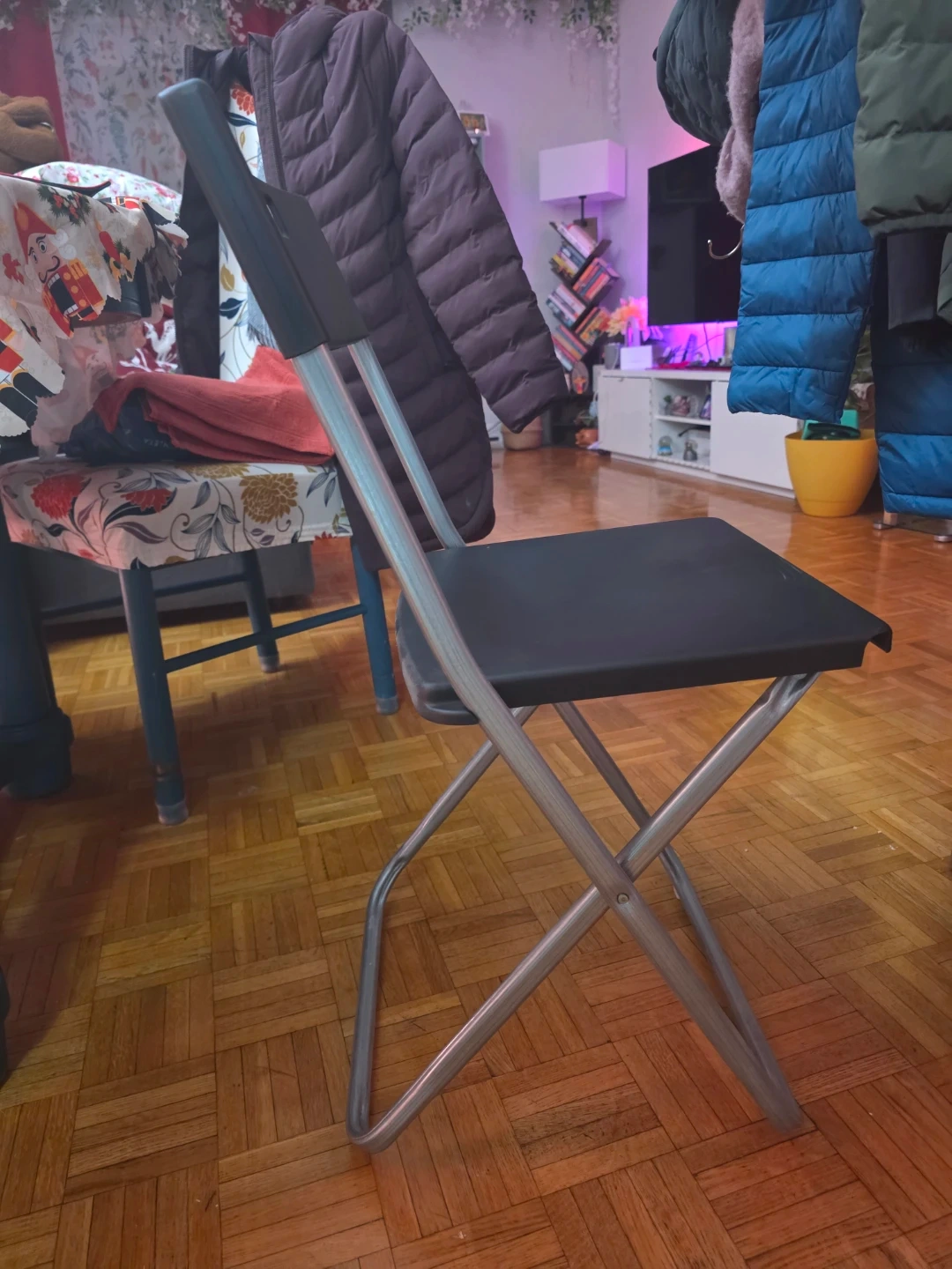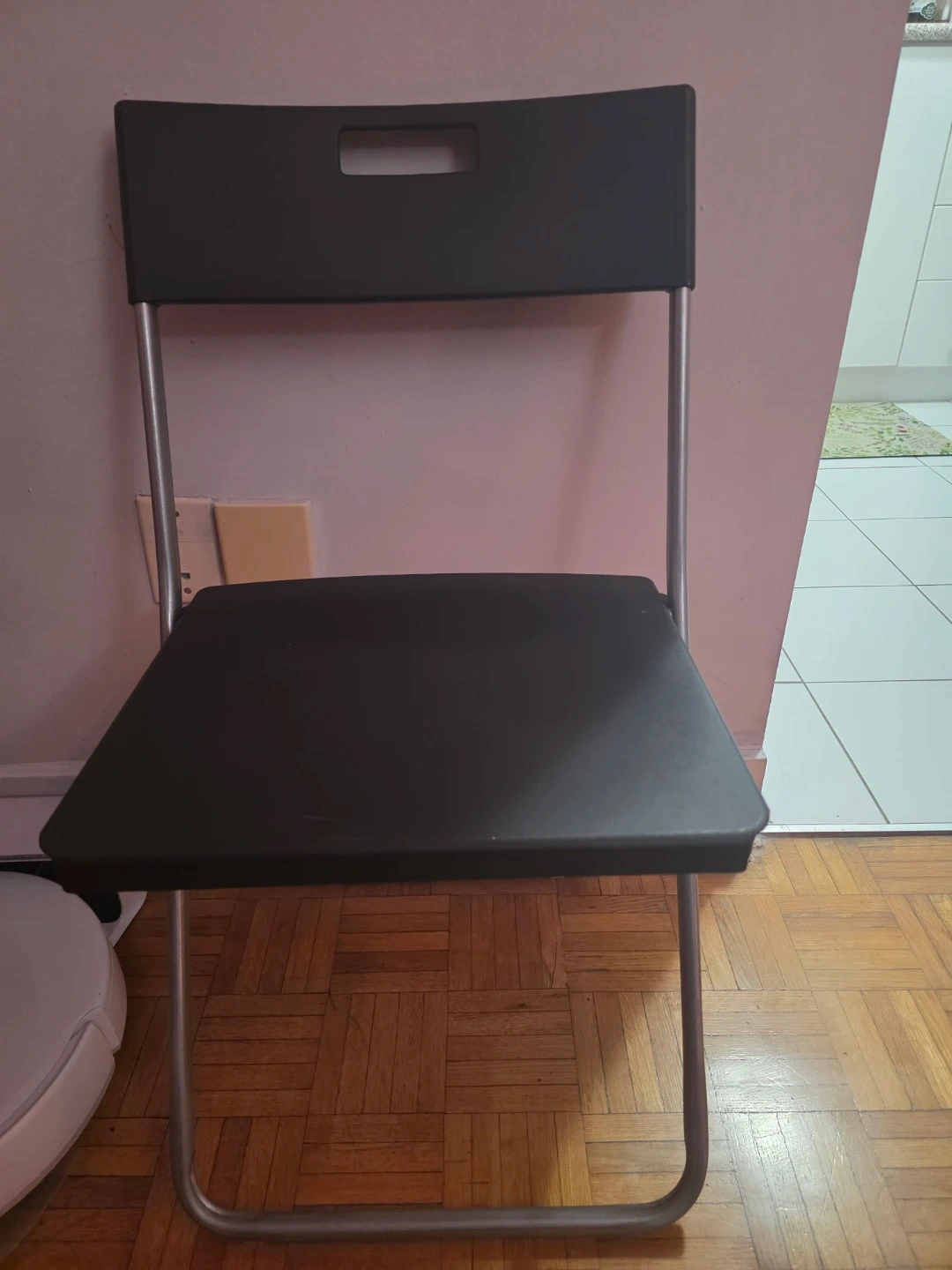 Selling a handy black folding chair! It's perfect for extra seating when you have guests over or for small spaces where you need a chair that can be easily stored away. It's in great shape and ready to use