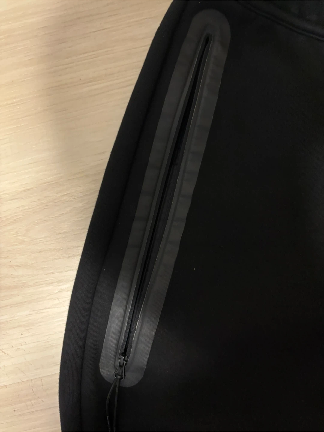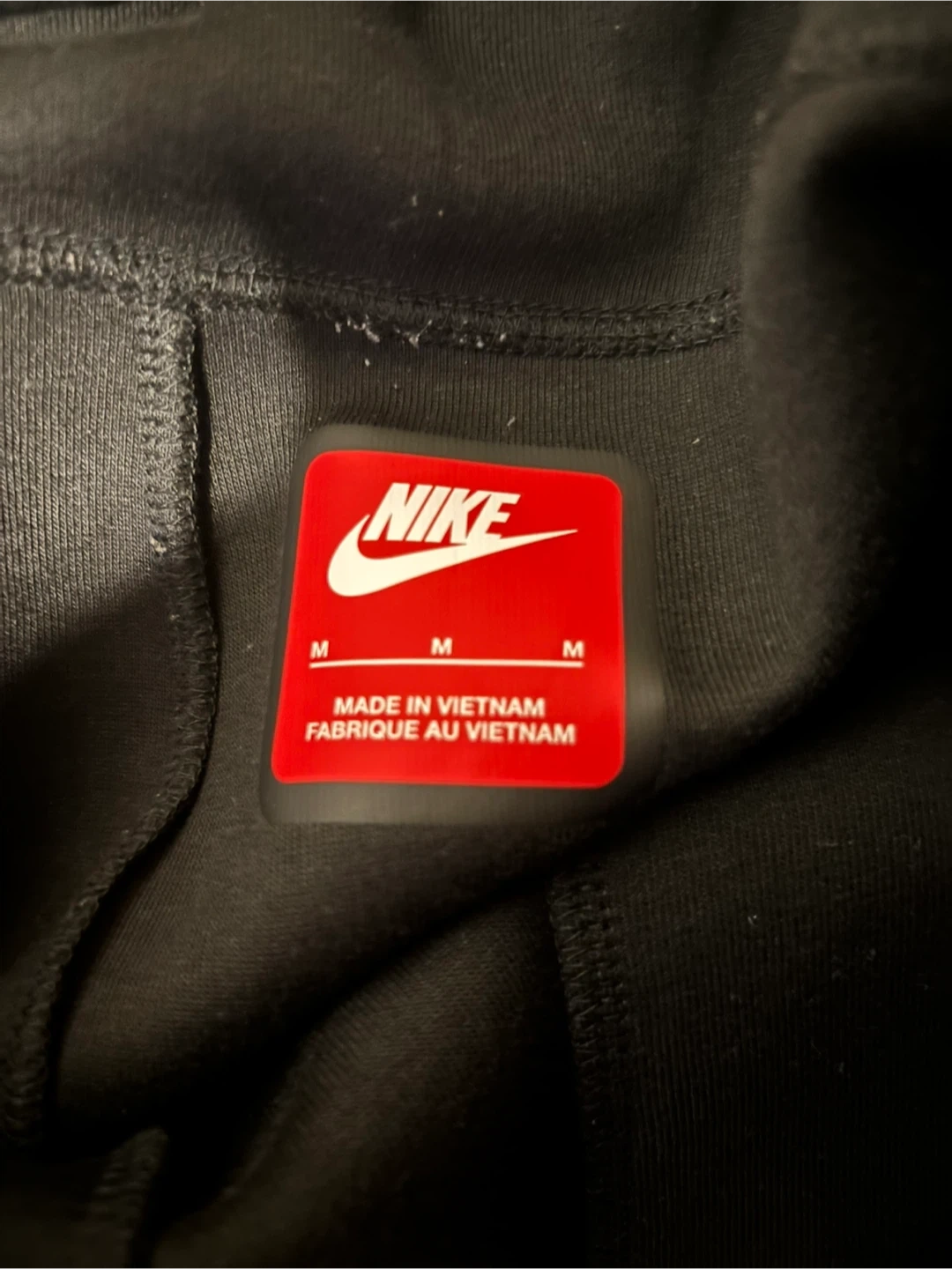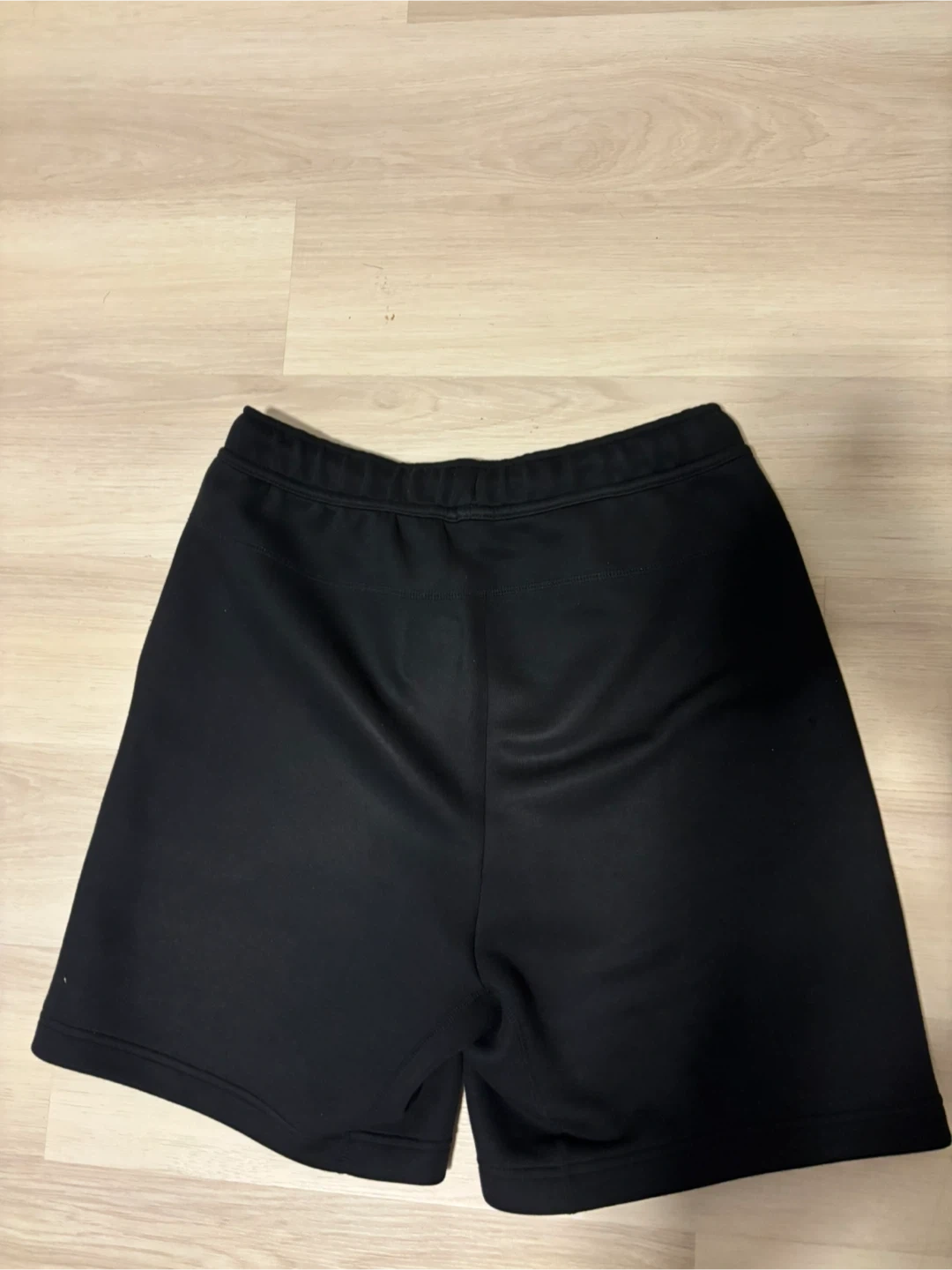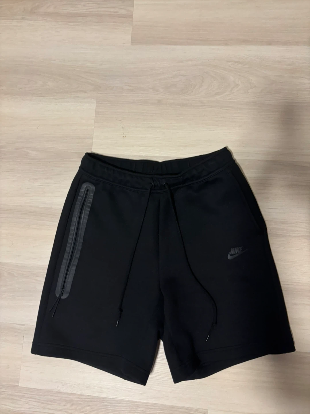 Black Nike Tech Fleece shorts. Size medium. They're made from a comfortable fleece material with a zippered pocket detail. Great for workouts or casual wear!