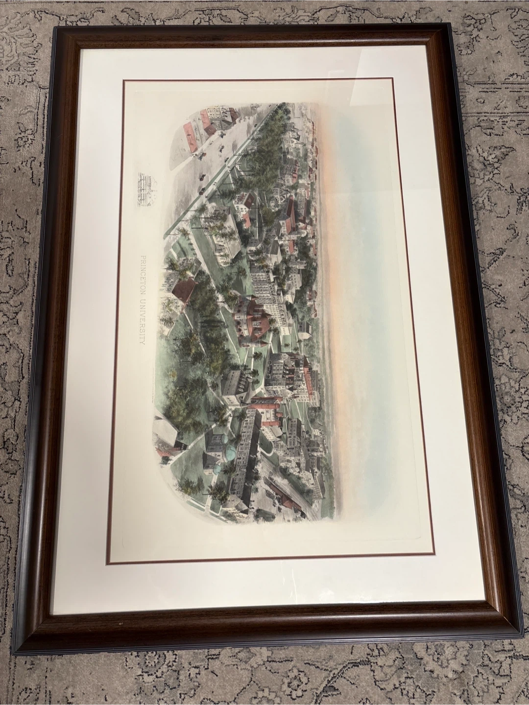 Framed aerial view print of Princeton University. Features a dark wood frame and a matting border. Shows buildings, greenery, and a street scene.