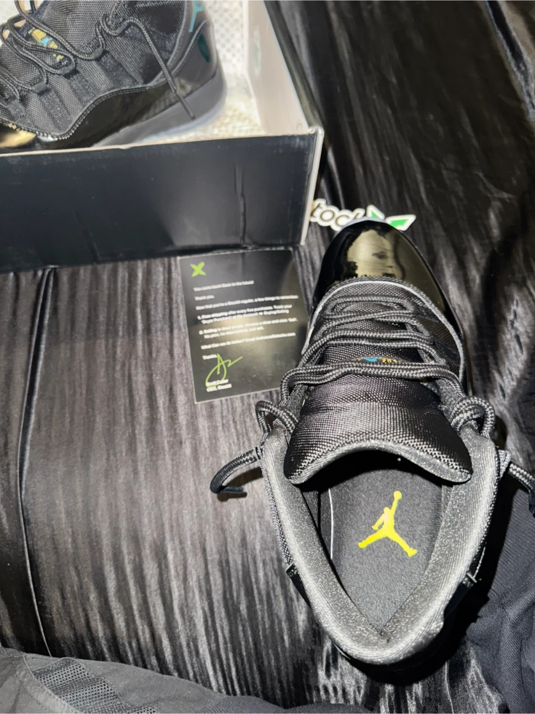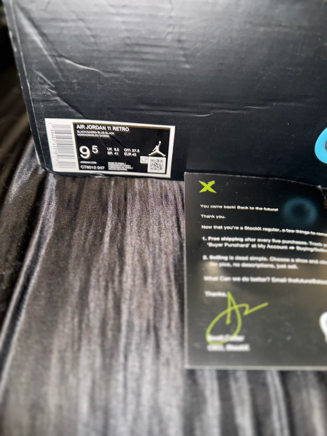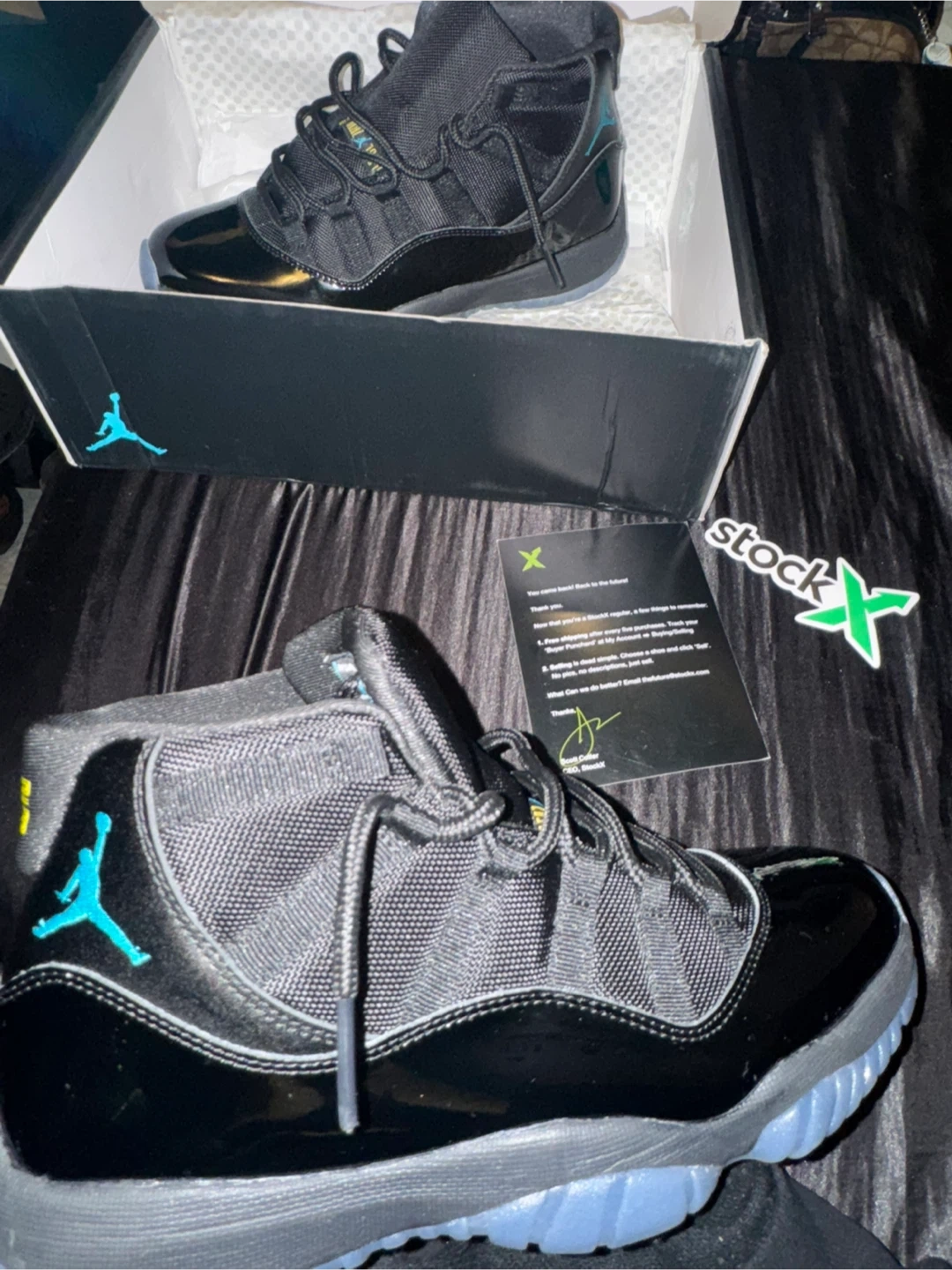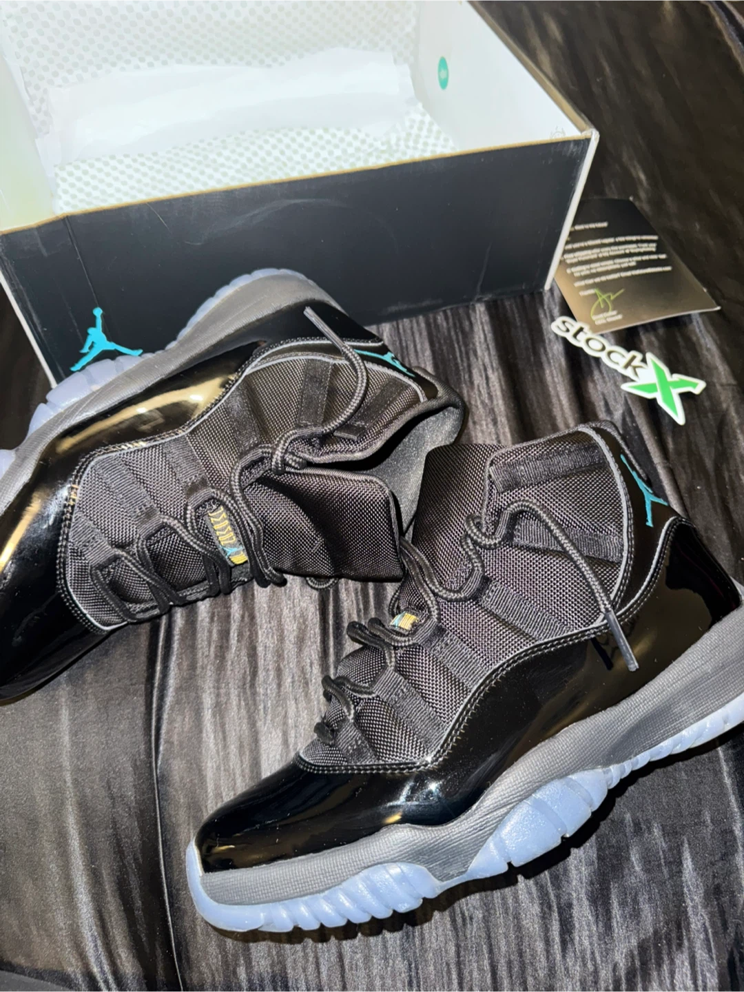 Air Jordan 11 Retro "Midnight Navy" sneakers in men's size 9.5. Black and midnight navy colorway with translucent icy blue soles. Includes original box and StockX verification card. These are a retro re-release of a classic Jordan model!