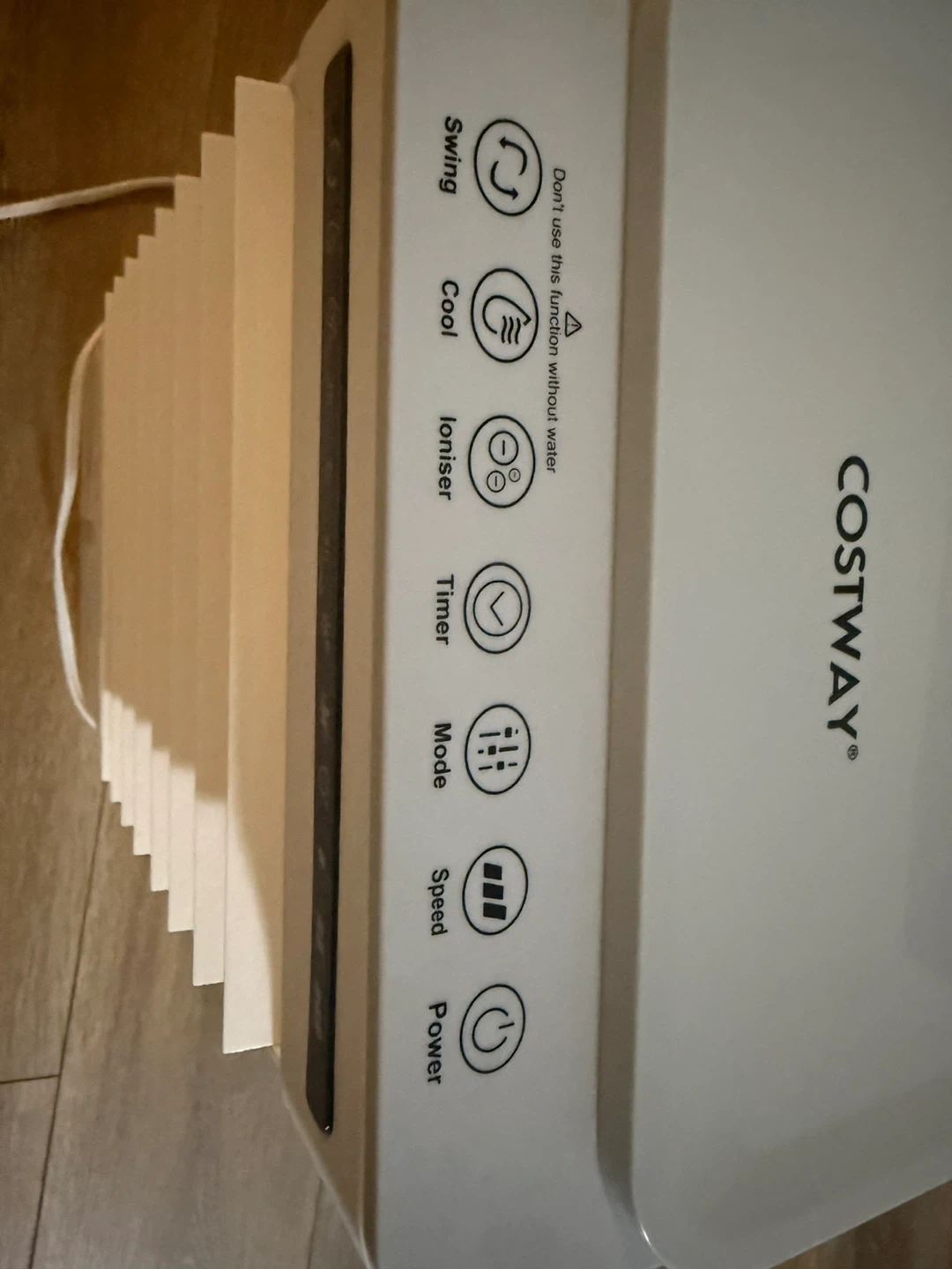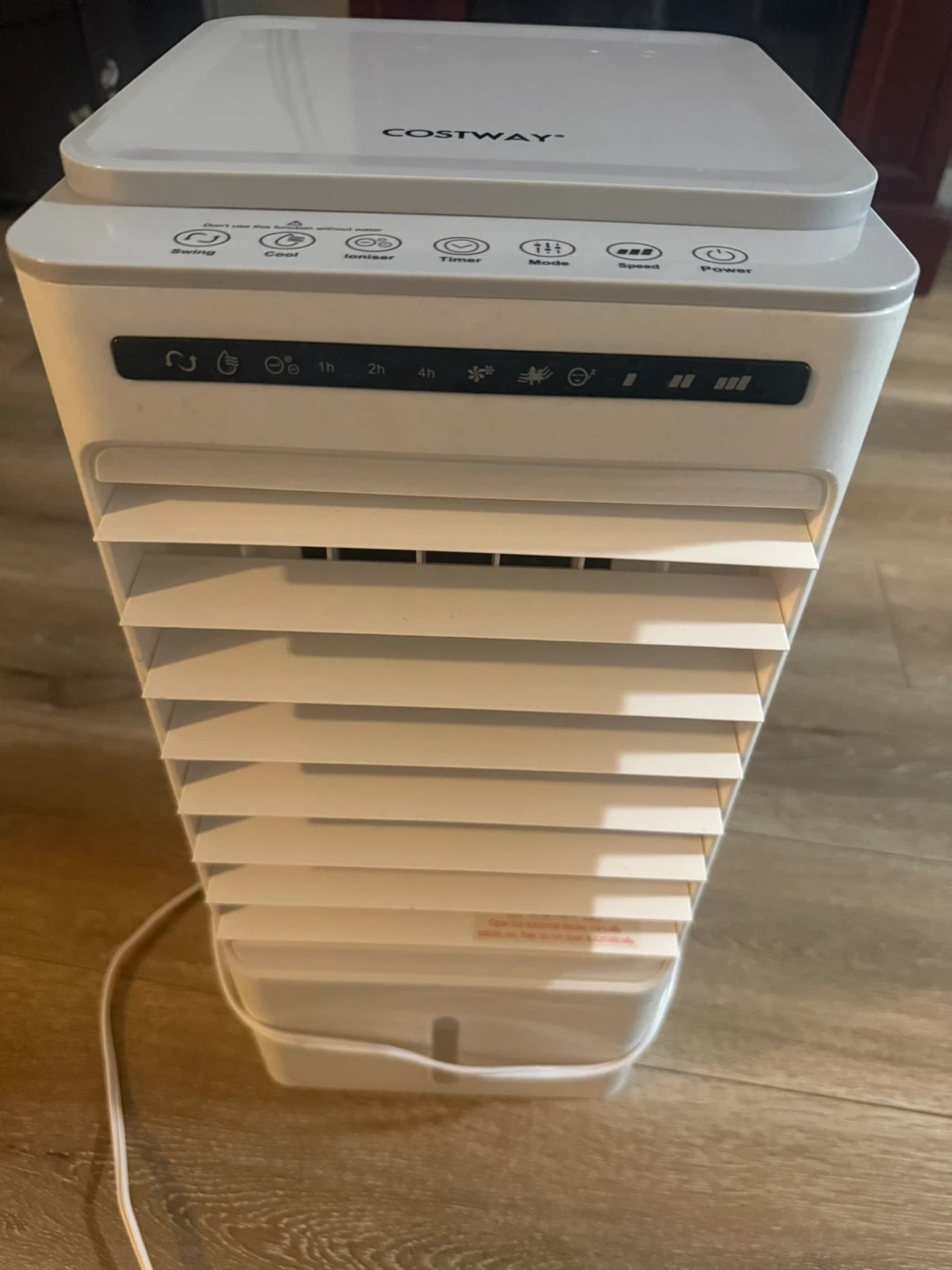 This Costway portable air cooler offers swing, cool, ioniser, timer, mode, and speed functions. It's white and comes with a power cord. Use it to beat the heat!