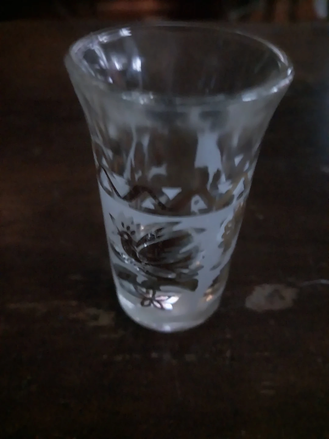 This clear glass shot glass features a frosted and gold-tone design of birds and floral patterns. It's a unique piece for your barware collection. Perfect for a single shot or as a small decorative item!