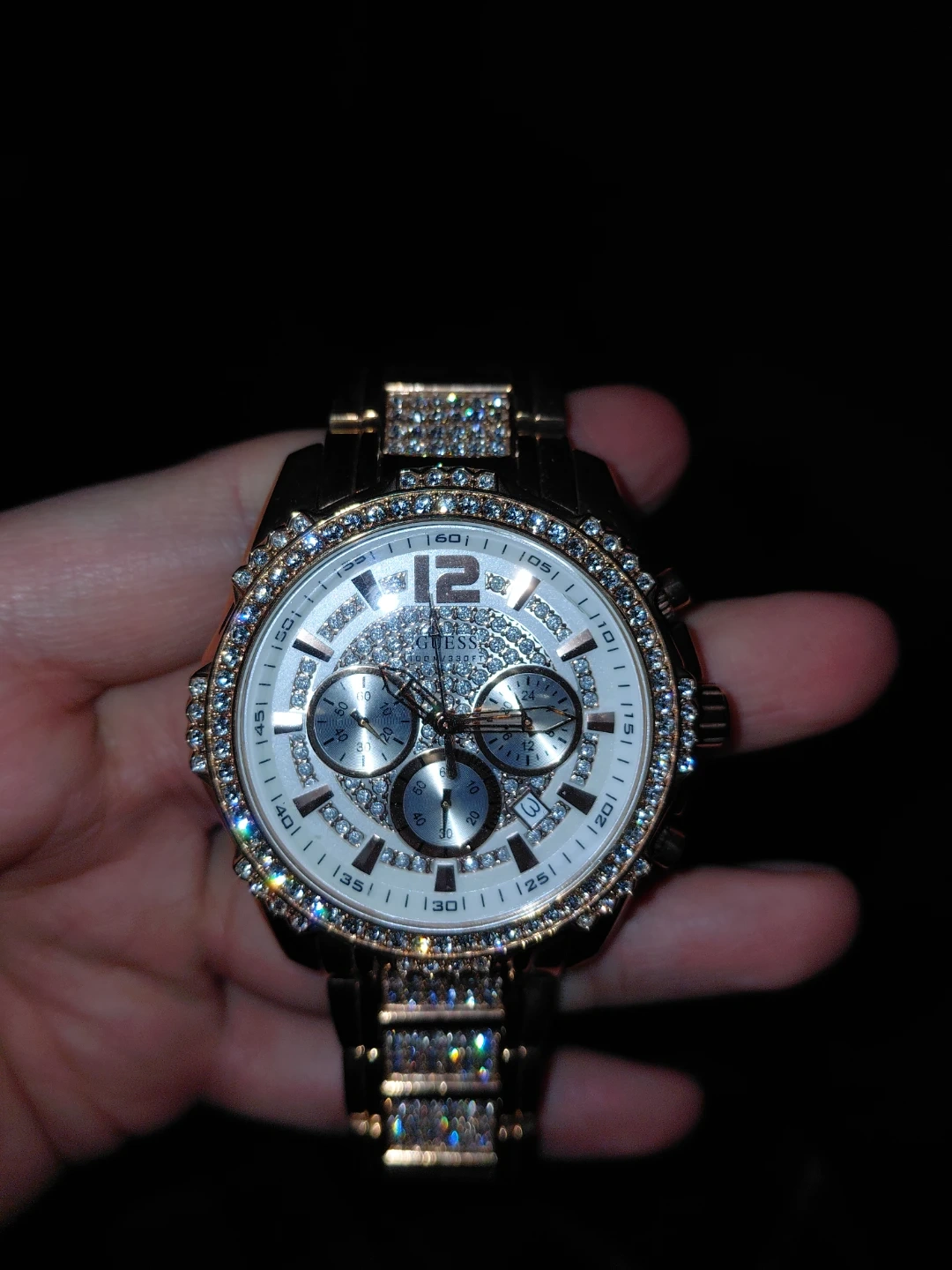 GUESS W0291G2 (crystal-accented gold-tone quartz multifunction)