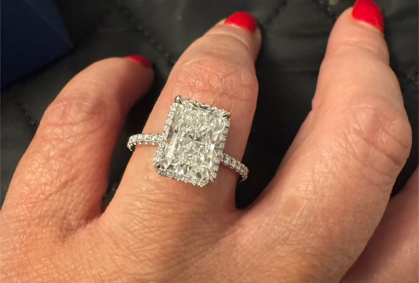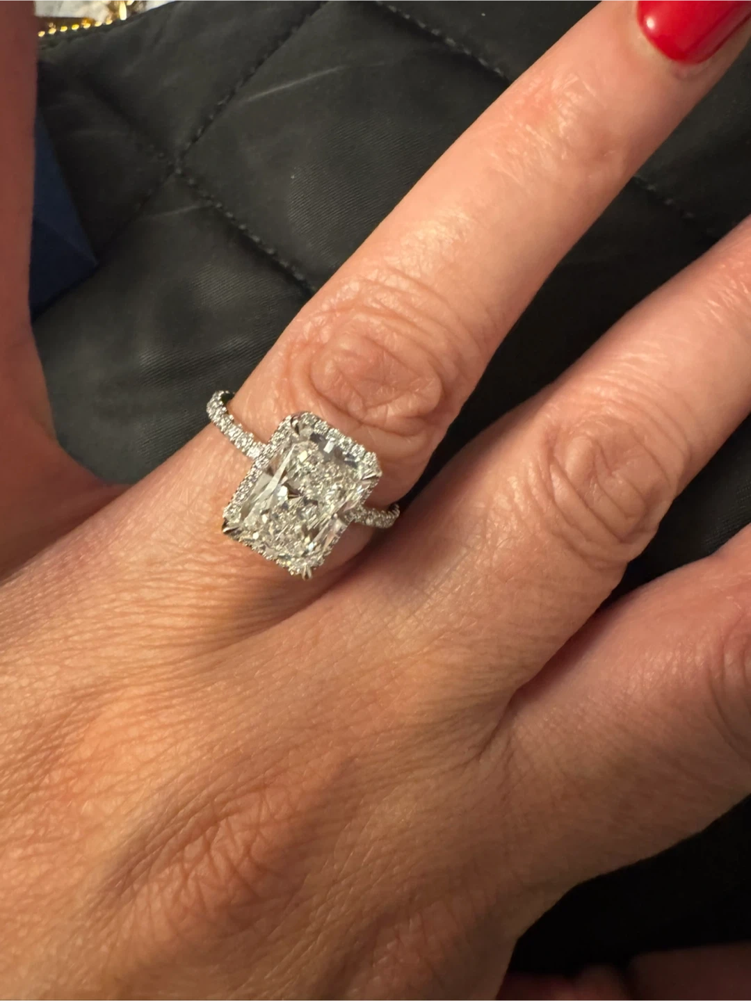 Beautiful radiant cut diamond engagement ring with a halo setting. It's a lab-grown diamond solitaire wedding ring. Set in 14k white gold, it's 4.5 total carats.
