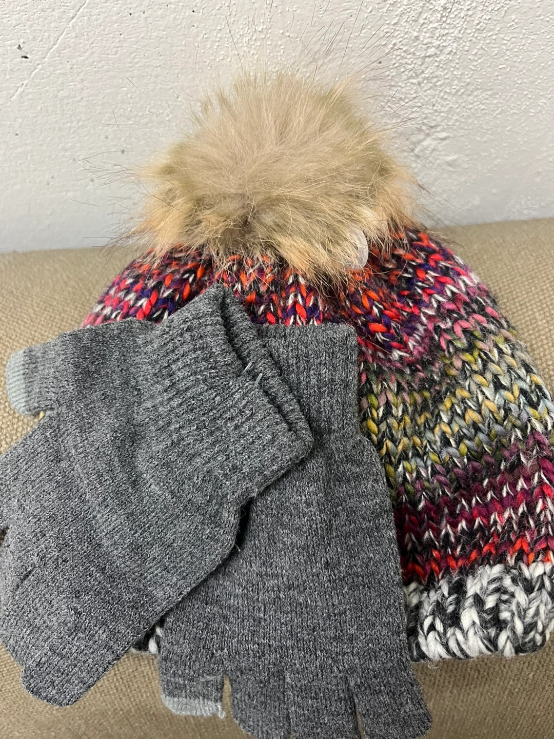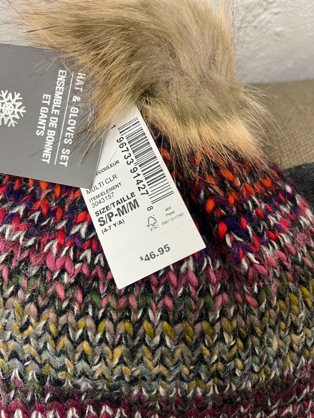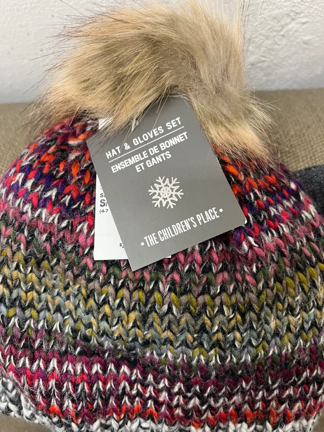 This is a knit hat and gloves set from The Children's Place. The set includes a multicolour knit hat with a faux fur pompom and a pair of grey knit gloves. It's sized S/P-M/M (4-7 Y/A).