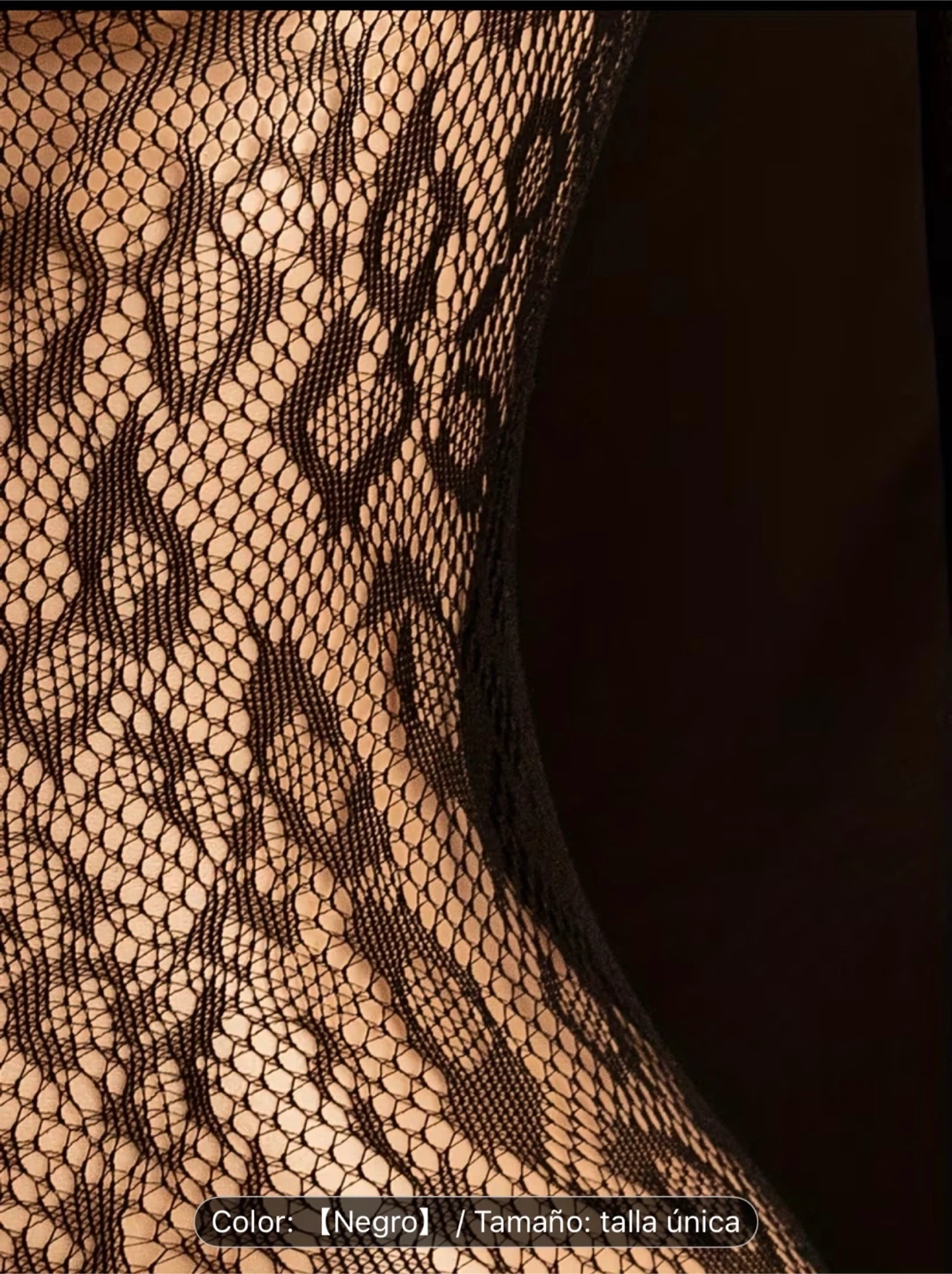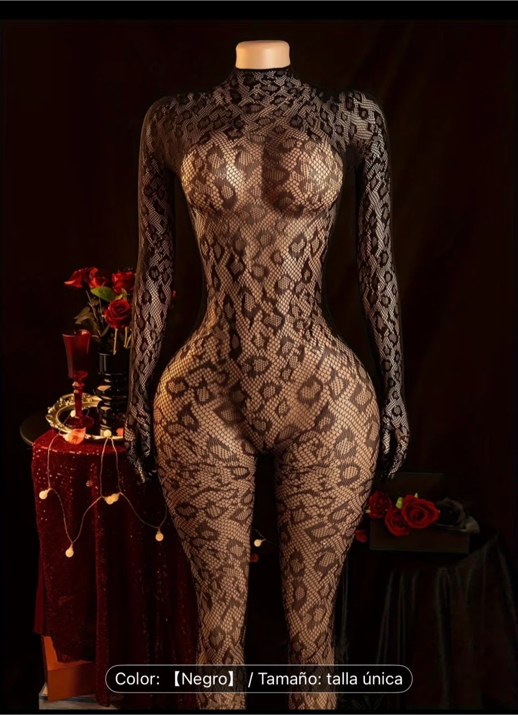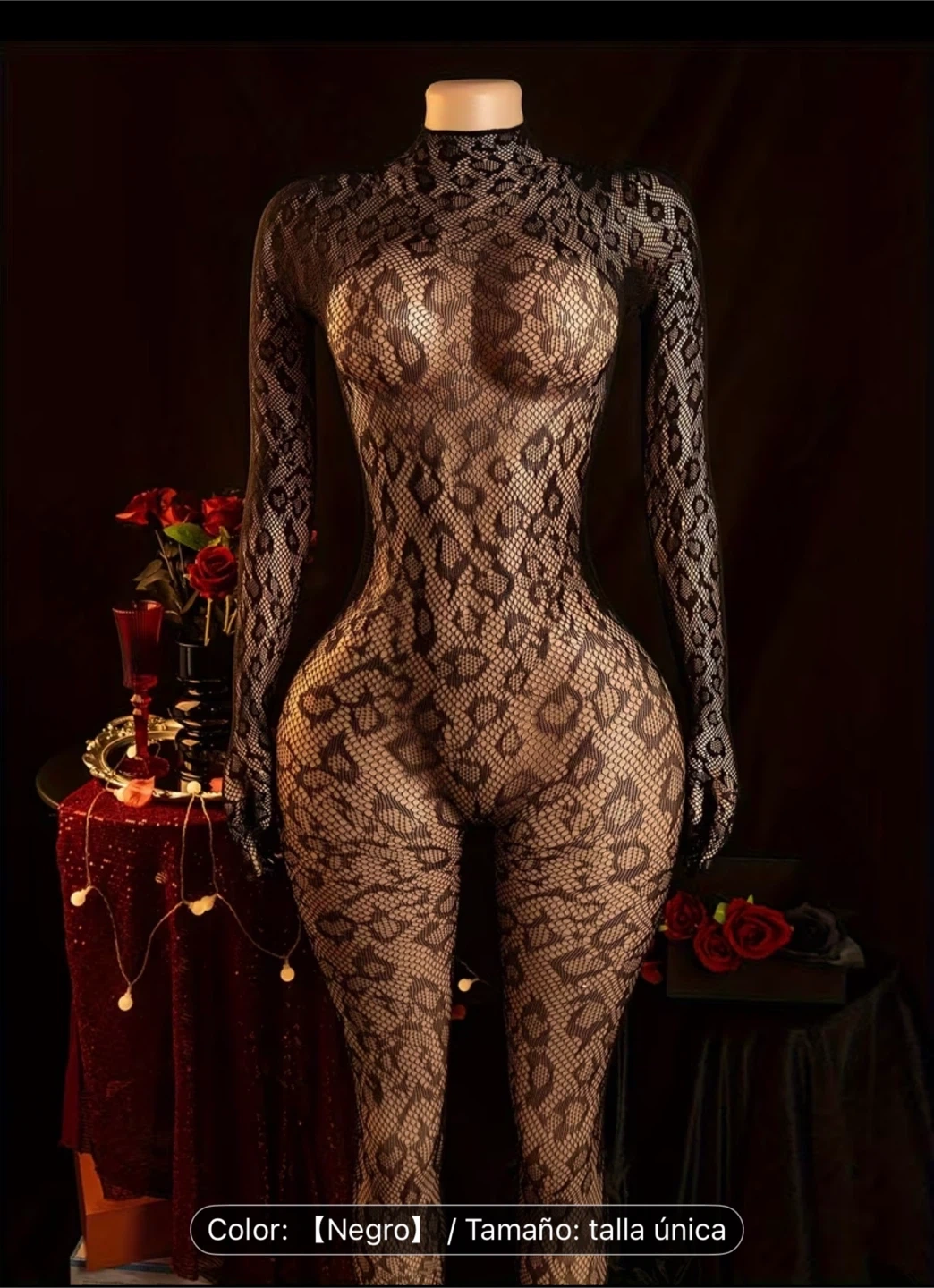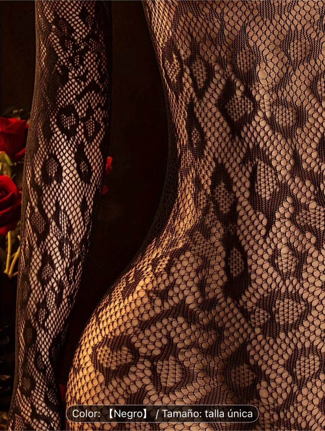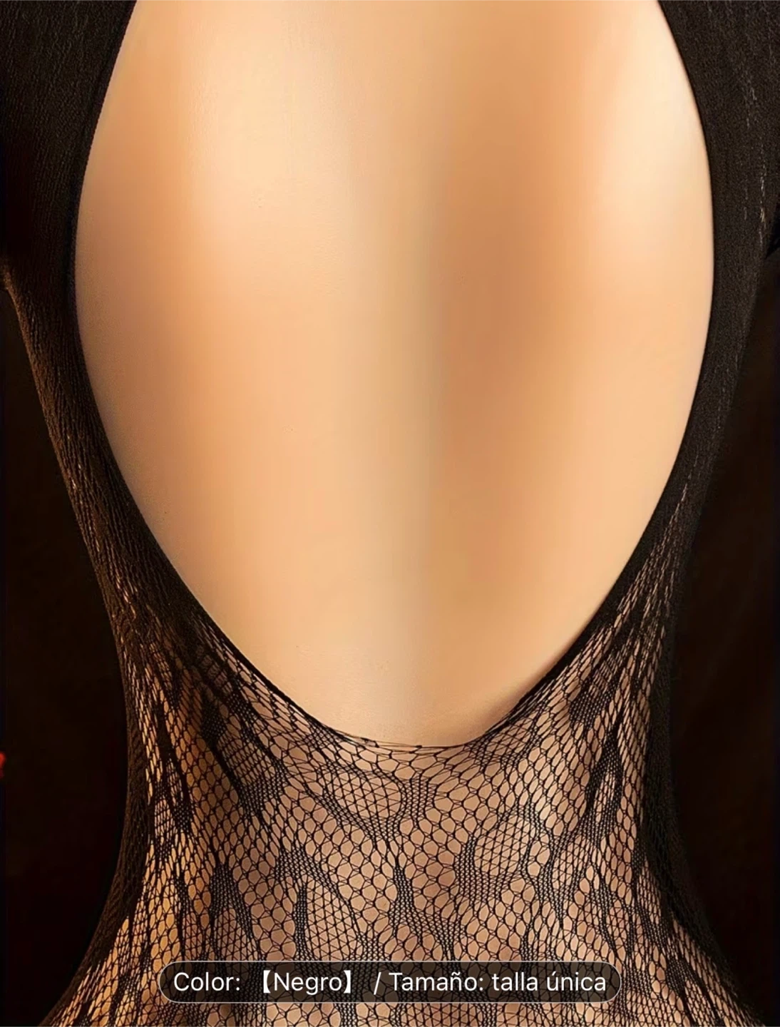 This black lace bodysuit features a full-body design with long sleeves and a high neckline. It has a snake-like pattern all over. The back has a large, open cutout. It's a one-size-fits-most item.