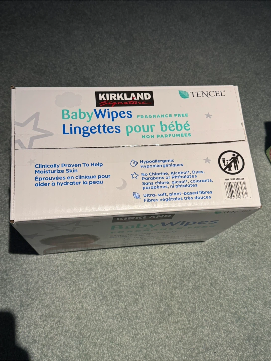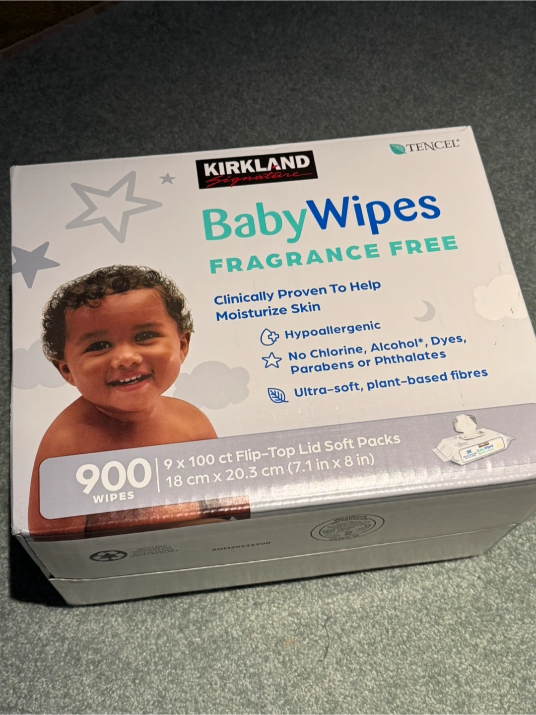 Kirkland Signature Baby Wipes, fragrance-free. Clinically proven to help moisturize skin. Hypoallergenic, and made with ultra-soft, plant-based fibres. Each pack contains 100 soft wipes.