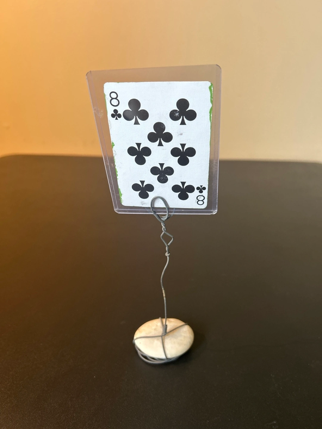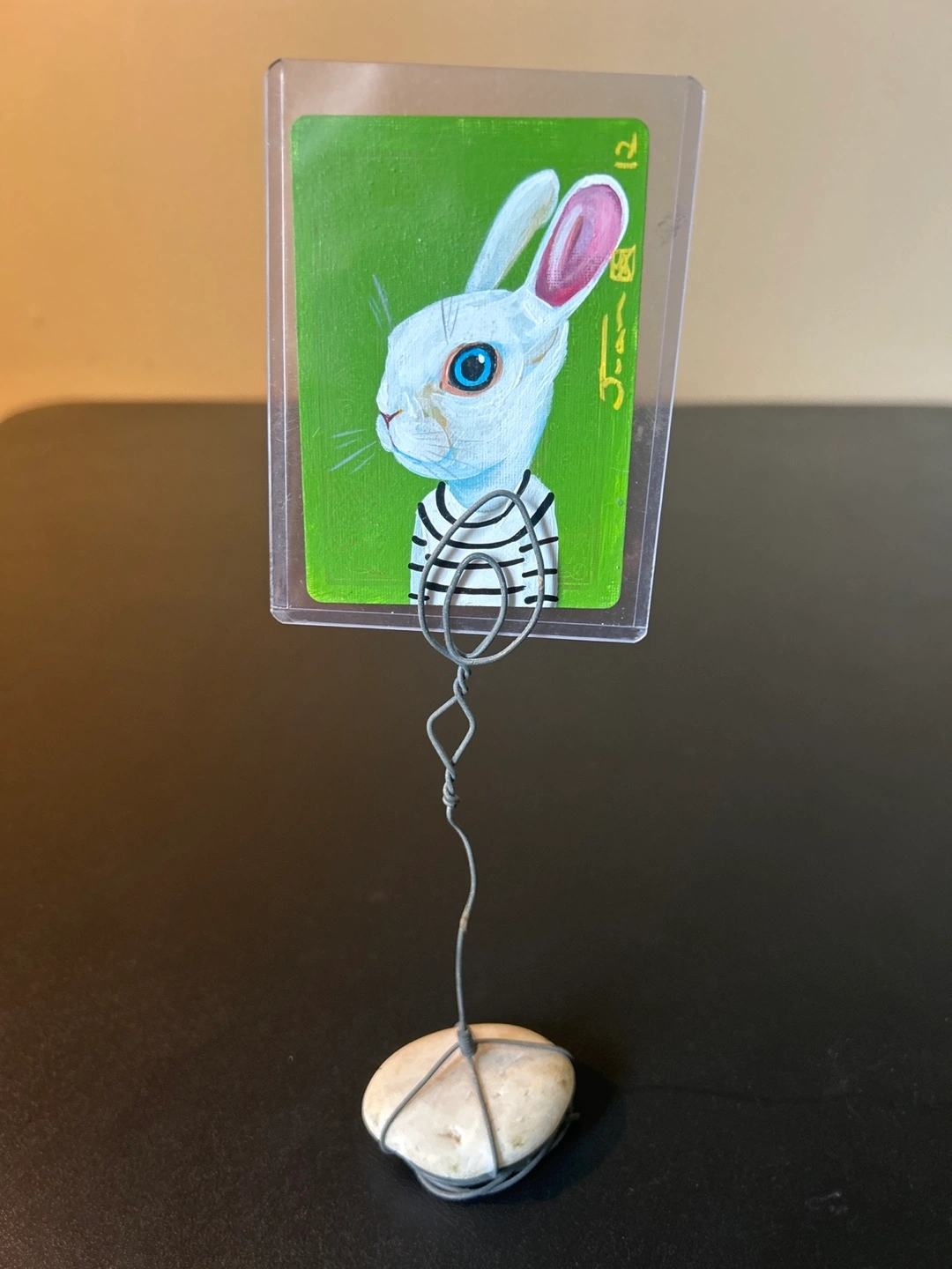 Adorable hand-painted playing card art. Features a cute bunny. Unique and charming piece. Perfect for adding personality to any space. Wire stand included.
