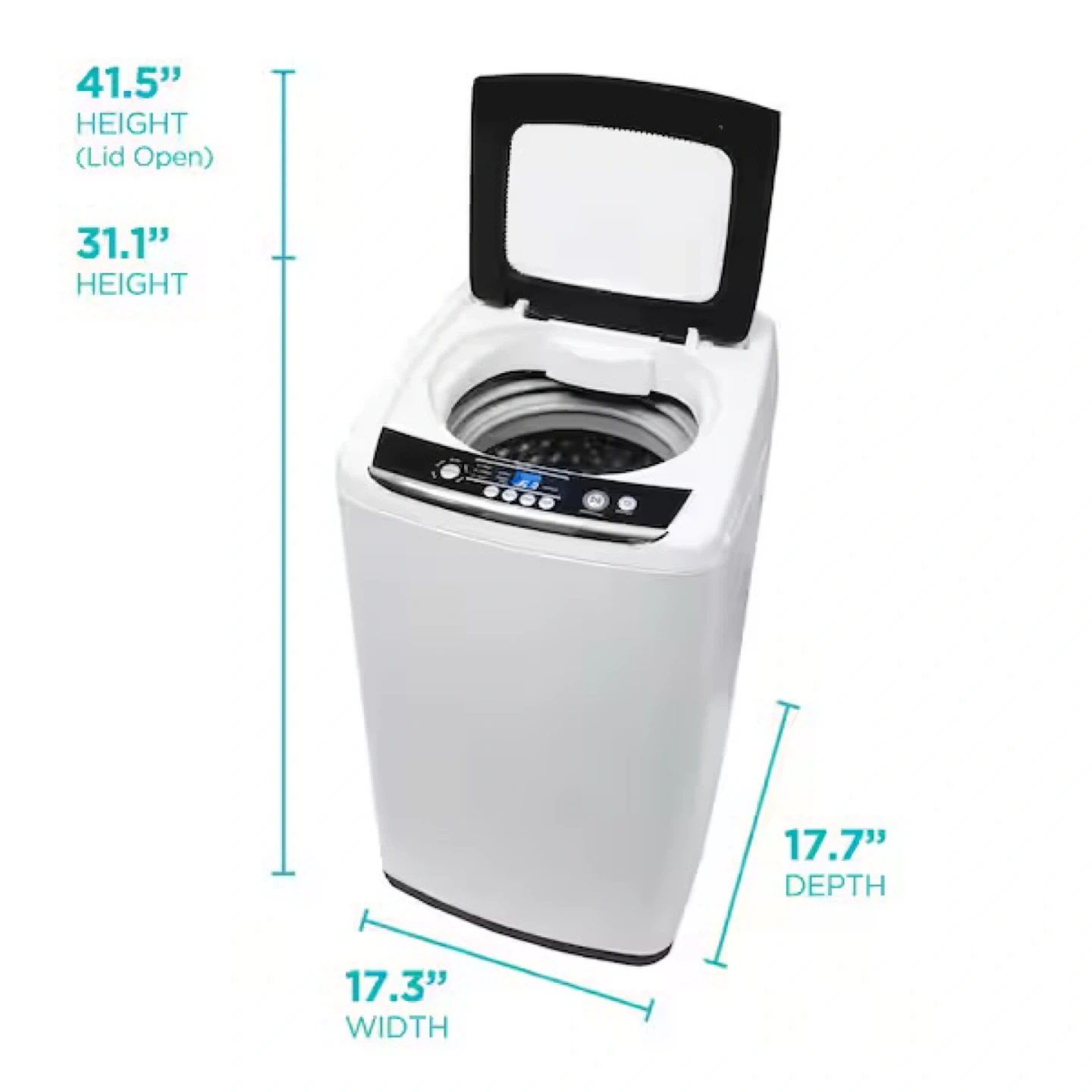 This is a BLACK+DECKER portable washing machine, model BPWM09W. It measures 17.3" wide, 17.7" deep, and 31.1" in height (41.5" with lid open). The control panel offers load size, wash, rinse, and spin options.