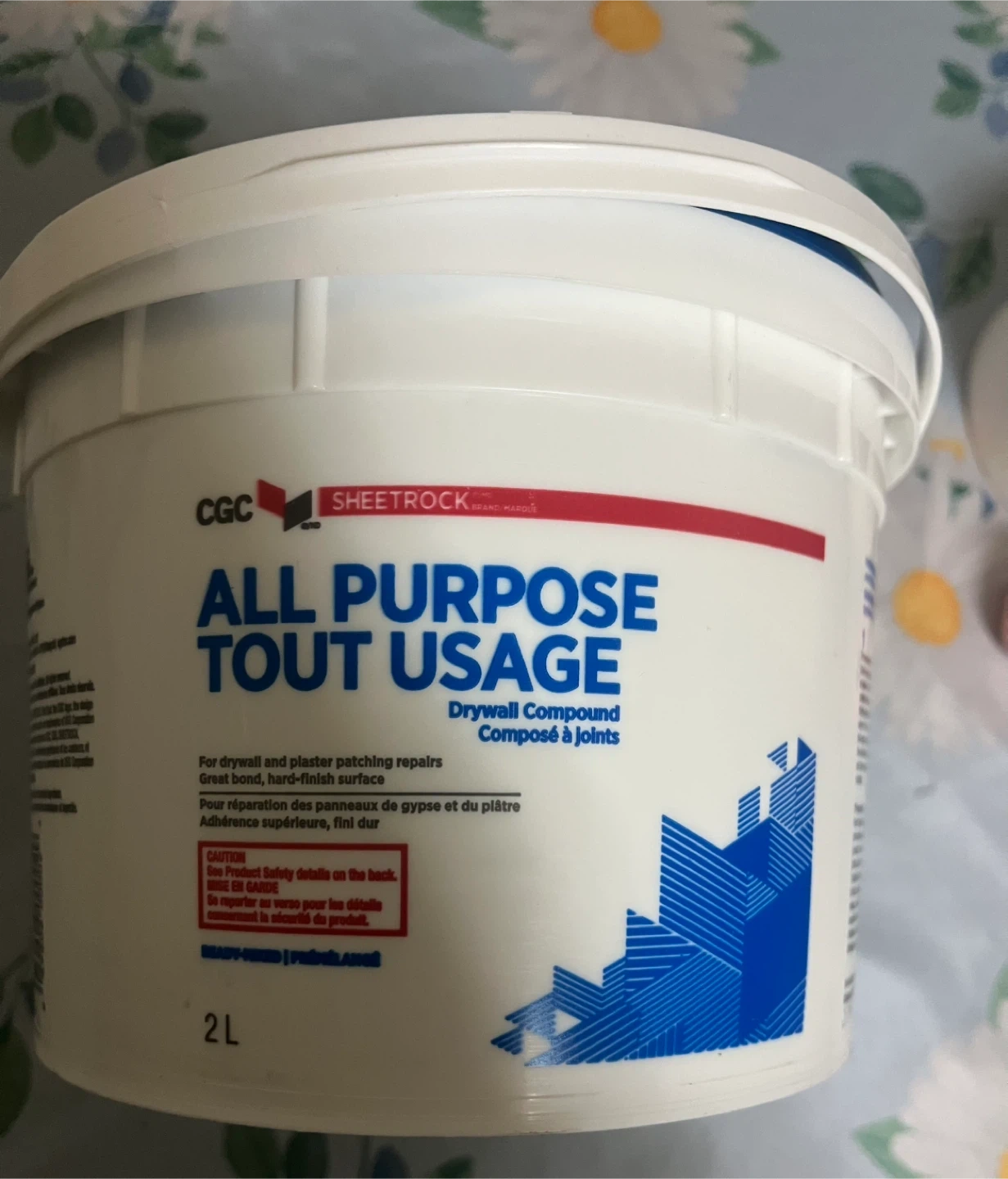 This is a 2-litre pail of CGC Sheetrock All Purpose Drywall Compound. It's designed for drywall and plaster patching repairs. It provides a great bond and a hard-finish surface.