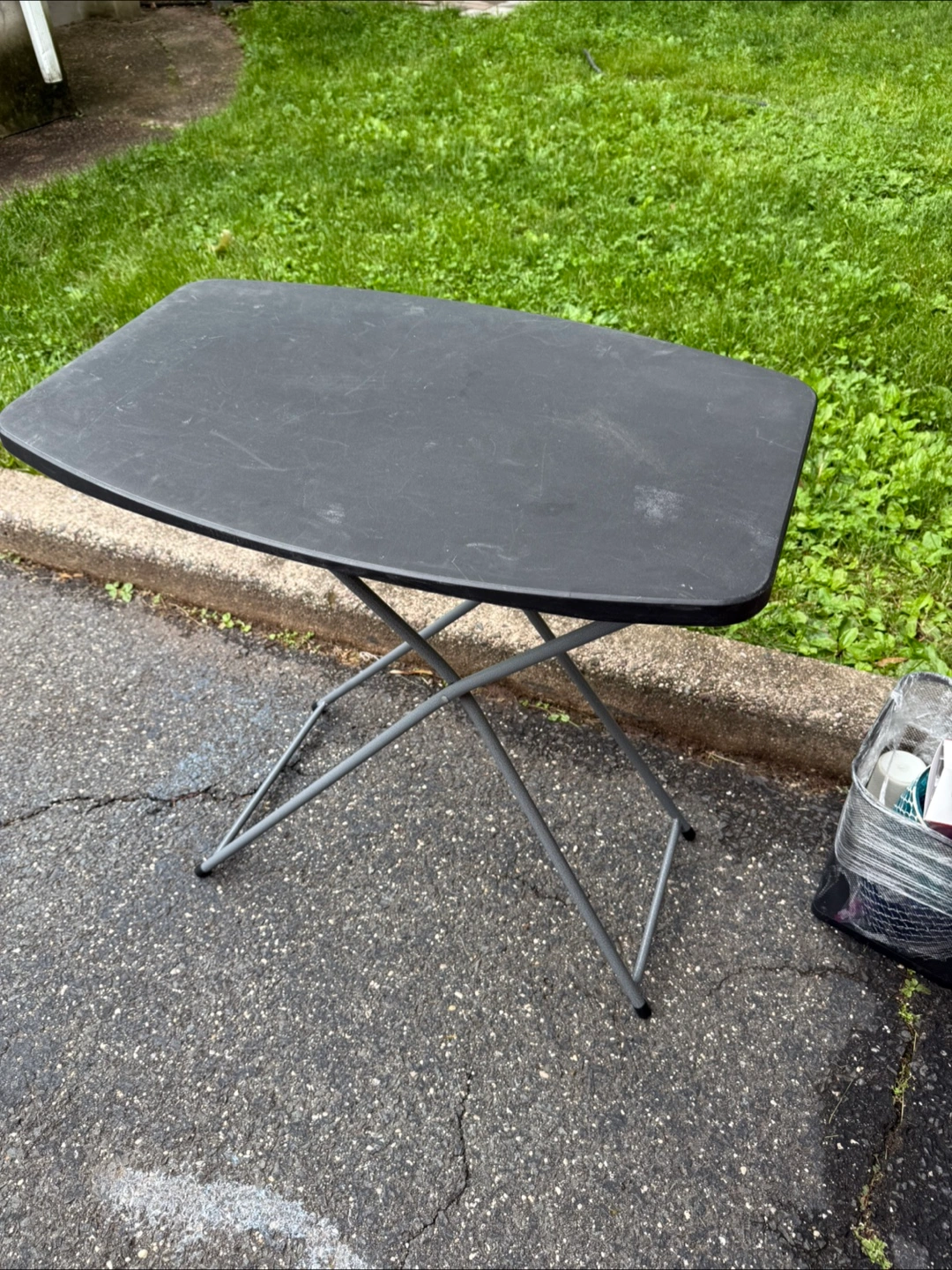 Rectangular table with a dark surface. Features a folding metal frame. The table is ready to provide a relaxing area for your next outdoor activity.