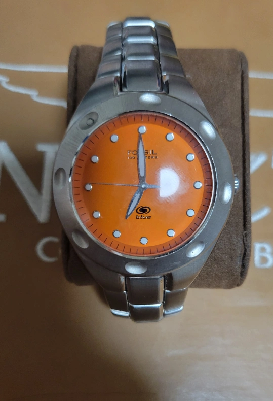 Selling a Fossil Blue 100 Meters watch! It has a cool orange face and a stainless steel band. It's in great condition and ready for a new wrist