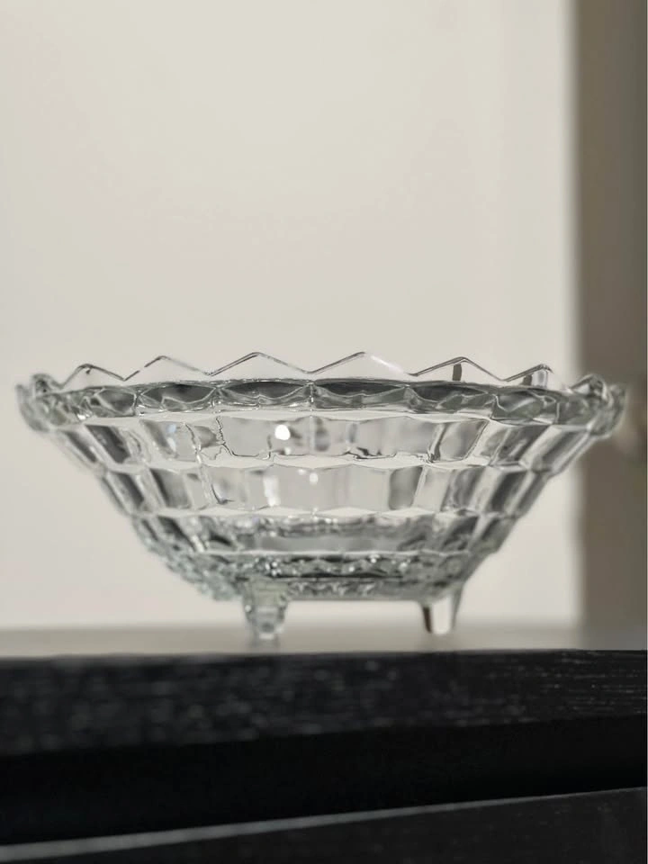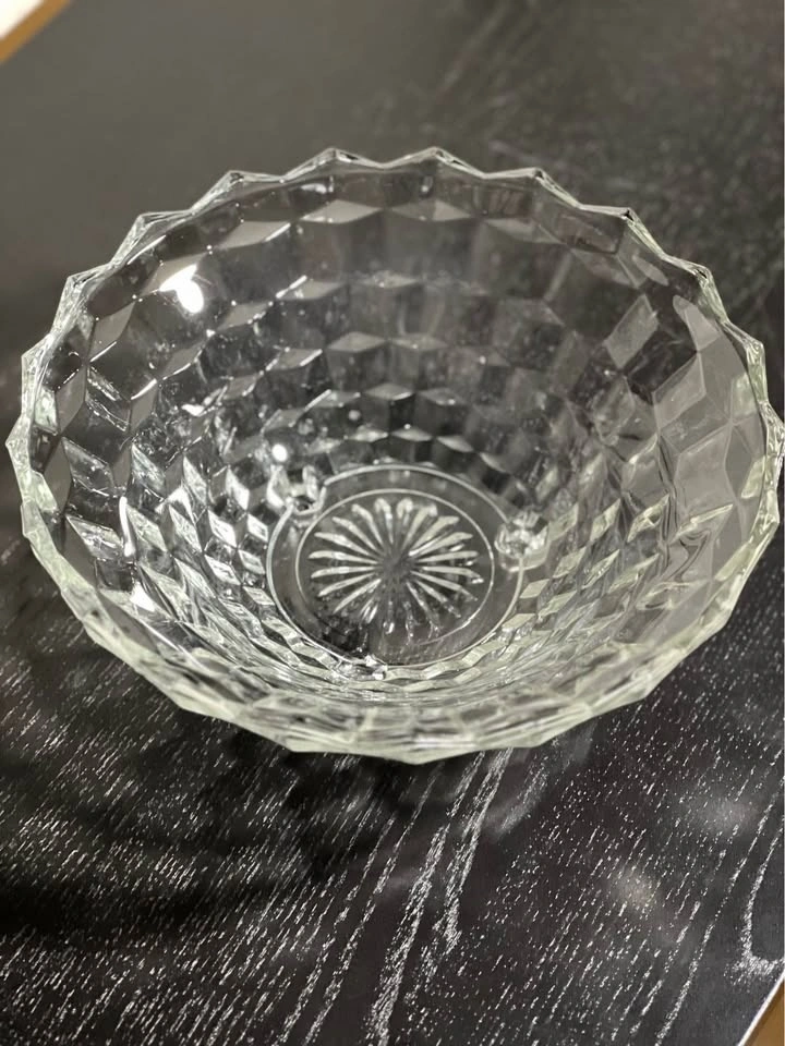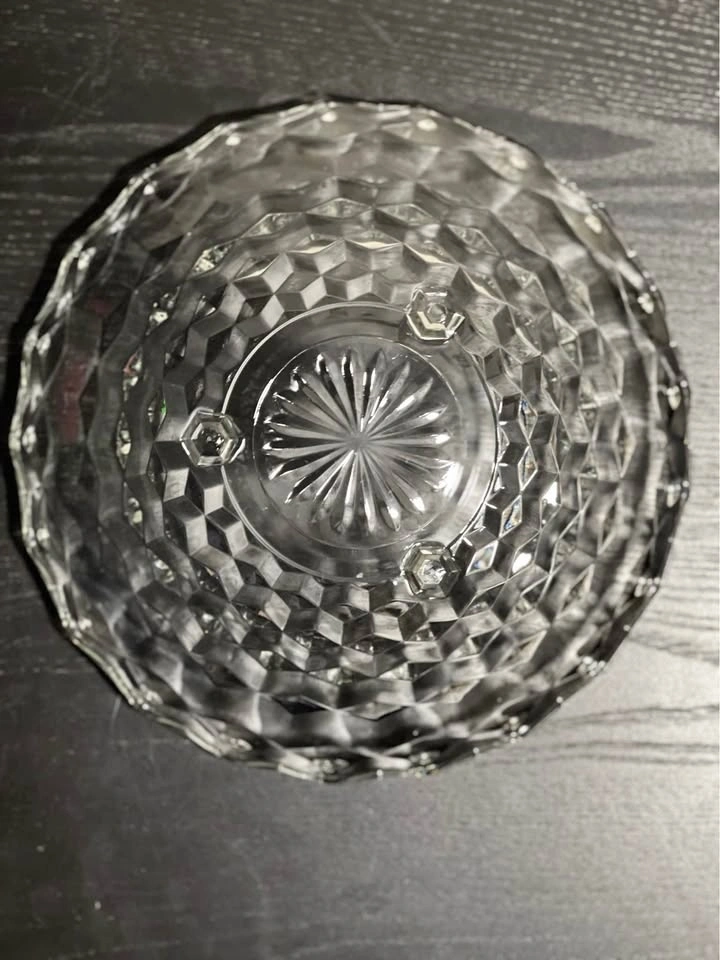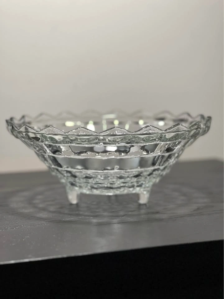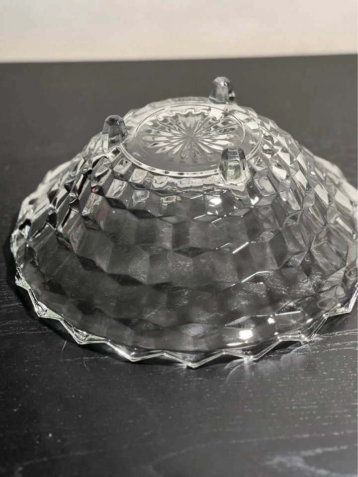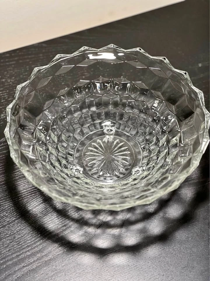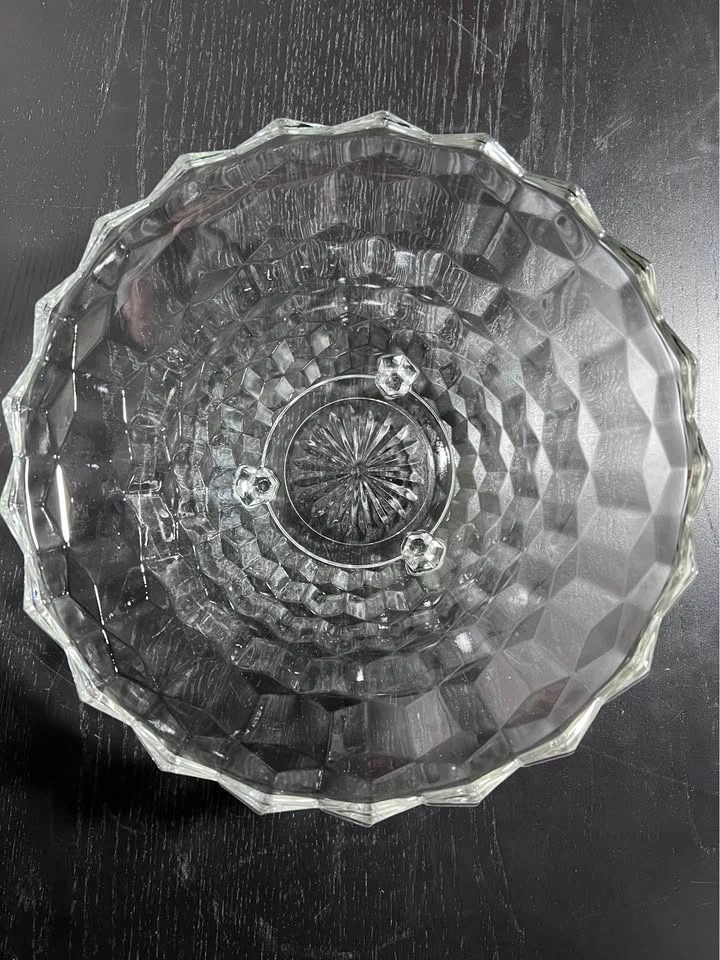 131This bowl is a vintage Fostoria American pattern clear glass serving bowl, often referred to by collectors with terms like "Cubist" or "Cube" design. It was a highly popular and long-produced line by the Fostoria Glass Company, which manufactured this pattern from 1915 until 1988. Manufacturer: Fostoria Glass Company Pattern Name: "American" (also known as the "Ice Cube Pattern" nickname) Material: Clear pressed glass, not cut glass (pressed glass edges are slightly rounded, while cut glass edges are sharp) Design: Features a distinctive geometric, cubist pattern around the exterior and a starburst design in the center of the base, as visible in the image. Vintage Status: Pieces in this pattern are considered vintage, with production spanning much of the 20th century. Pre owned in good condition Pickup is 58th and 7th Ave in midtown Manhattan