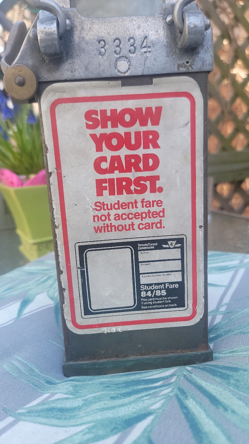 Vintage TTC token collector box. Numbered 3334. Features a small keyhole and a slot for tokens. Shows some wear consistent with age and use. Excellent conversation piece or collector's item.