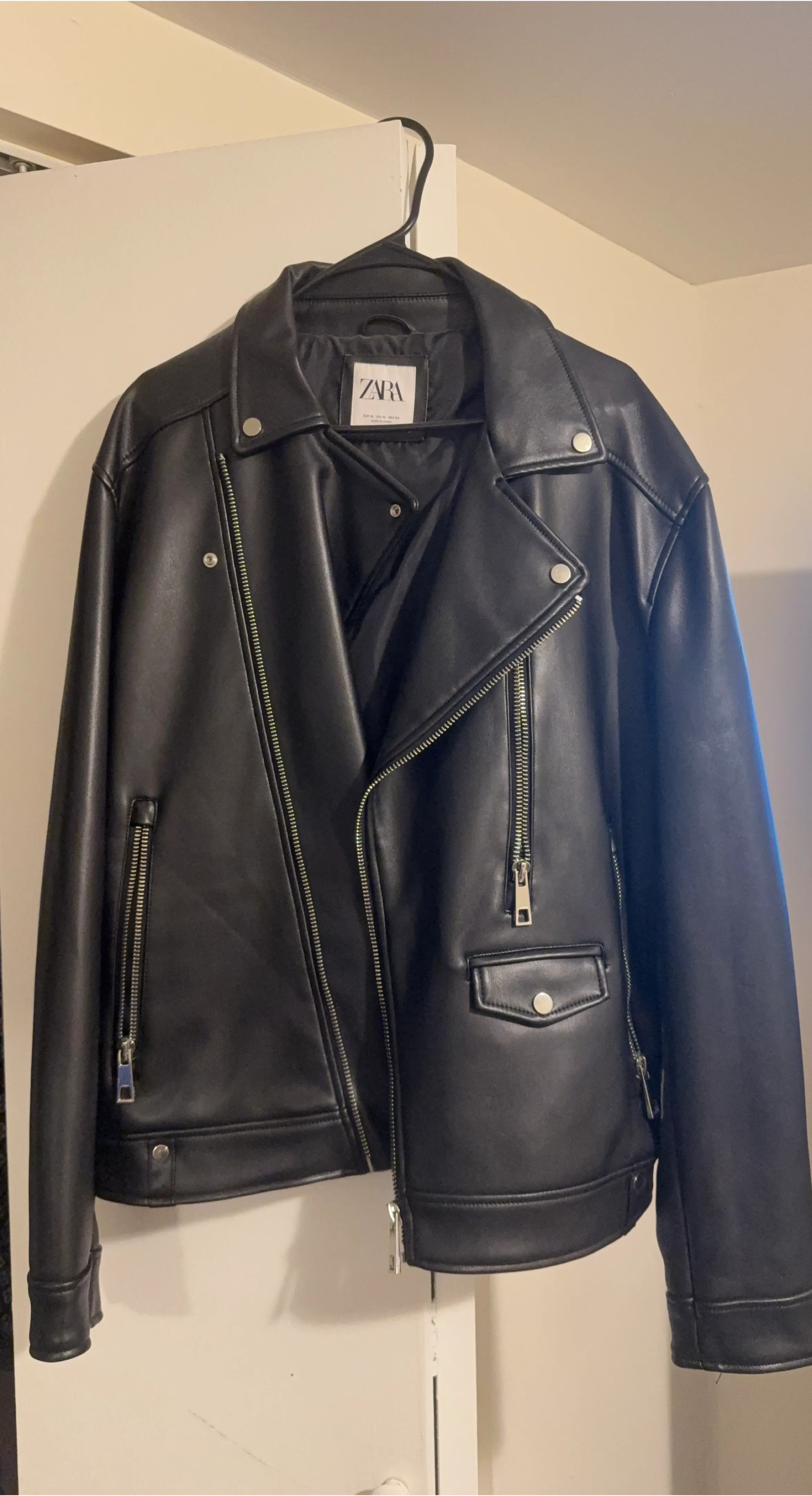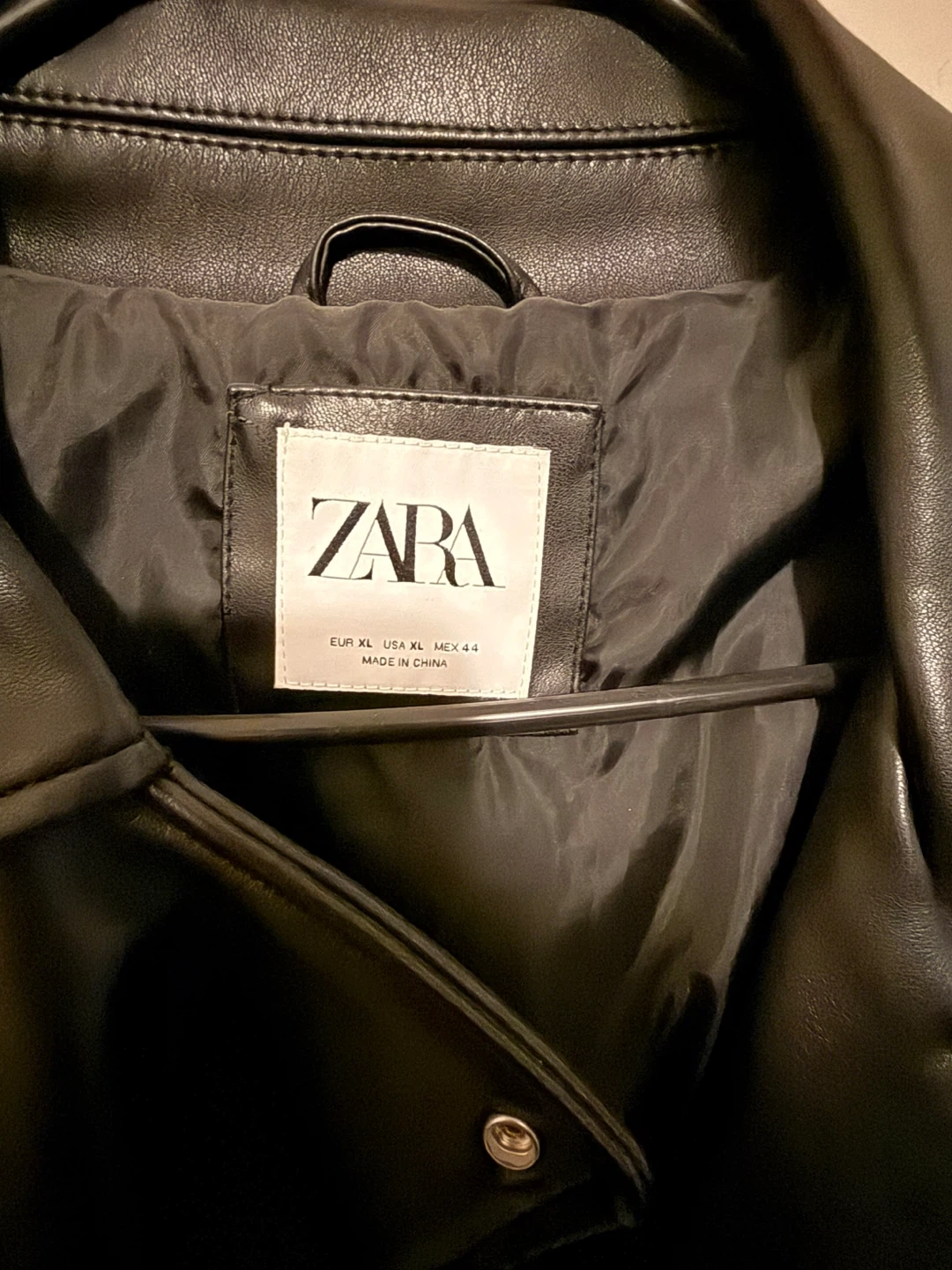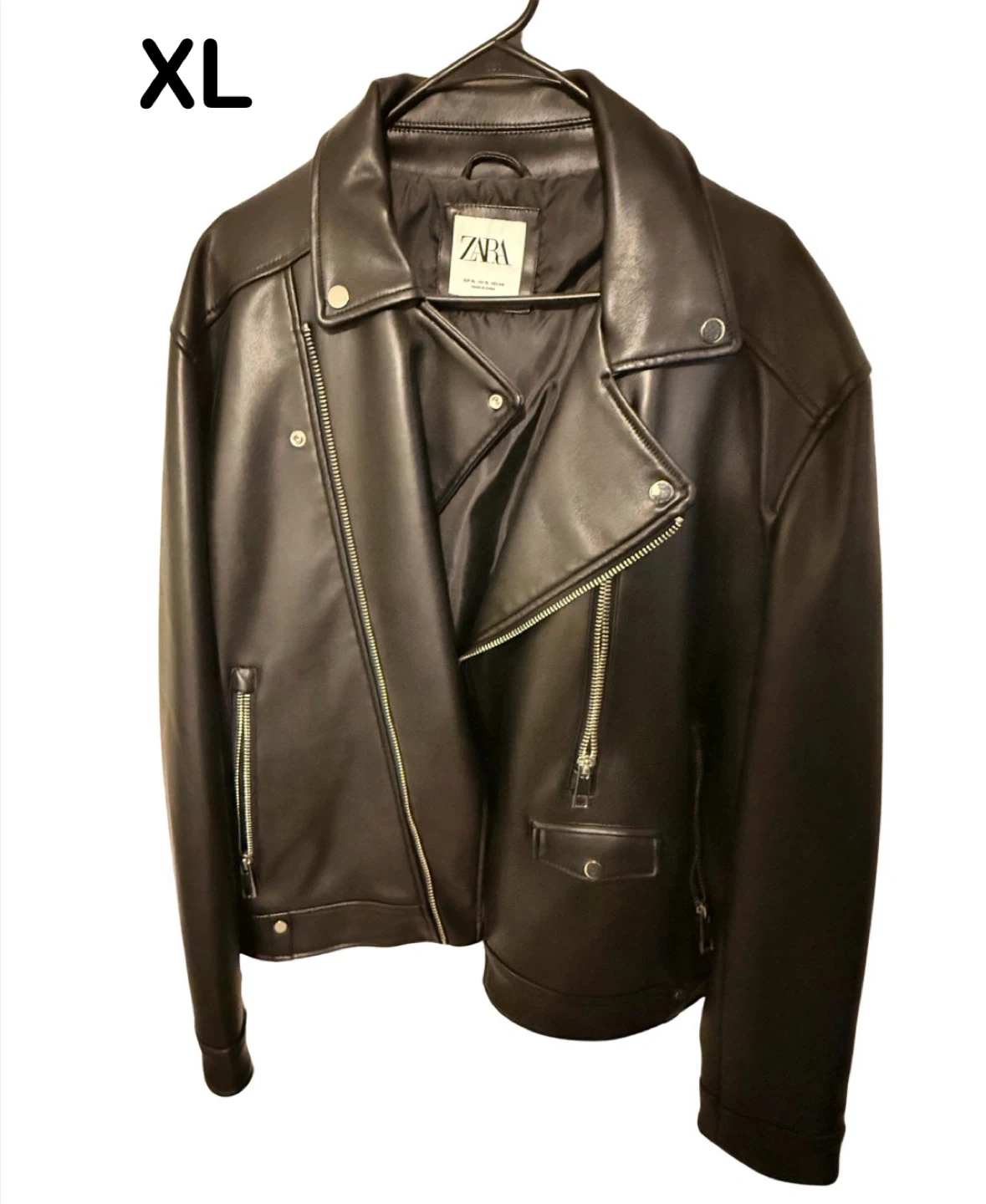 This is a black faux leather biker jacket from ZARA. It features a classic asymmetrical zip-up front and multiple zip pockets. The size is XL. It's a stylish outerwear piece.