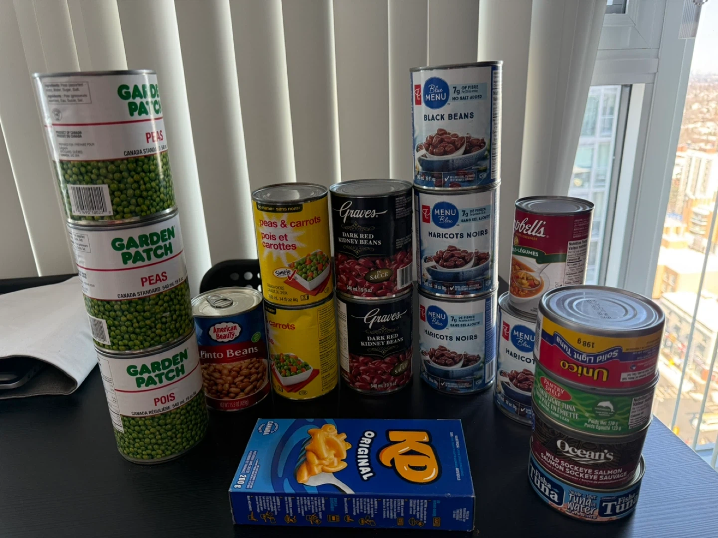 Collection of canned goods including peas, beans, tuna, salmon, and soup. Also includes a box of Kraft Dinner original mac and cheese. Items are from various brands like Garden Patch, Menu Blue, Graves, Campbell's, American Beauty, Unico, Ocean's, and Fish 'n Tuna.