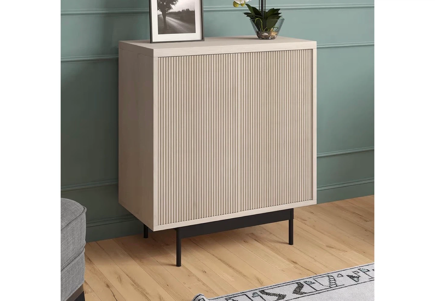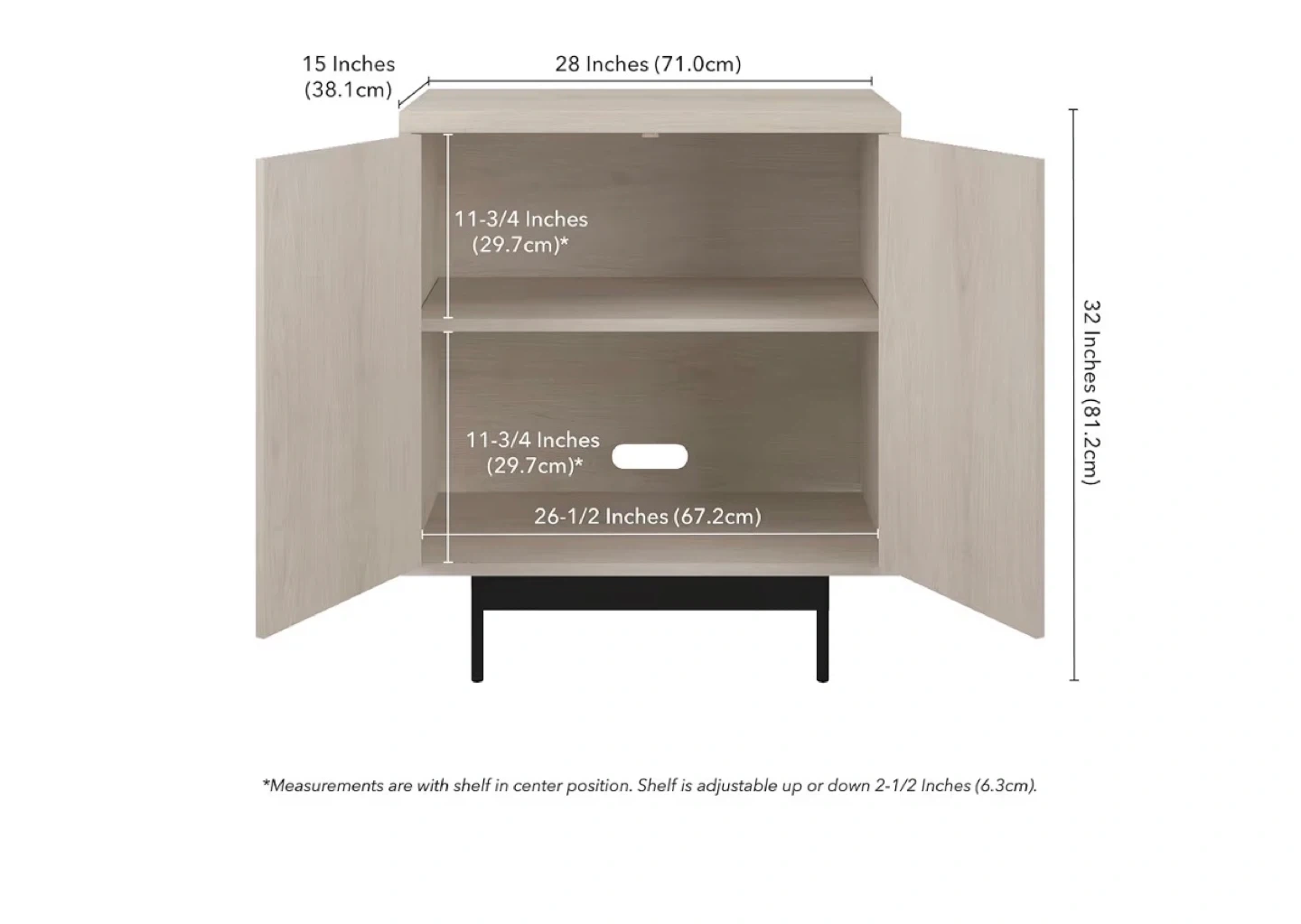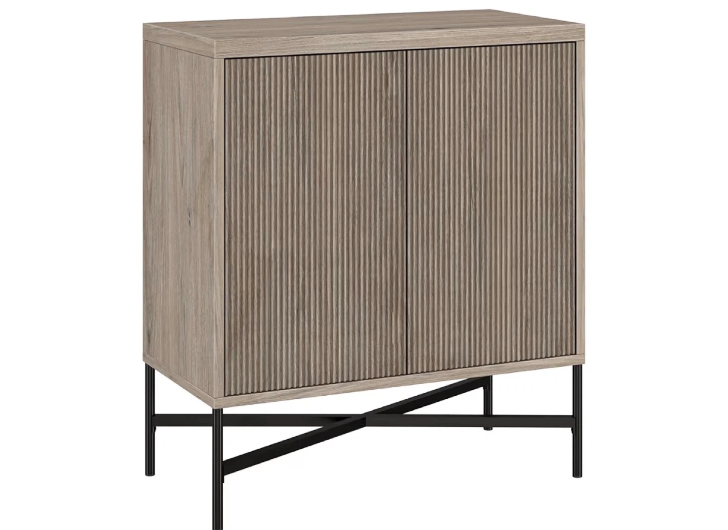 This cabinet features a light wood finish with distinctive ribbed doors and a black metal base. It has adjustable shelving inside for flexible storage. The overall dimensions are 28 inches wide, 15 inches deep, and 32 inches high.
