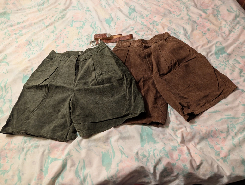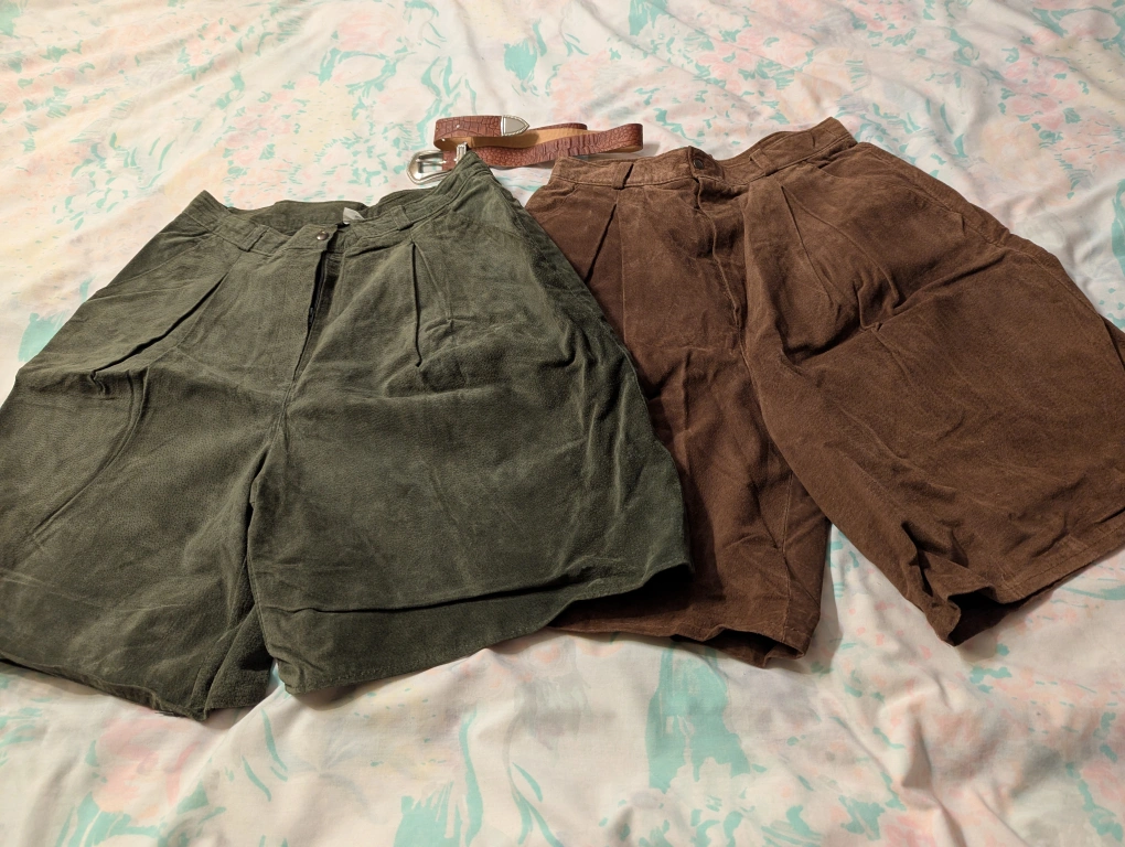 Two Pairs of vintage Giorgio Ferrini suede shorts. Brown and olive green.
