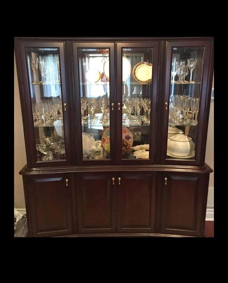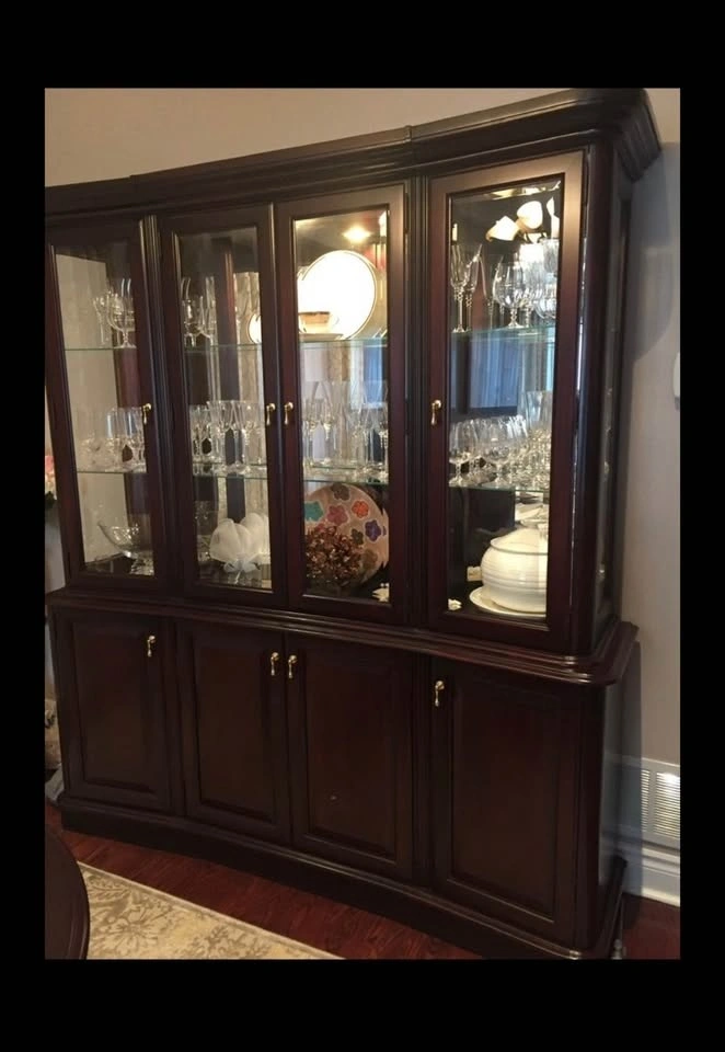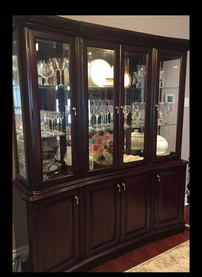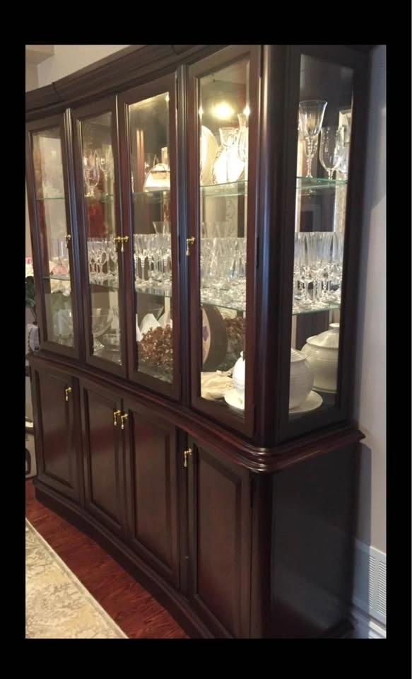 Stunning solid wood and glass cabinet in excellent condition. Features a functioning overhead light. The top hutch separates for easier moving. Dimensions: Height 79.5”, Depth 17.5”, Width 70”. Pick up only please. Contents not included.
