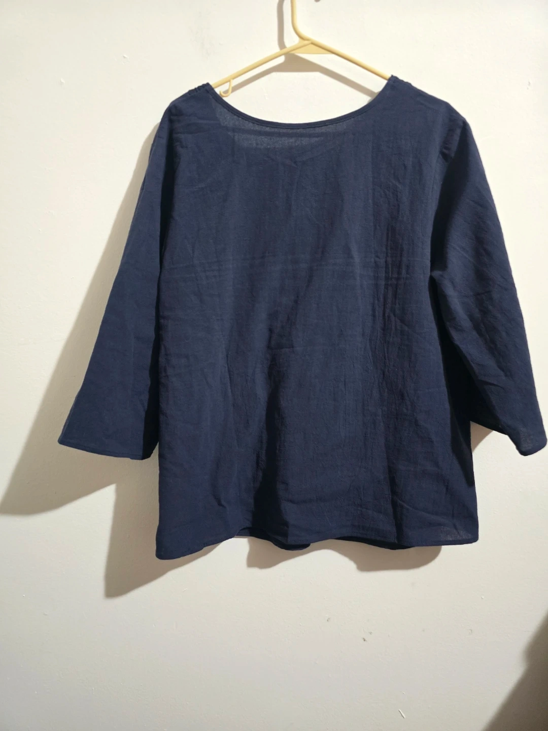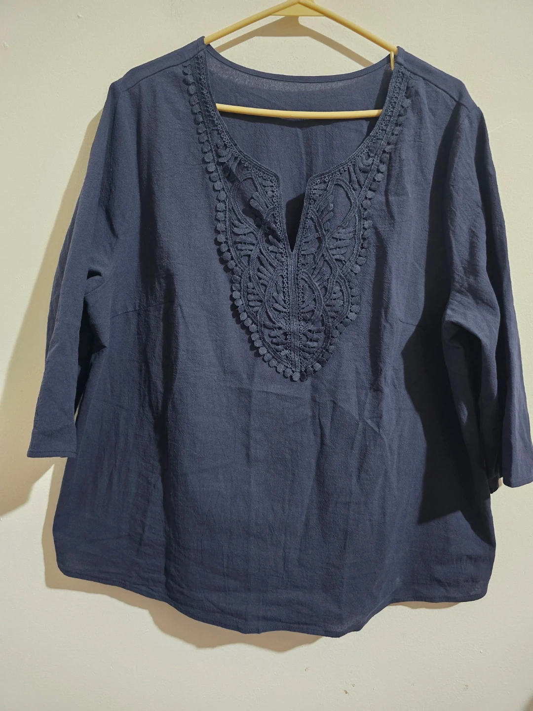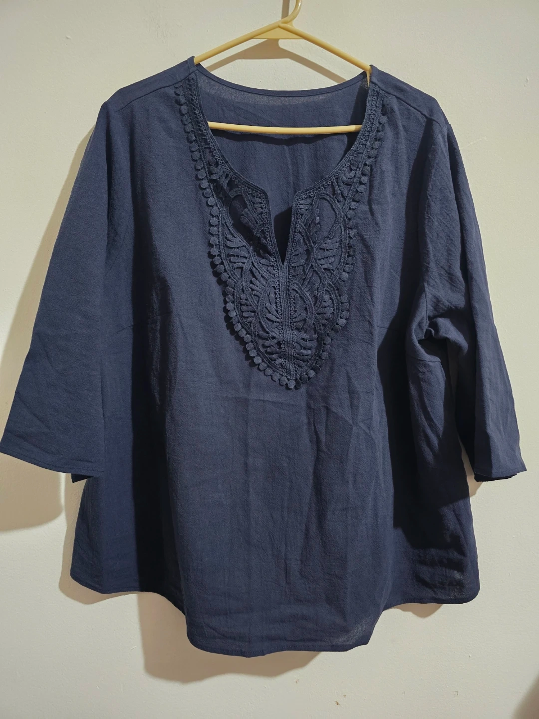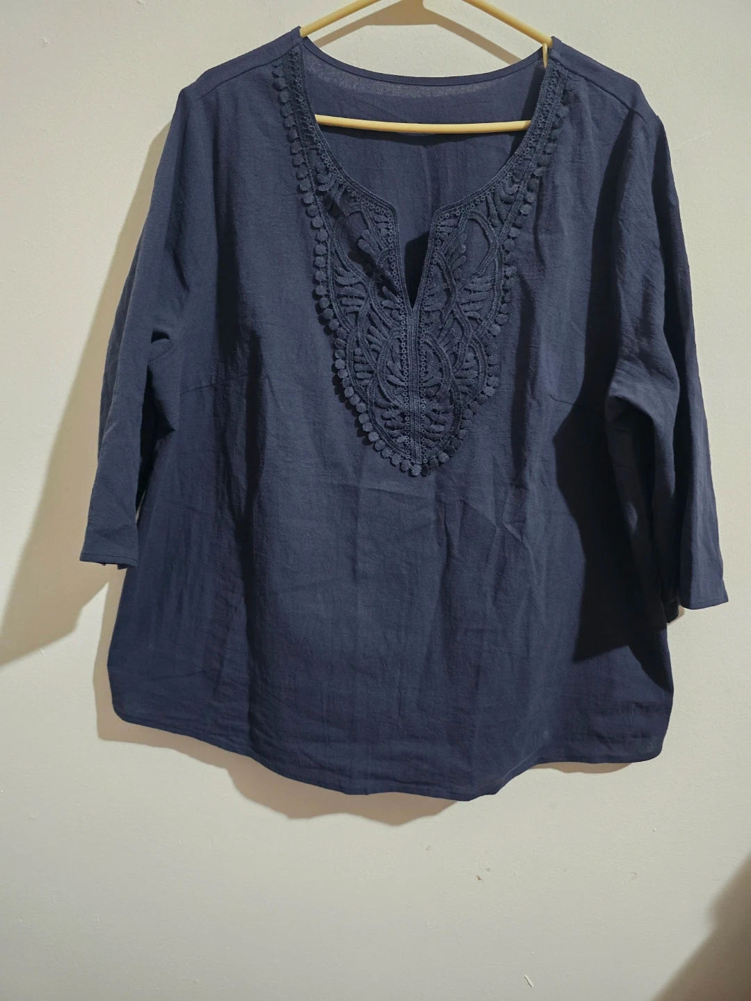 Add a touch of effortless style to your wardrobe with this beautiful navy blue top. Made from 100% Cotton, this blouse is lightweight, breathable, and perfect for year-round wear. It features a stunning embroidered design around the V-neckline and comfortable 3/4 sleeves.