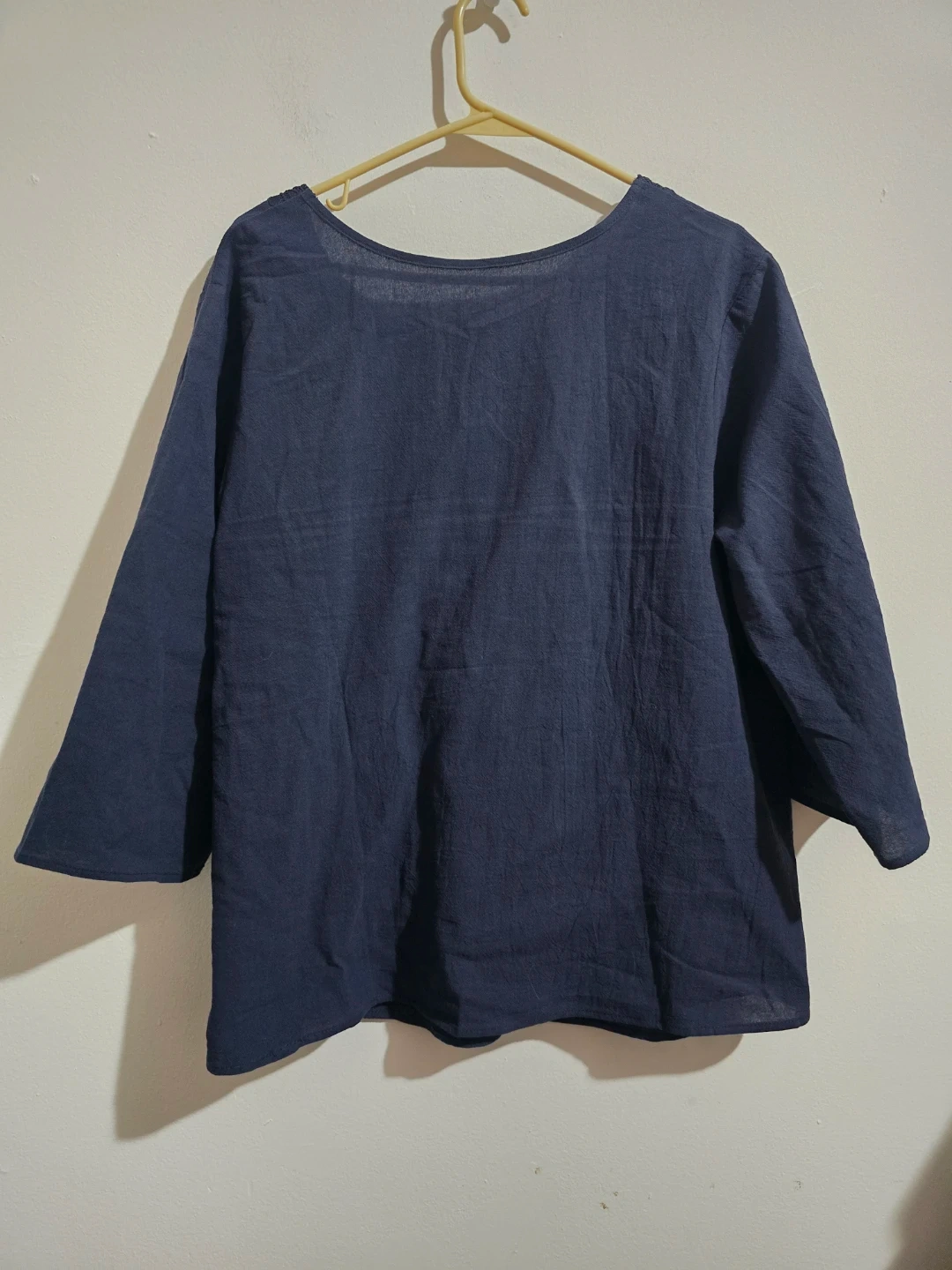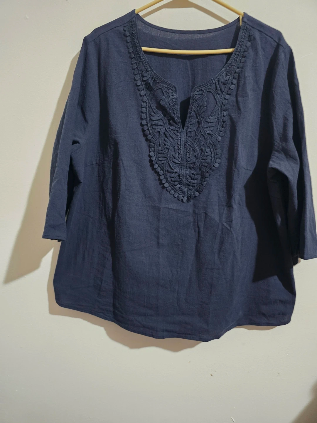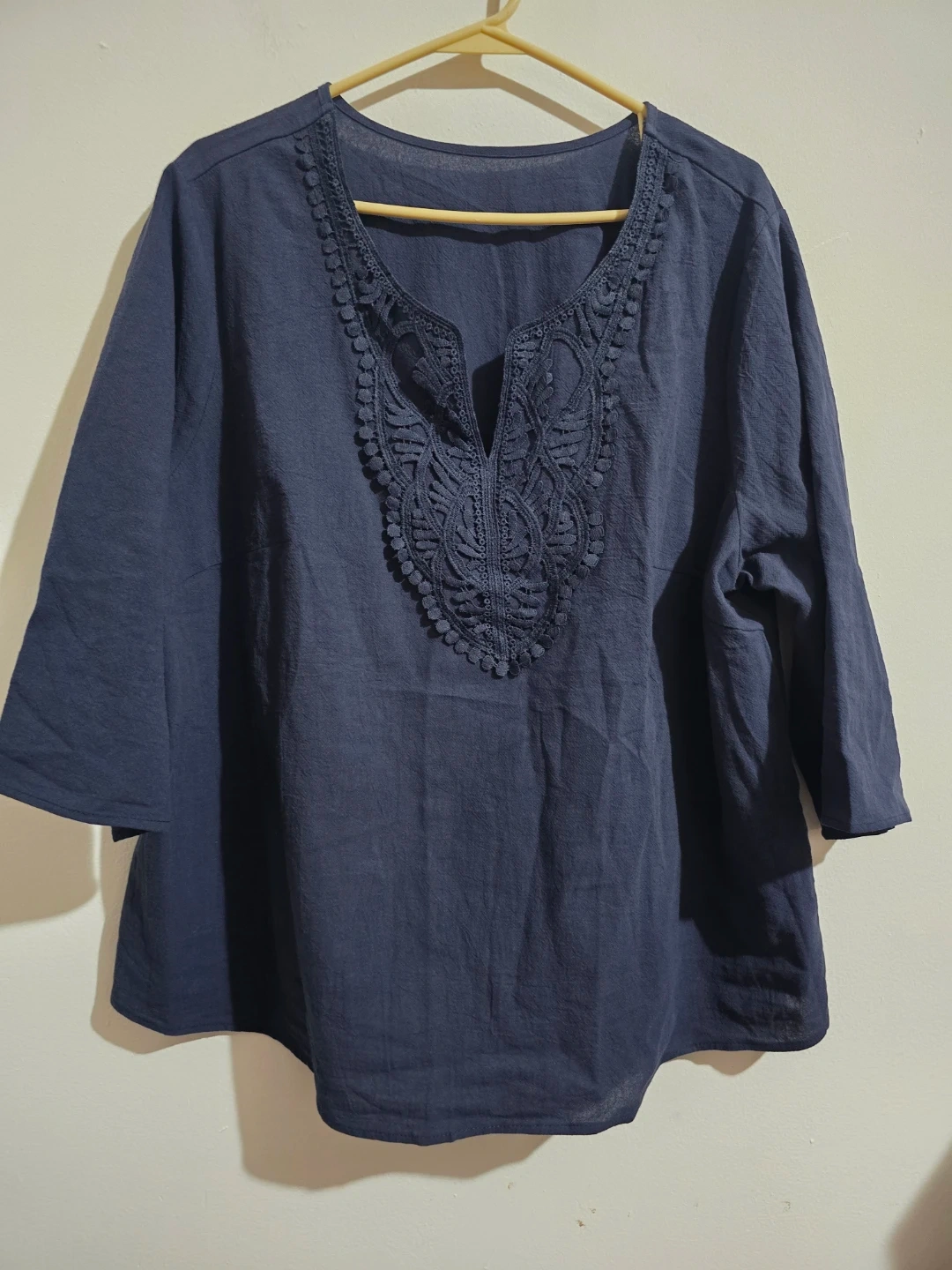 Boho Navy Blue V-Neck Top with Embroidery Detail - Size 1XL -