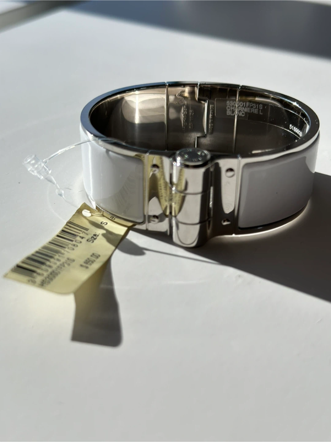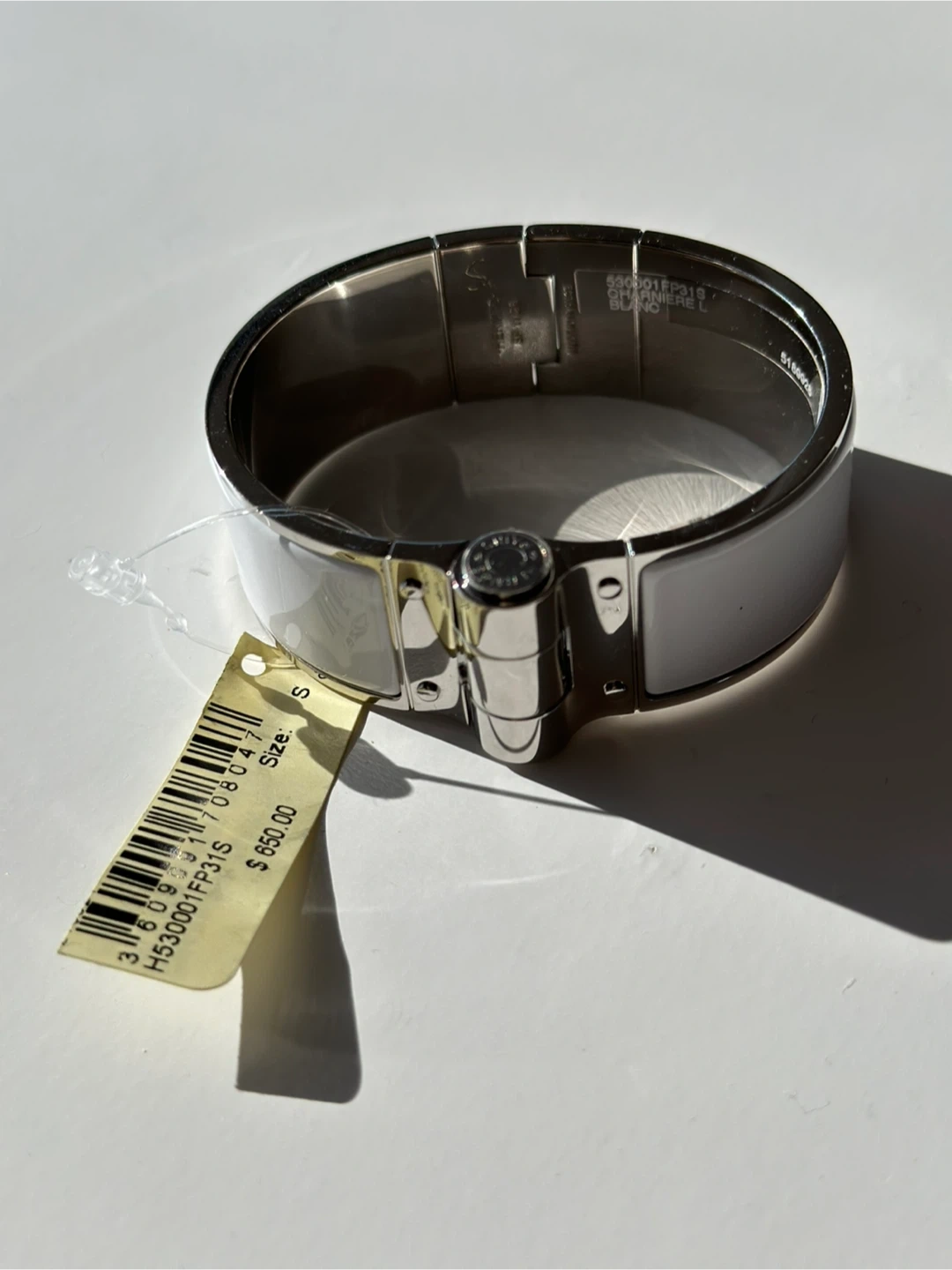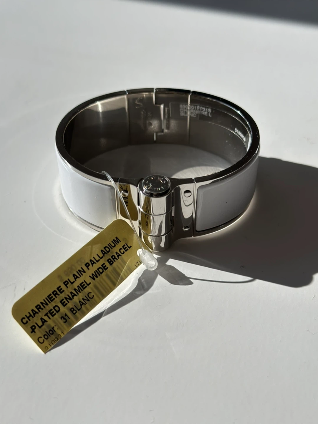 Selling a beautiful Hermès Charniere Plain Palladium Plated Enamel Wide Bracelet in size S. The color is 31 Blanc. Originally bought for $650. It's in great condition!