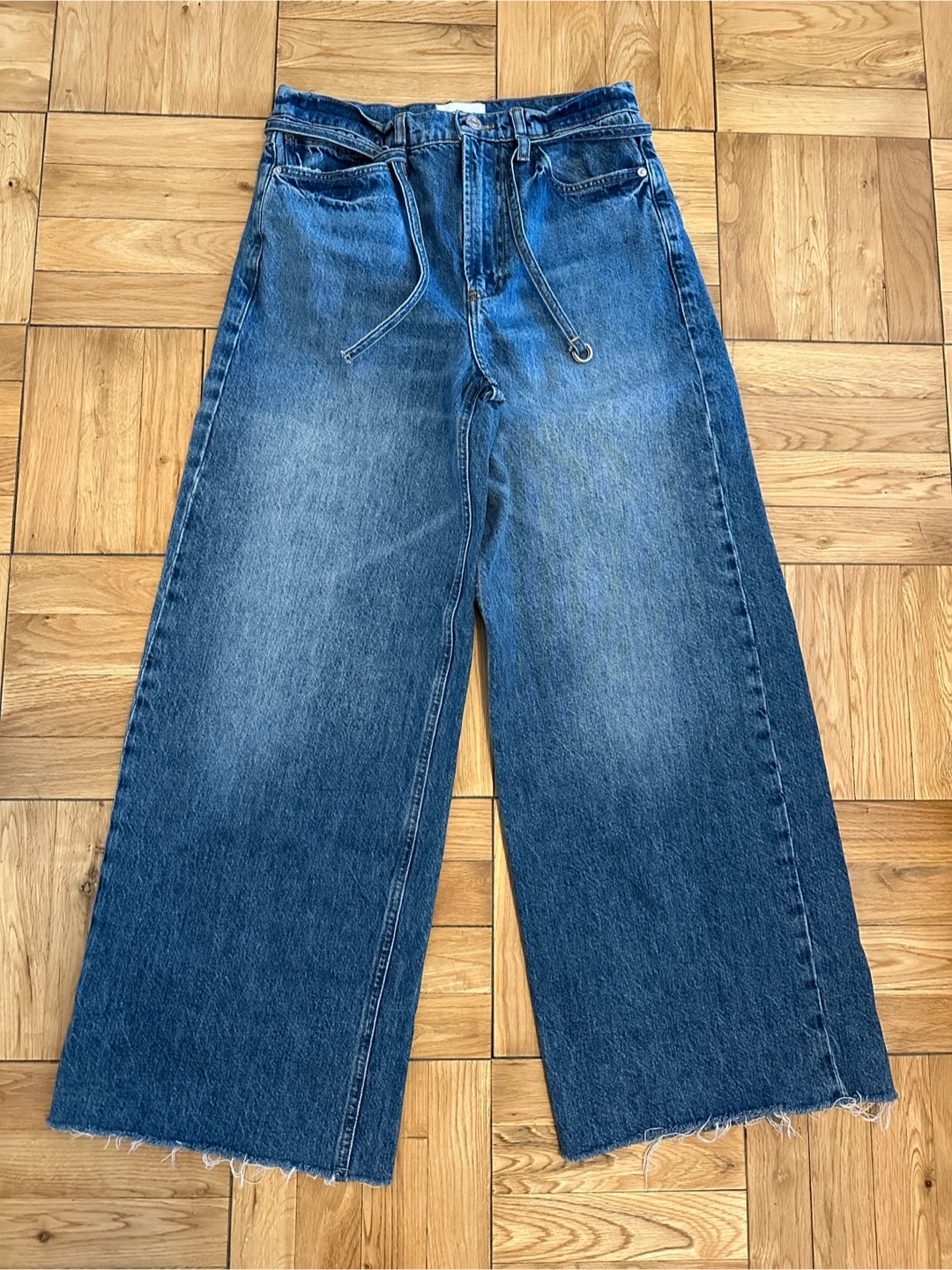Selling a pair of Frame wide leg jeans in good condition! They're a stylish and comfortable fit, perfect for a casual look. The denim is a classic blue wash, and they feature a unique wide-leg design. These jeans are sure to add a trendy touch to your wardrobe