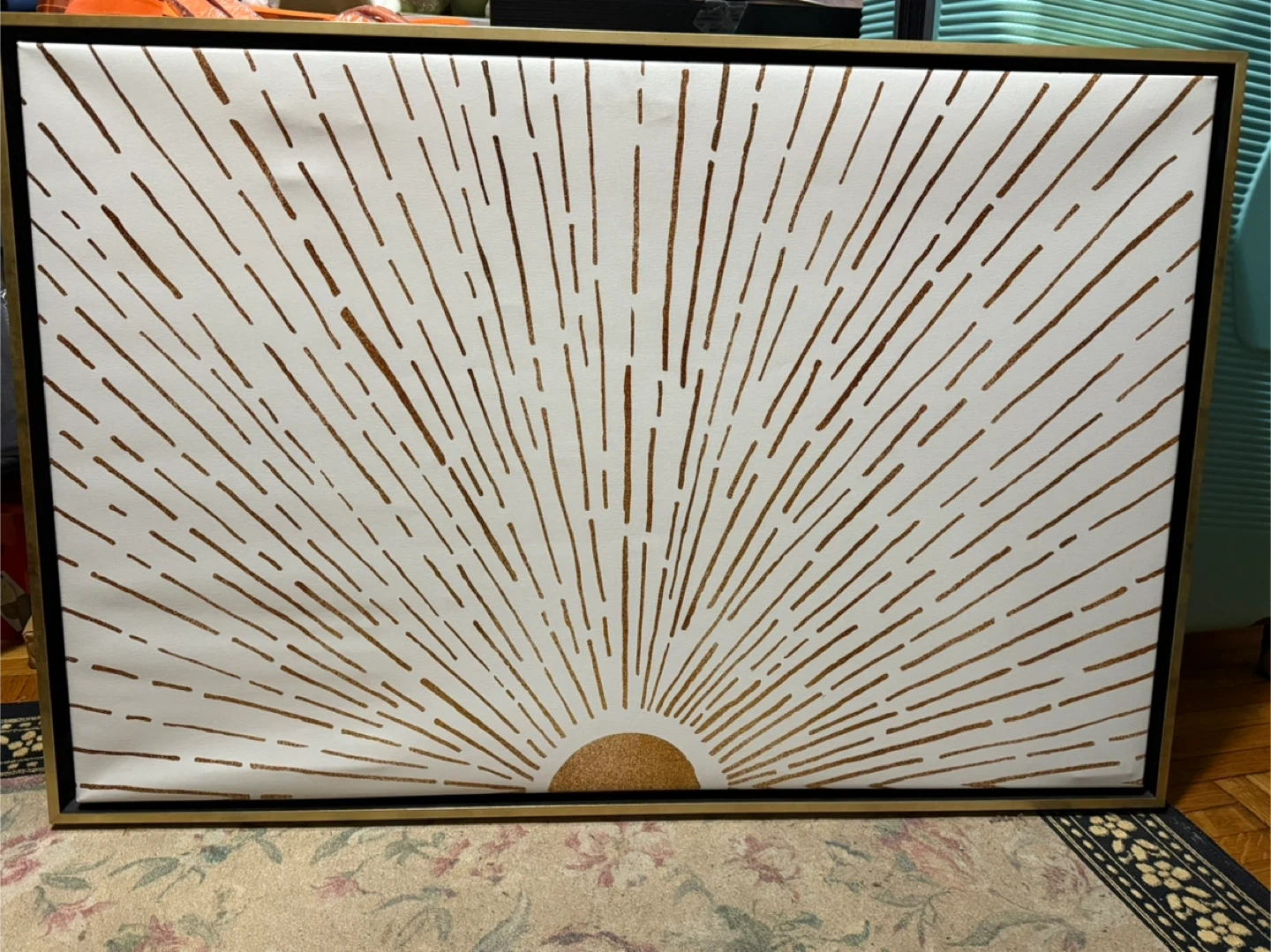 20Selling a framed canvas wall art piece featuring a sunburst design in gold on a white background. It's in great condition and would add a nice touch to any room!