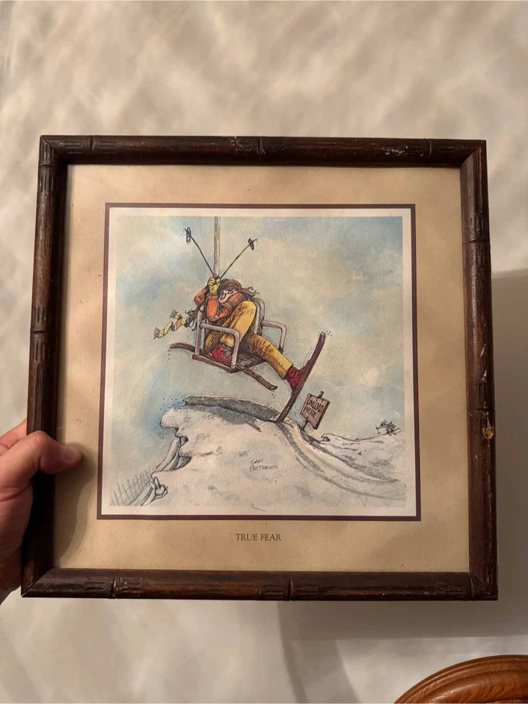 This is a framed print of Gary Patterson's "True Fear" cartoon. It features a skier on a ski lift, with a humorous take on the experience. The frame is wood and has some wear and tear.