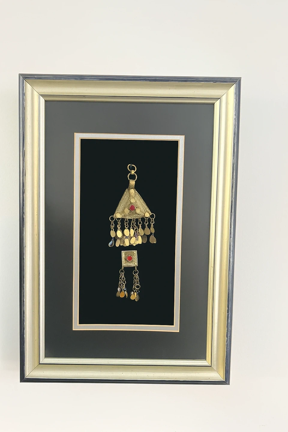 Framed art featuring a gold-colored pendant design with red accents. The pendant has a triangular shape with dangling chains and small embellishments. The frame has a silver and gold finish, adding a touch of elegance to the piece