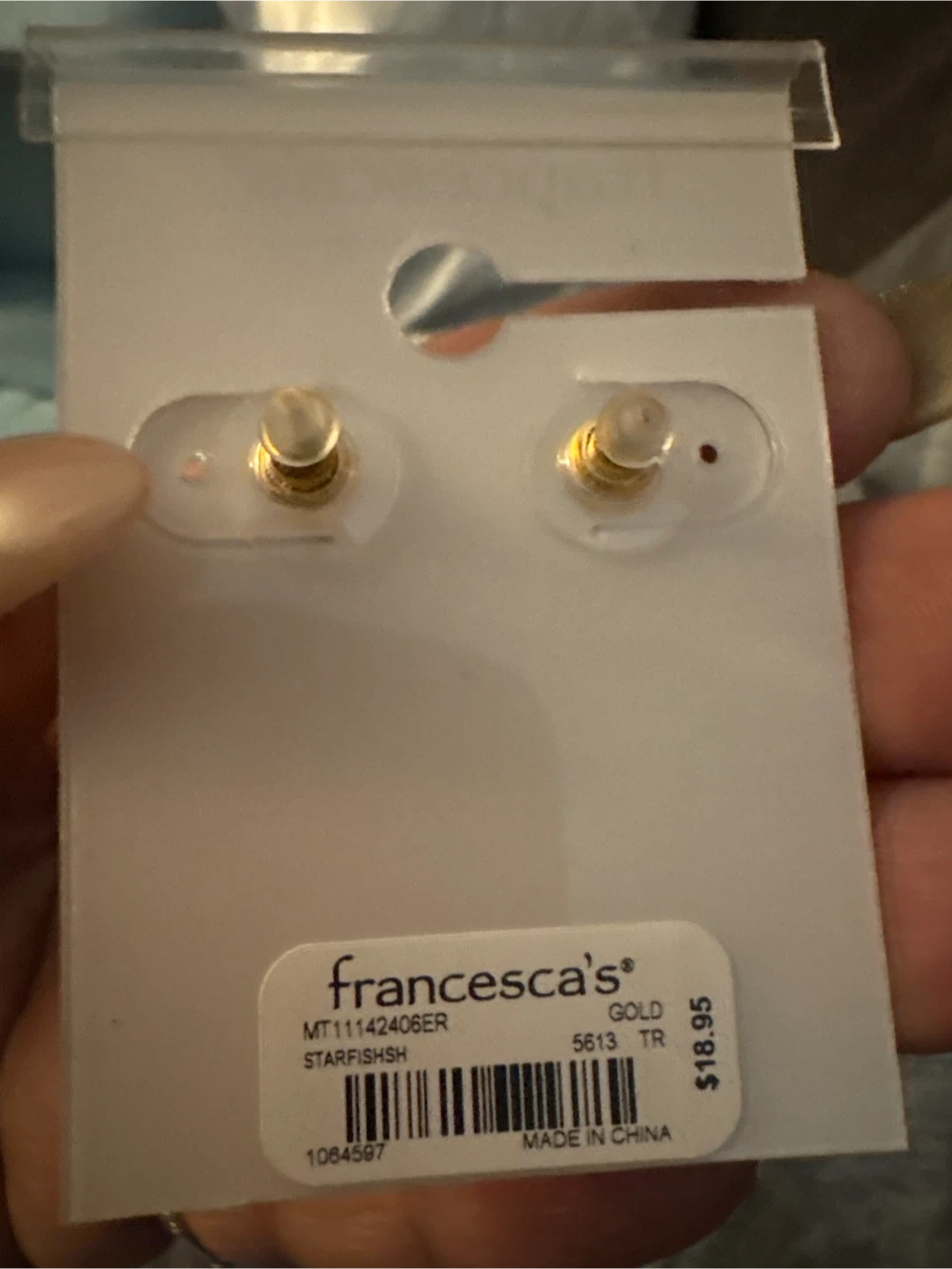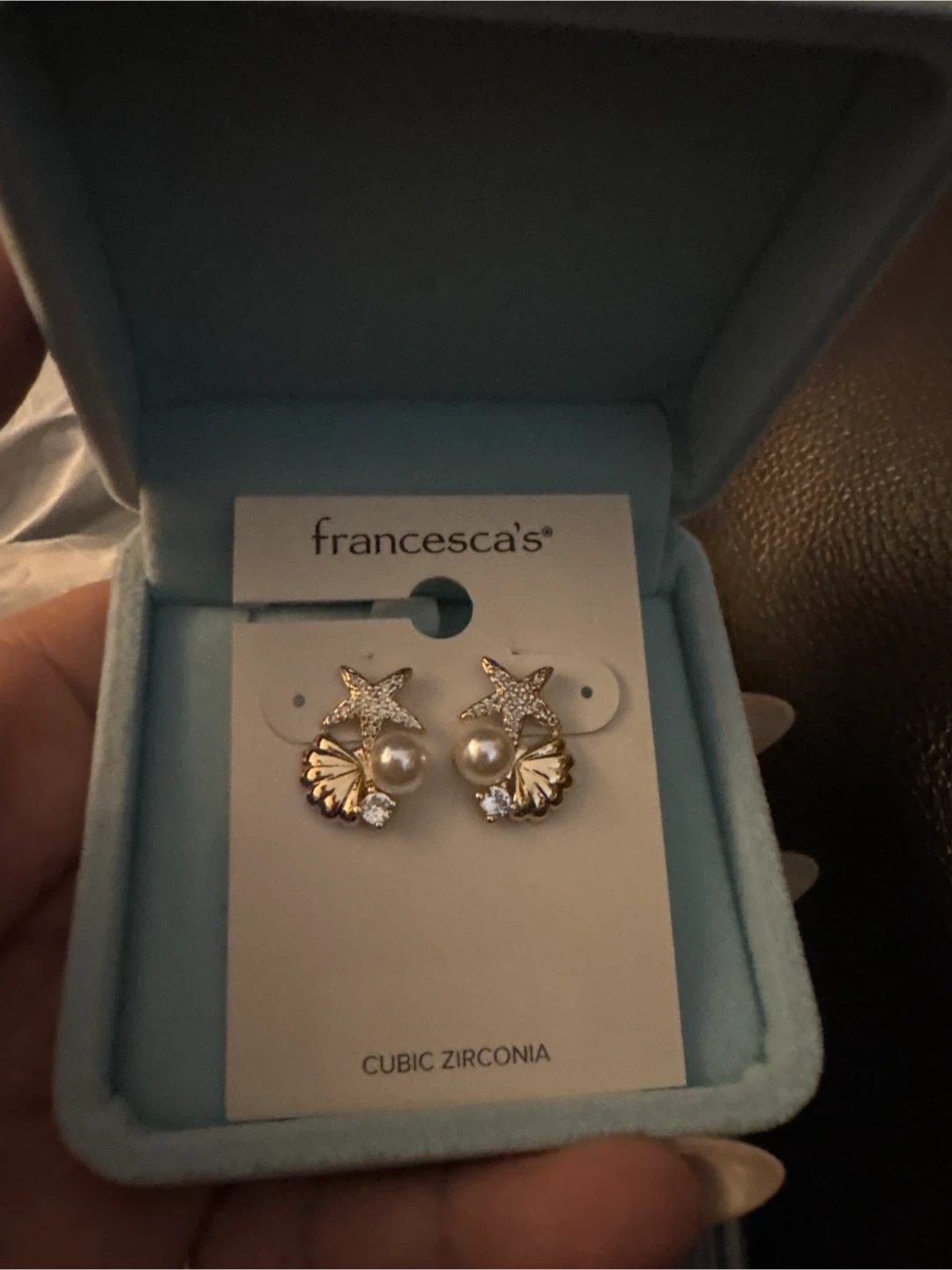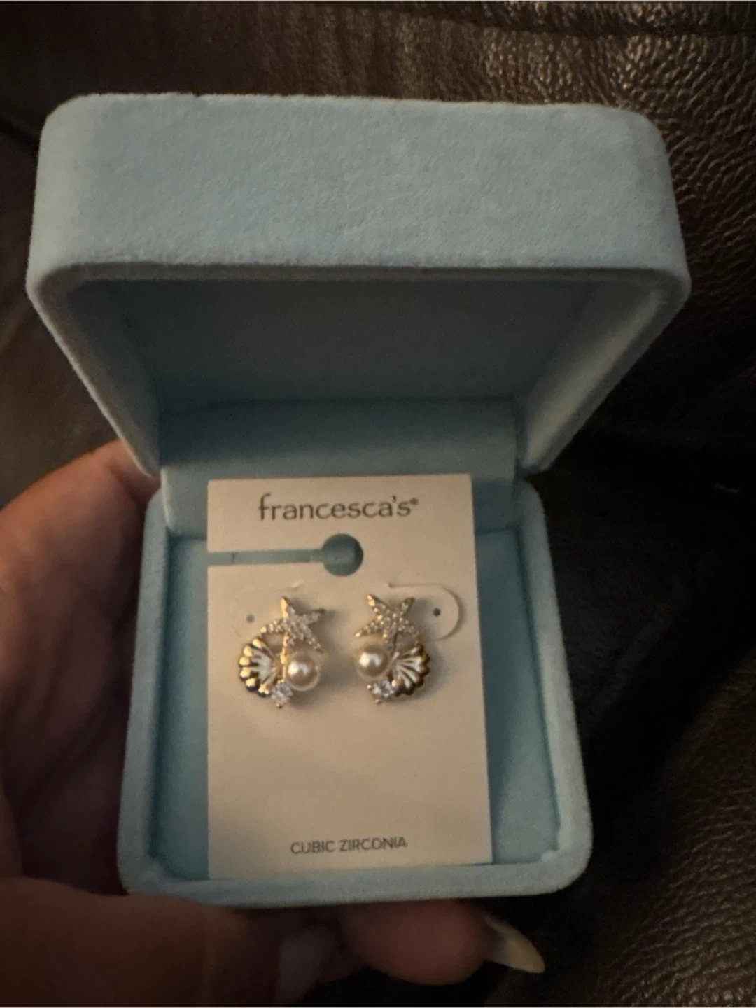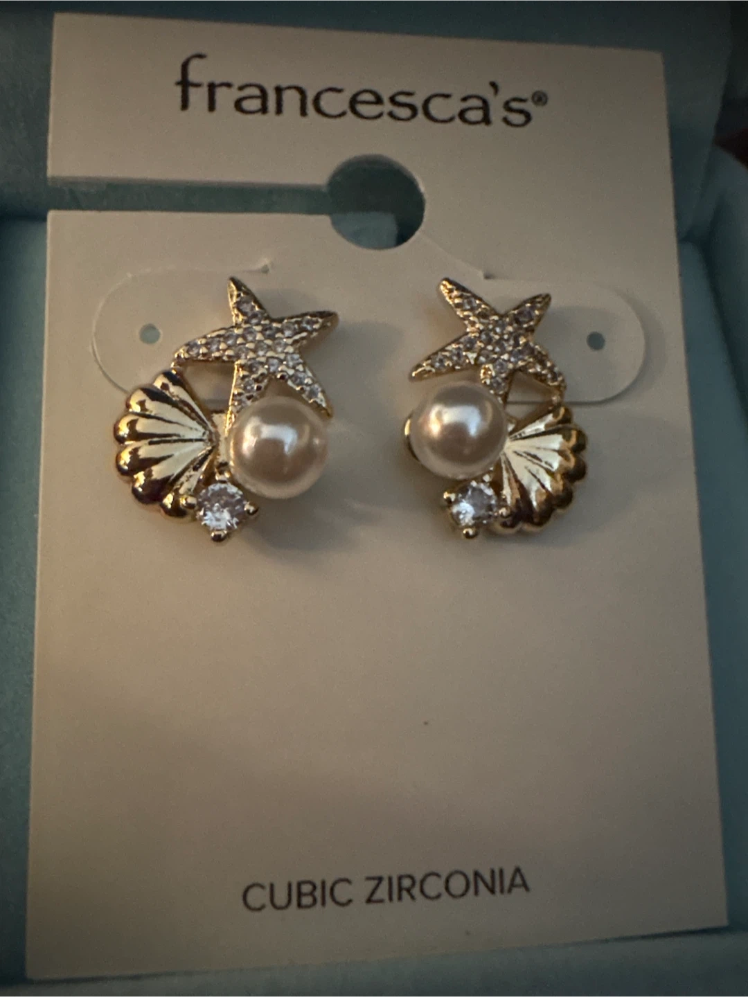 These Francesca's earrings are brand new and come in their original box! They feature a starfish and pearl design with cubic zirconia accents. The earrings are gold in color.