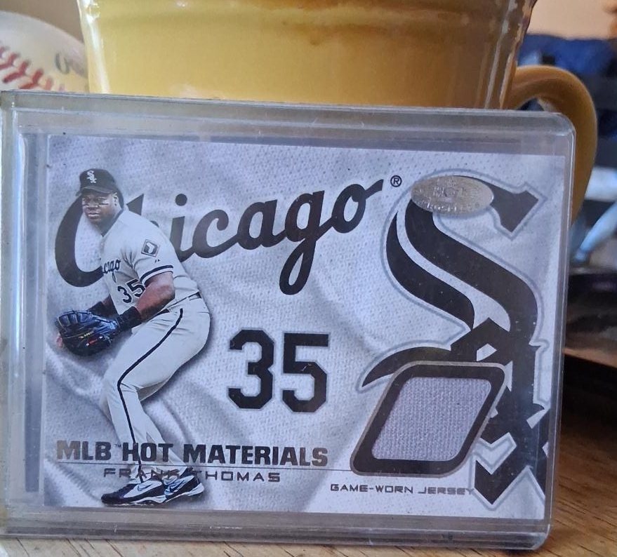 Selling a Frank Thomas MLB Hot Materials card featuring a piece of his game-worn jersey! It's a cool collectible for any baseball fan, especially if you're a fan of "The Big Hurt"