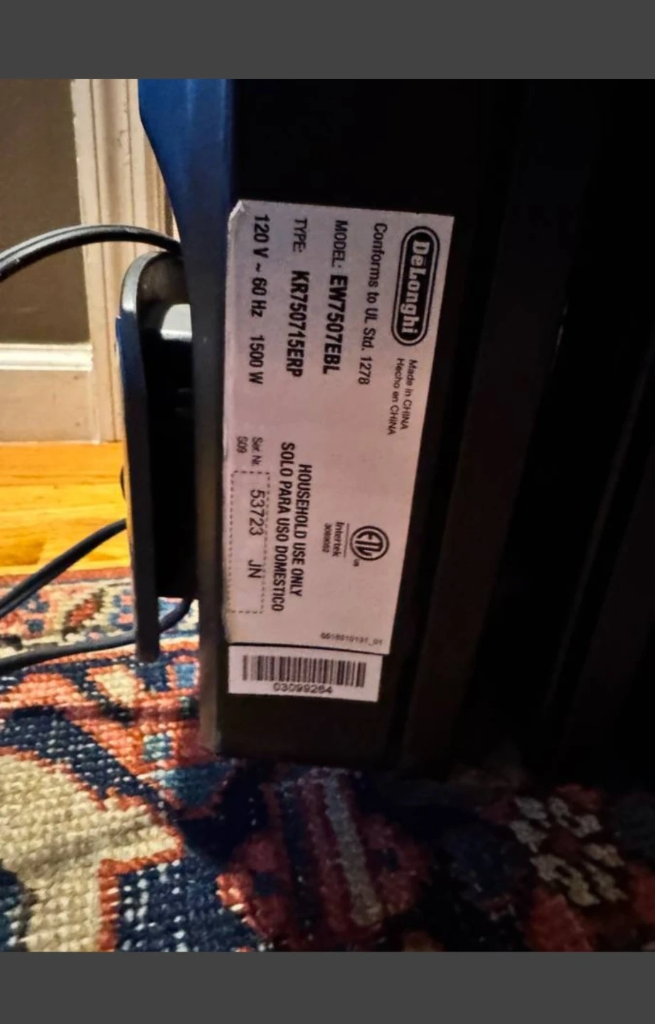 828Selling a DeLonghi EW7507EBL oil-filled radiator heater. This heater conforms to U.L. Std. 1278 and is made in China. It's a KR750715ERP type and operates at 120 V ~ 60 Hz with 1500 W power. Perfect for household use!