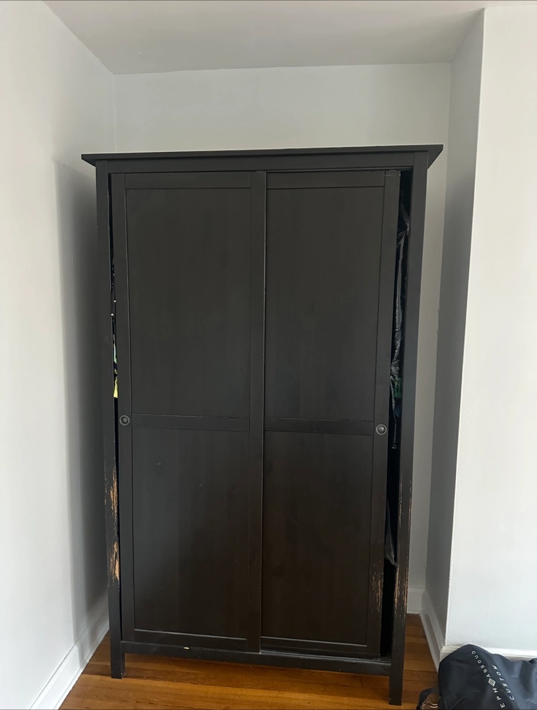 20Free Dark Brown IKEA HEMNES wardrobe (was discontinued a few years back) The condition is very used, see photos. Back of wardrobe might need to be nailed down in a couple spots. Everything is still functional but one sliding door gets a little annoying at times. Paint finish has been scratched from a cat. Dimensions : Width: 120.0 cm Depth: 59 cm Height: 197.0 cm I live in 5th floor of an elevator building. Please bring a friend and come prepared.