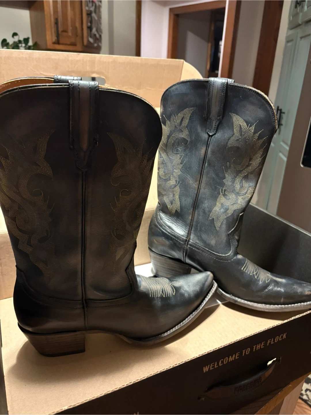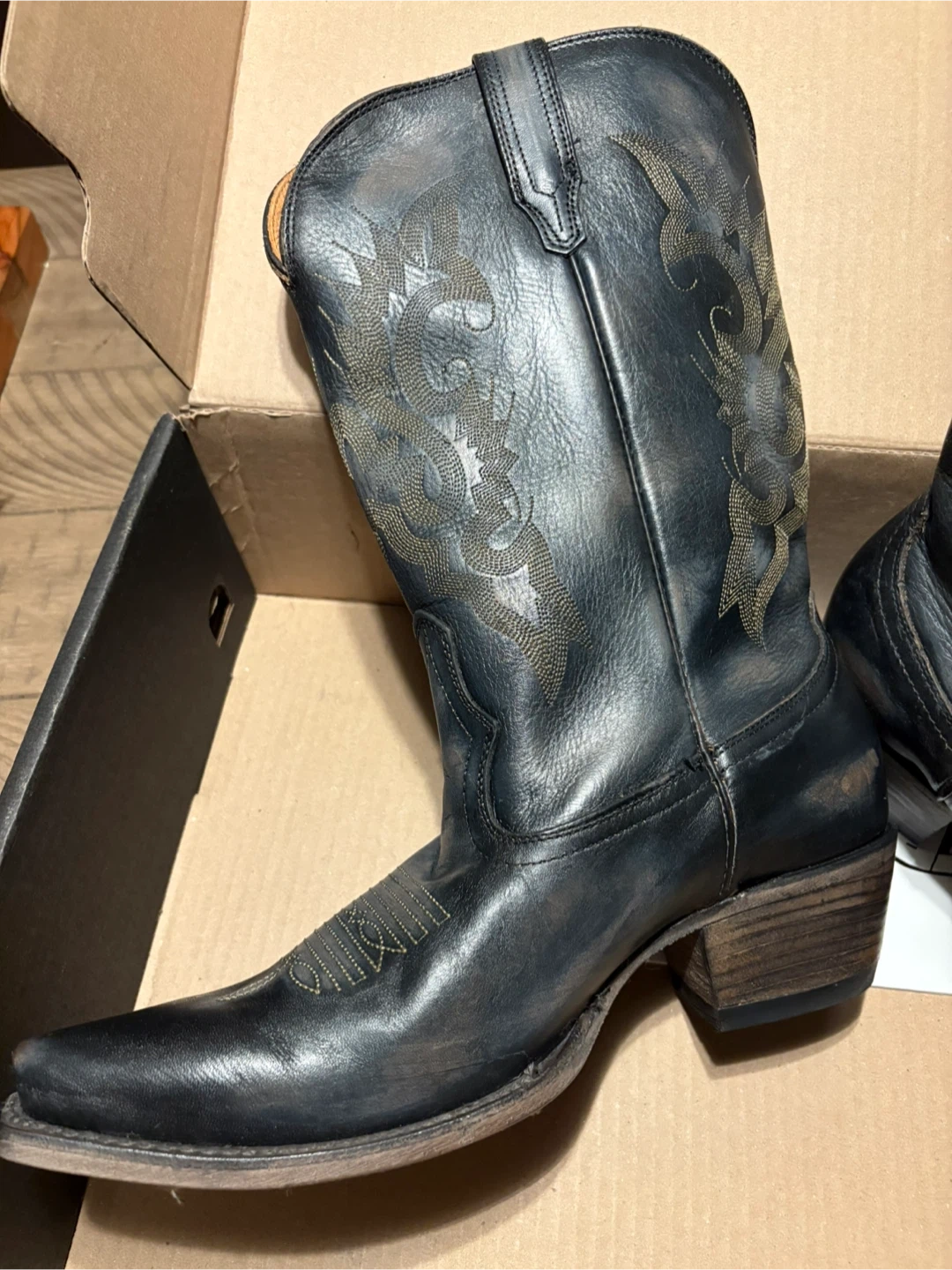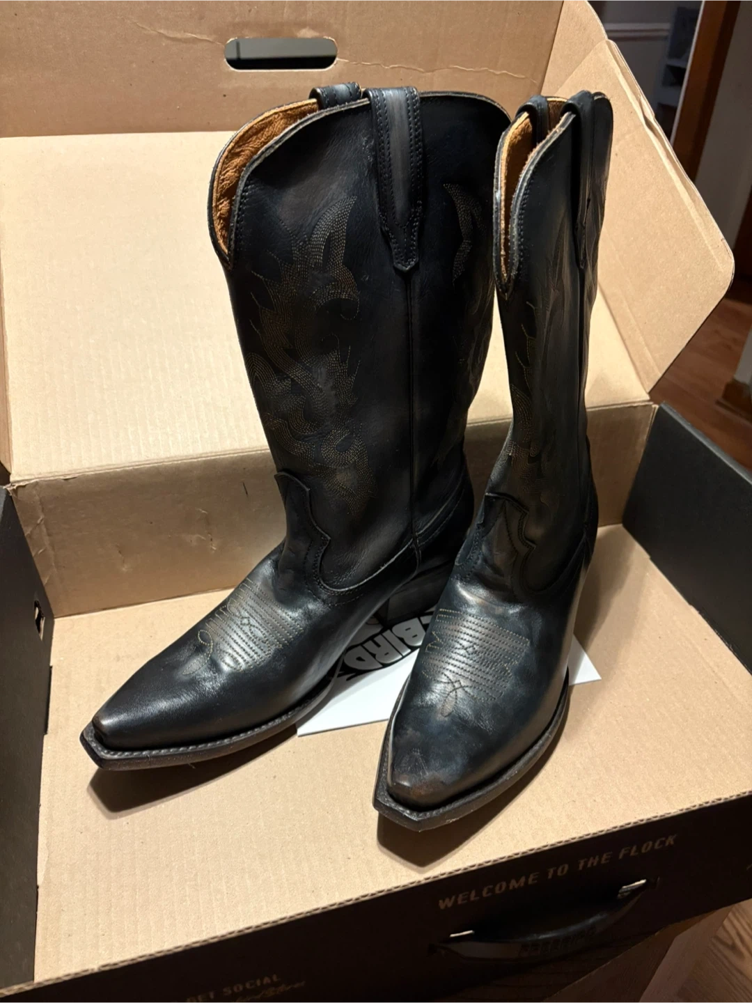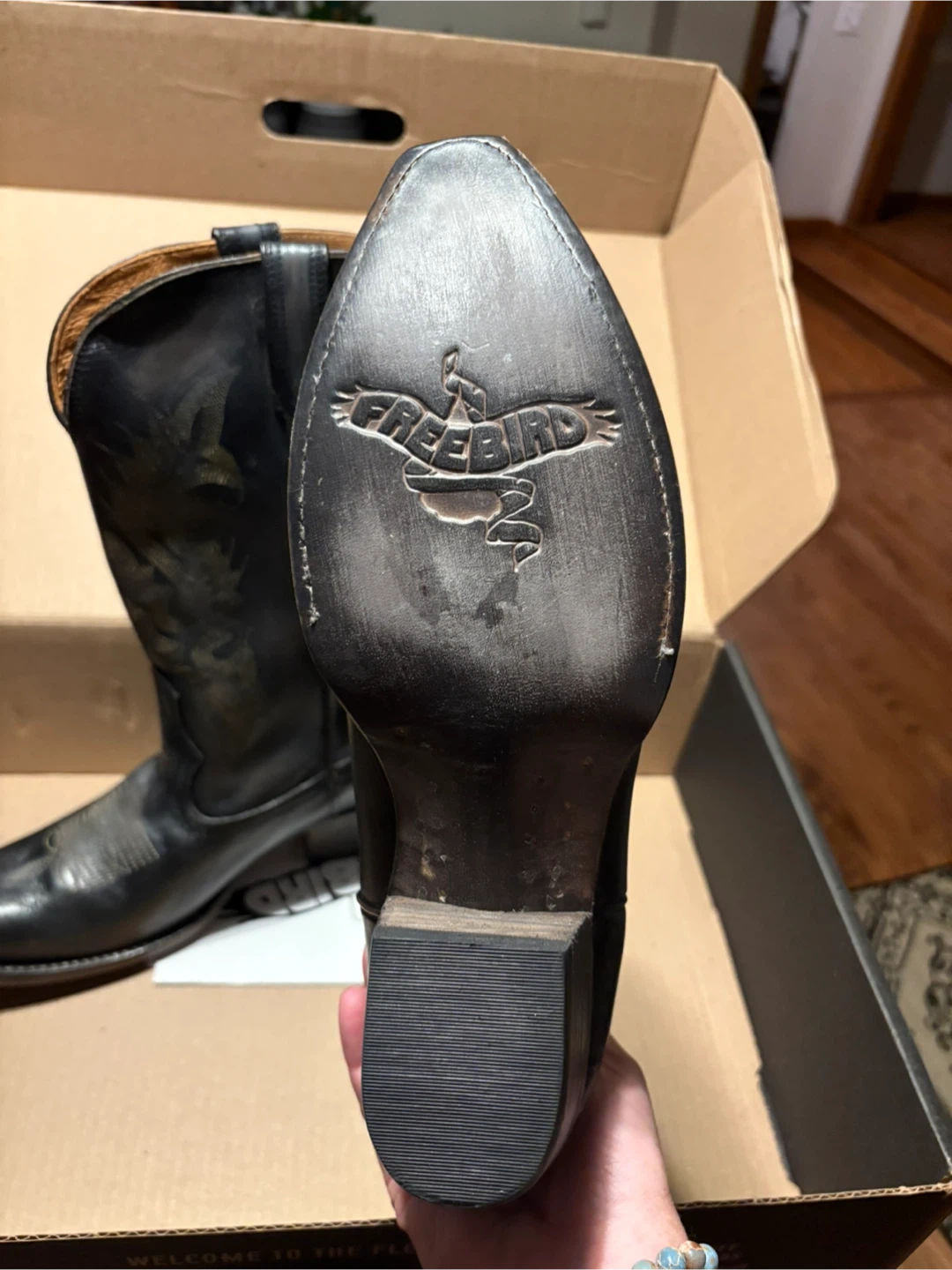 Selling a pair of Freebird cowboy boots in black leather. They are in good condition and come with the original box. These boots have a stylish, worn look with decorative stitching.