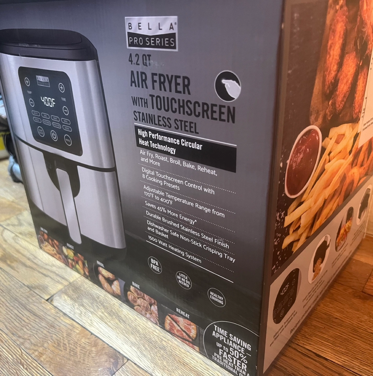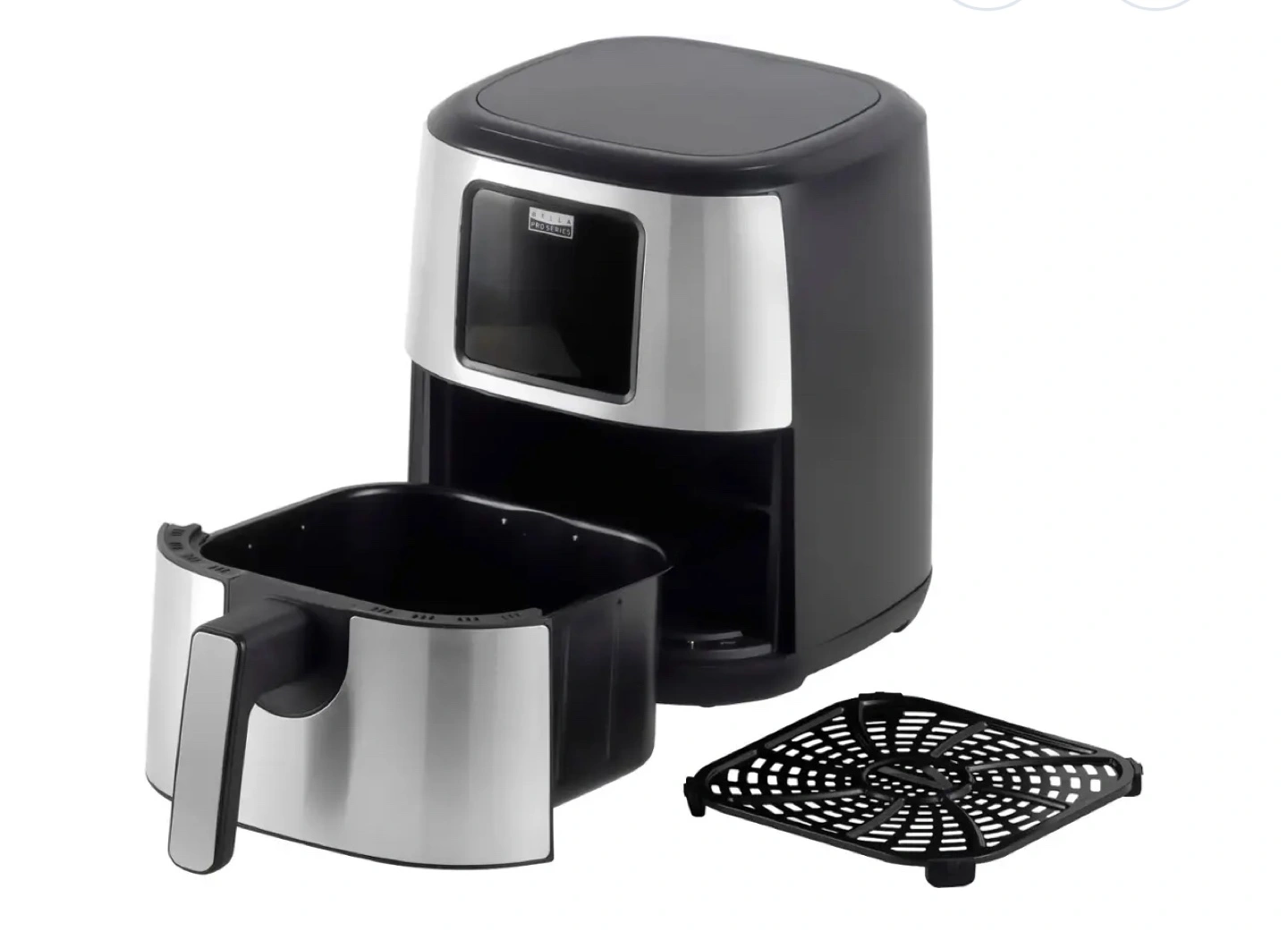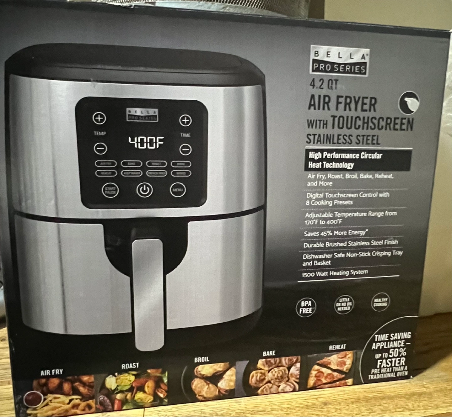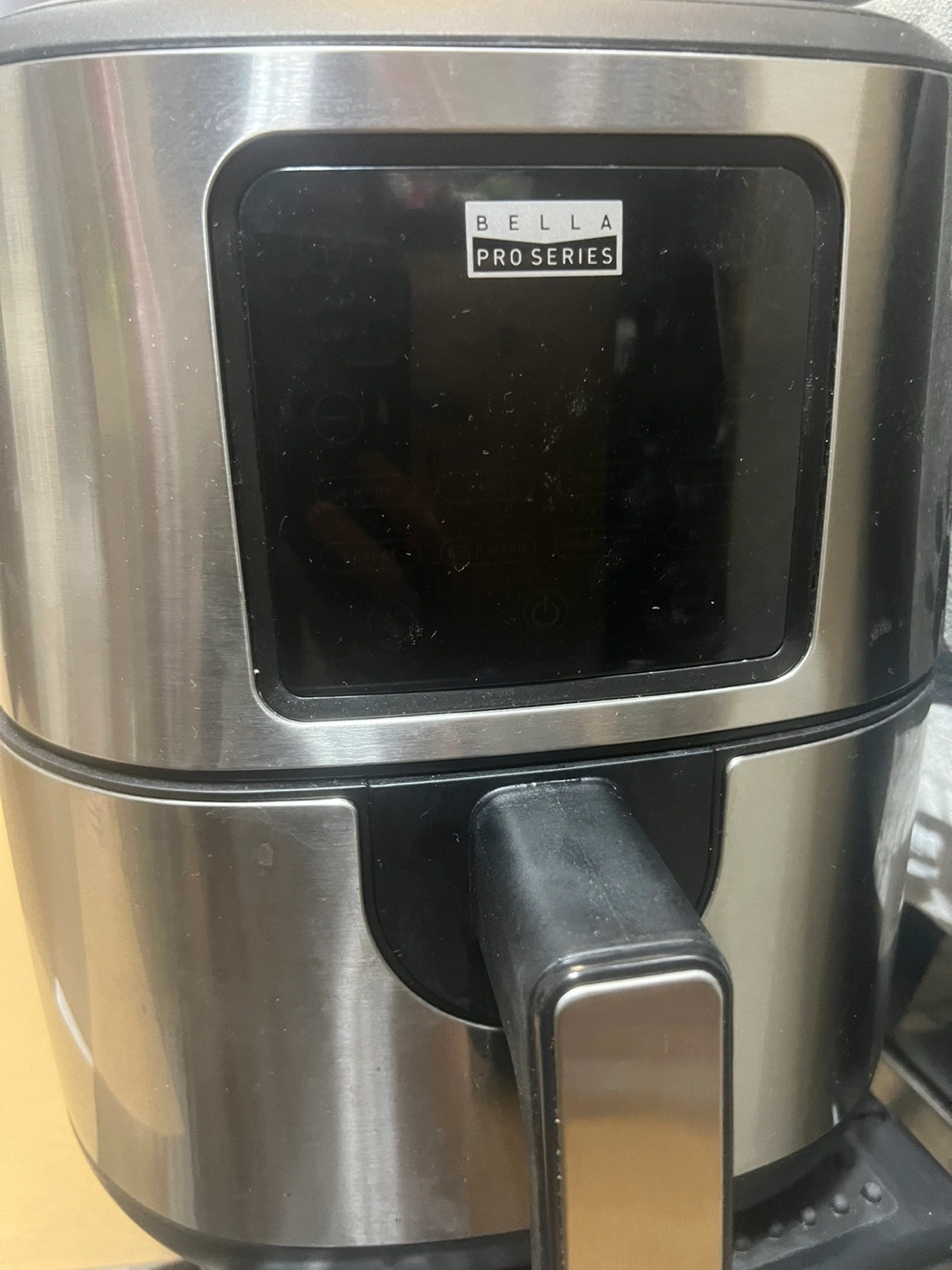 760Stainless steel air fryer with touchscreen. Includes a nonstick, dishwasher-safe basket. Has 8 cooking presets. I figured out that on occasion it had to be tilted back to turn on (see photo how I prop it up while using intermittently). It may need a new sensor. I just took it out of the box and tested it 11/25/2024 at 5pm and it’s working without tilting. I bought on sale, open box item that possibly needs a new sensor. Reg $79.99 but I bought on sale $39.99 and comes with original box, instructions, etc.