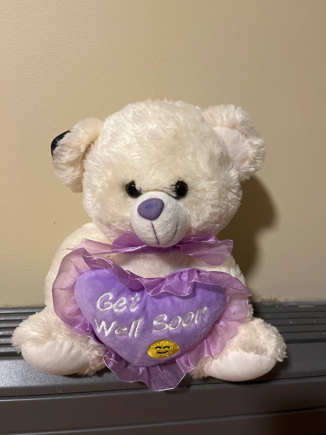 133Adorable plush teddy bear. Holding a purple heart that says "Get Well Soon". Perfect gift for someone feeling under the weather.