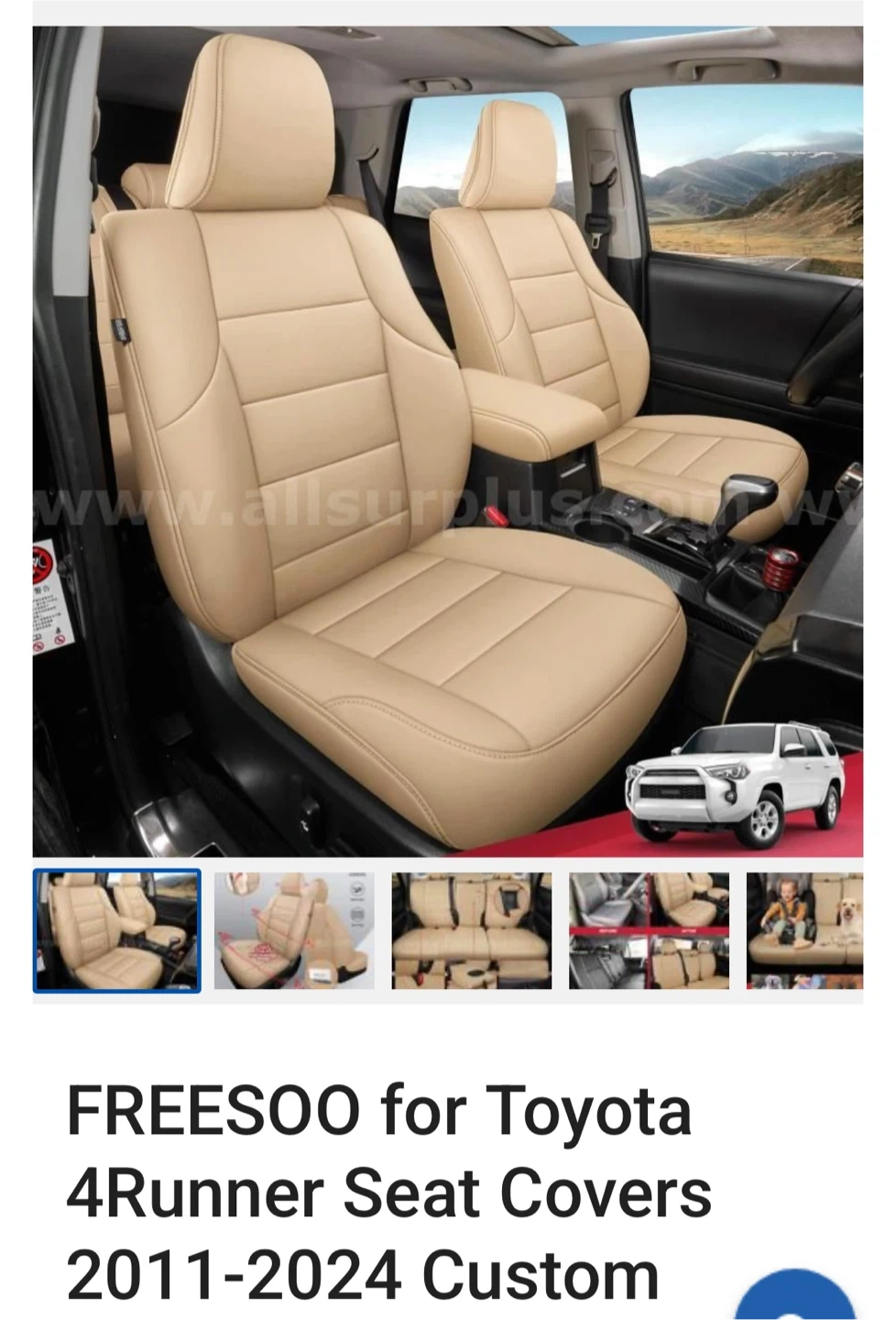 These are FREESOO custom fit seat covers for a Toyota 4Runner, model years 2011-2024. They appear to be in new condition and come in a beige color. The covers are designed for a 1:1 fit. The box is included