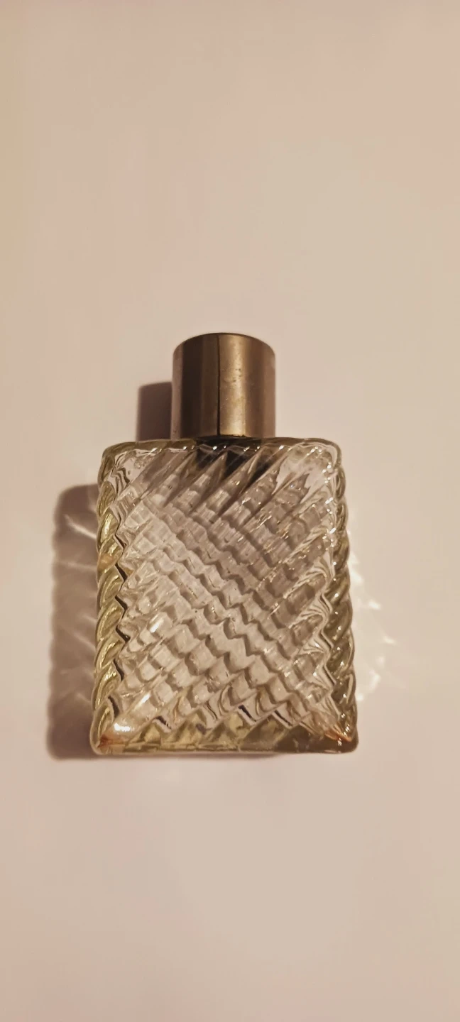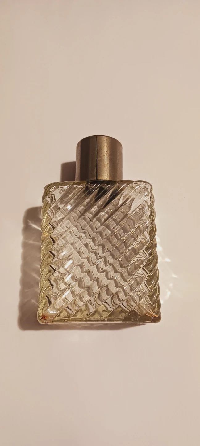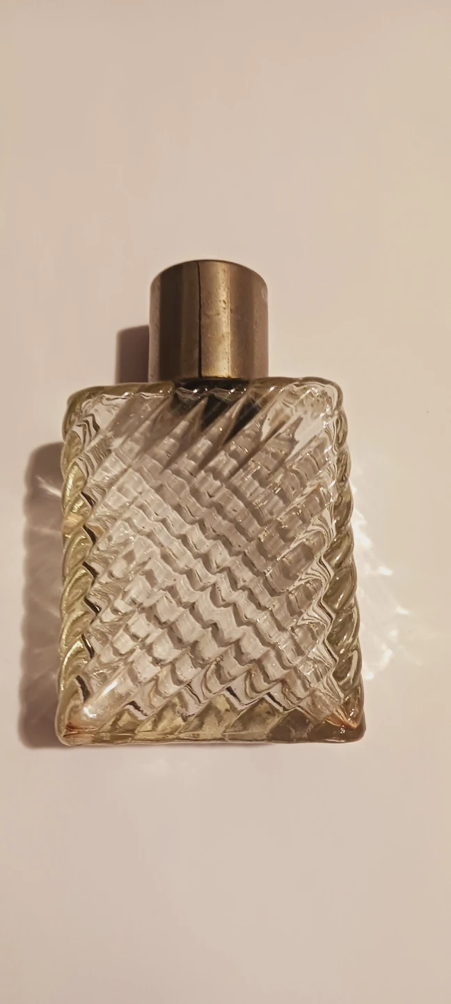 1000+French cut glass small vintage perfume bottle. It has a square shape with a textured design on the sides and a metallic-looking cap. It's in good condition and ready for a new fragrance. 4"×2". ALL MY PRICES ARE NEGOTIABLE !!