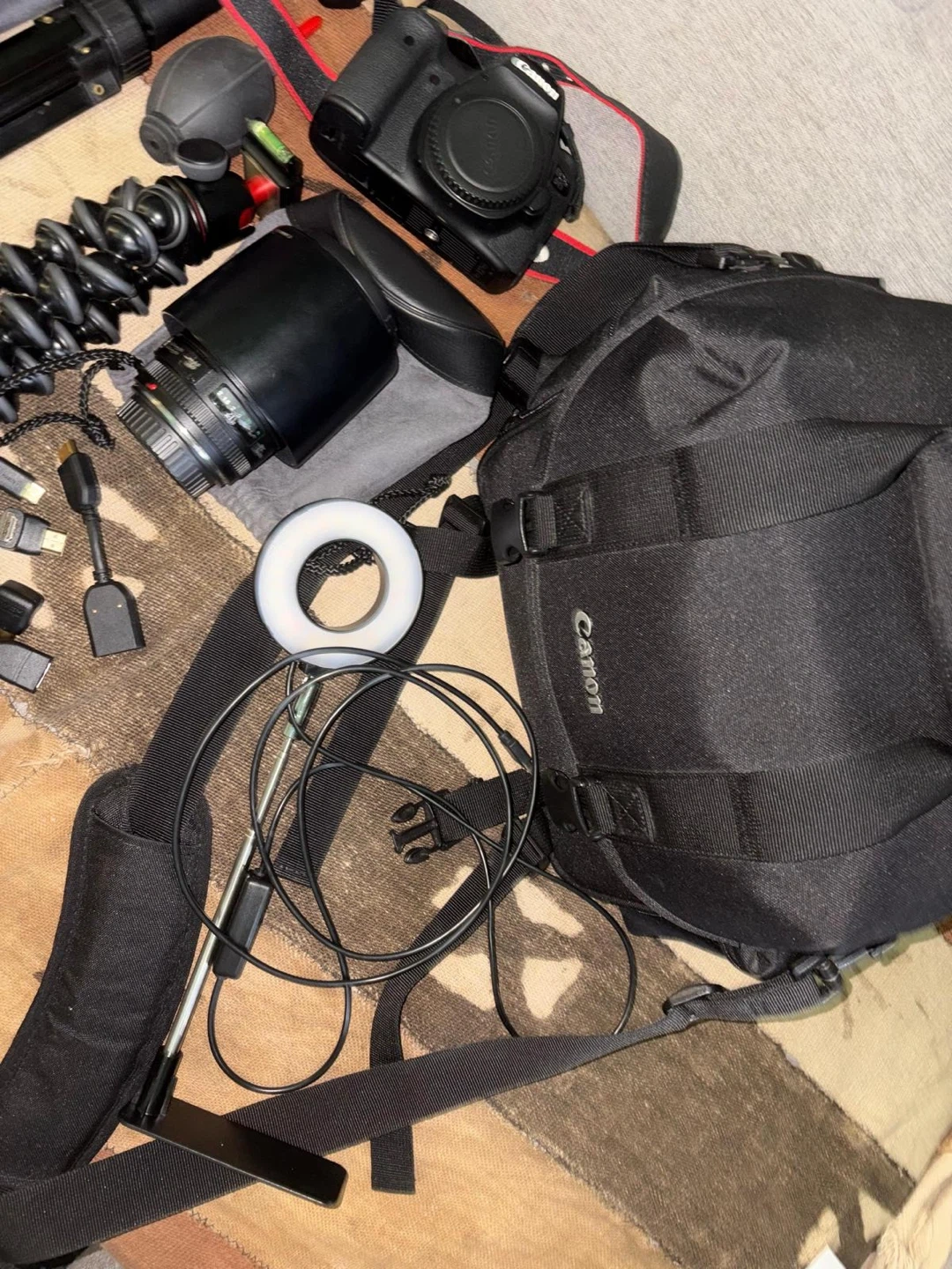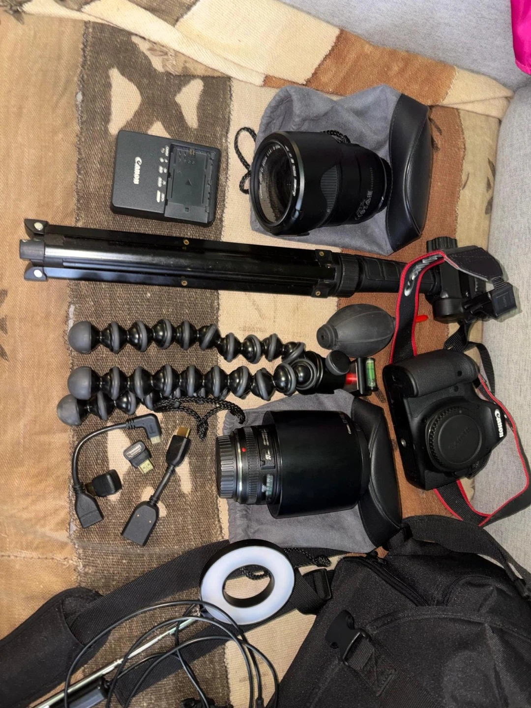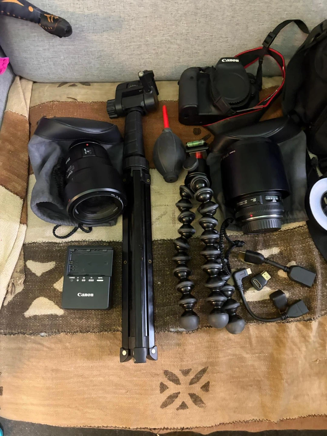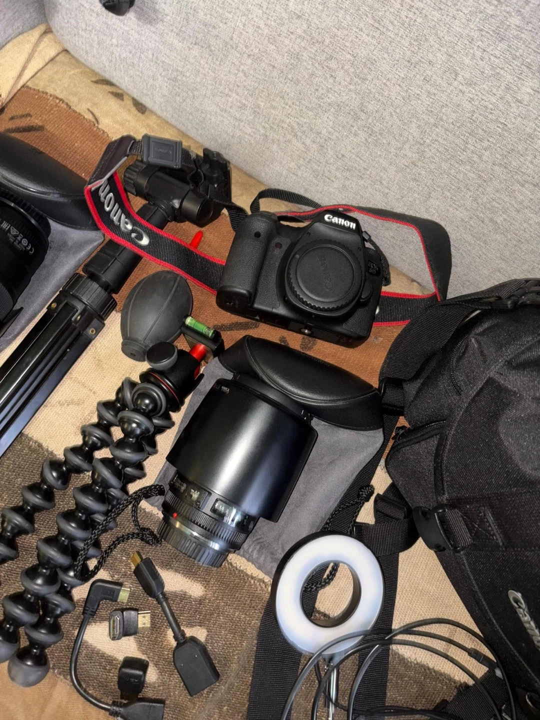 The Canon EOS 6D is a compact and lightweight (755 g) full-frame DSLR. It comes with two tripods, a small flashlight, a carrying case, and two new lenses. It's ideal for portraits, landscapes, and travel thanks to its 20.2 MP CMOS sensor and DIGIC 5+ processor. It offers excellent low-light performance (ISO 100-25,600, expandable to 102,400) and an 11-point AF system that reaches -3 EV. Includes Wi-Fi and GPS.