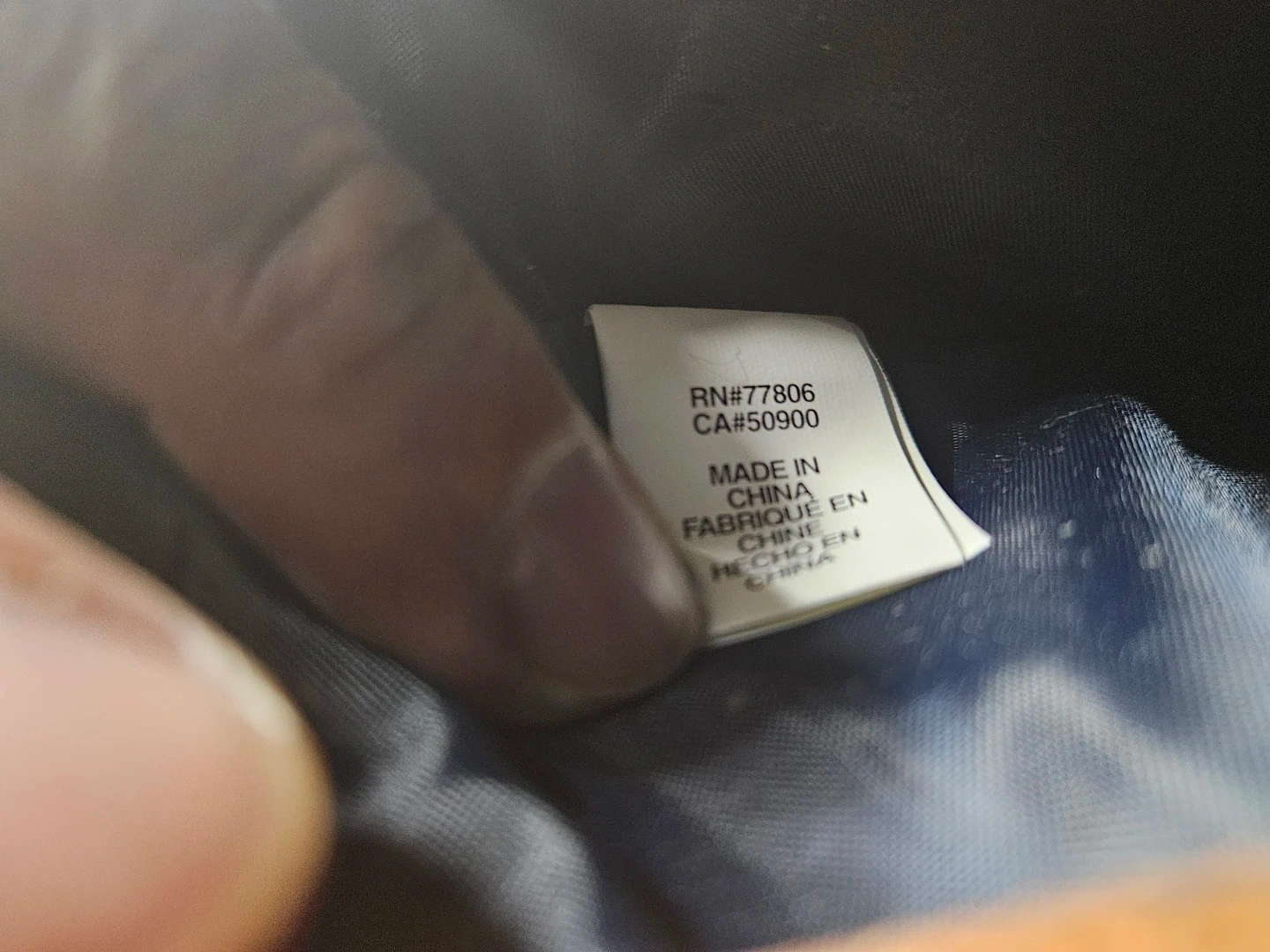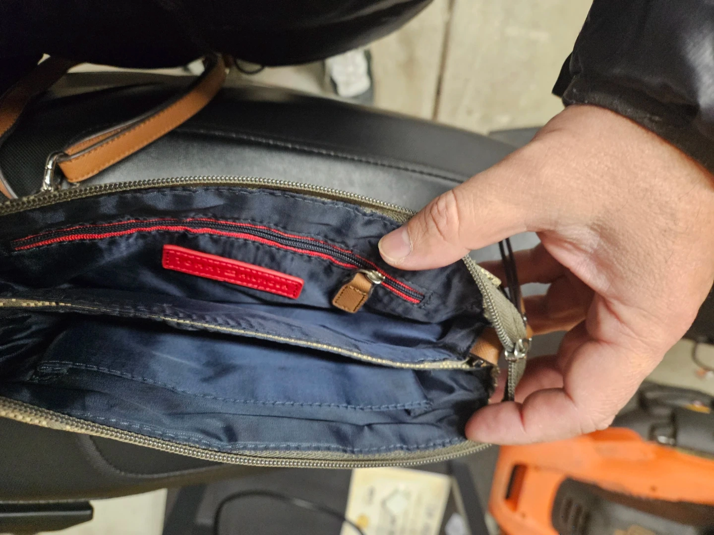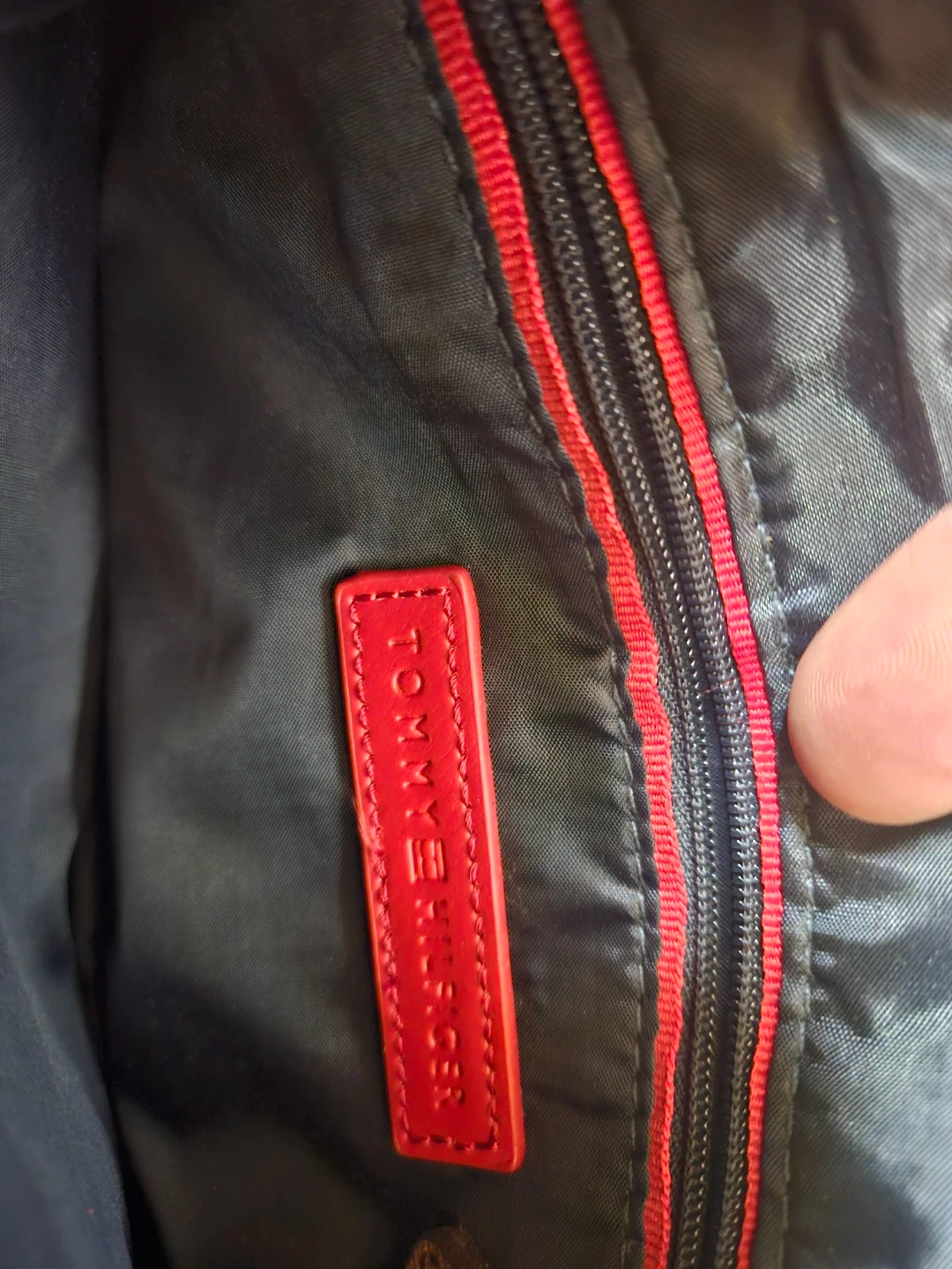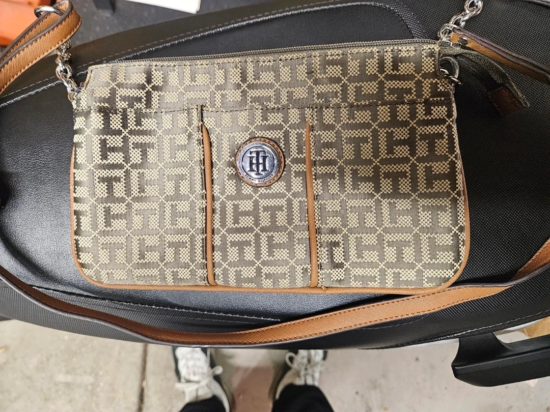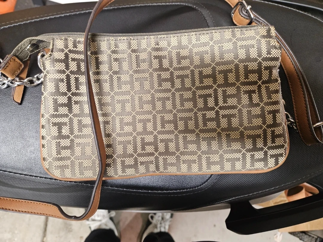 Tommy Hilfiger crossbody bag with an all over TH monogram print. It has a tan strap and trim, and a silver tone logo emblem on the front. The inside lining is navy blue and has a red Tommy Hilfiger logo tag inside