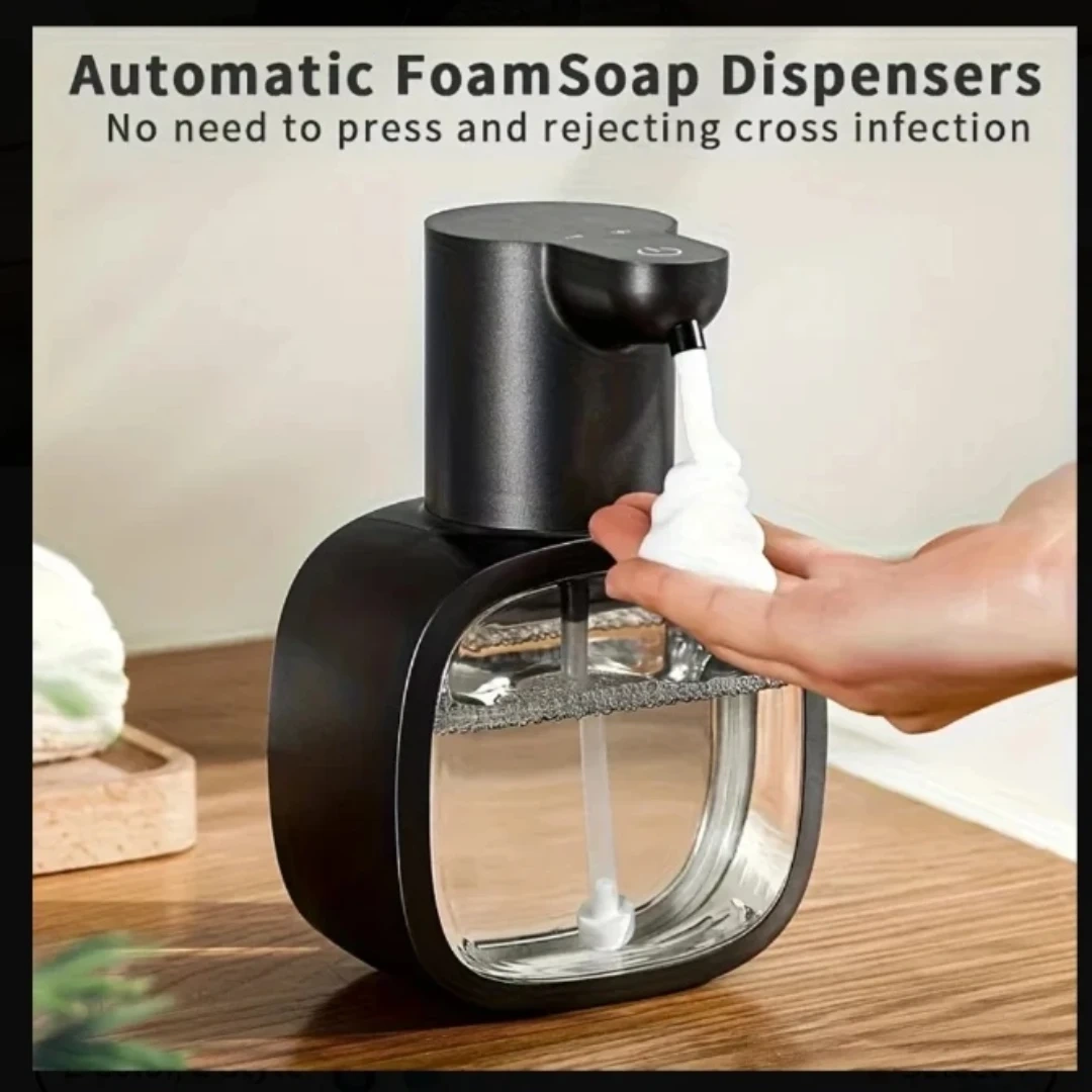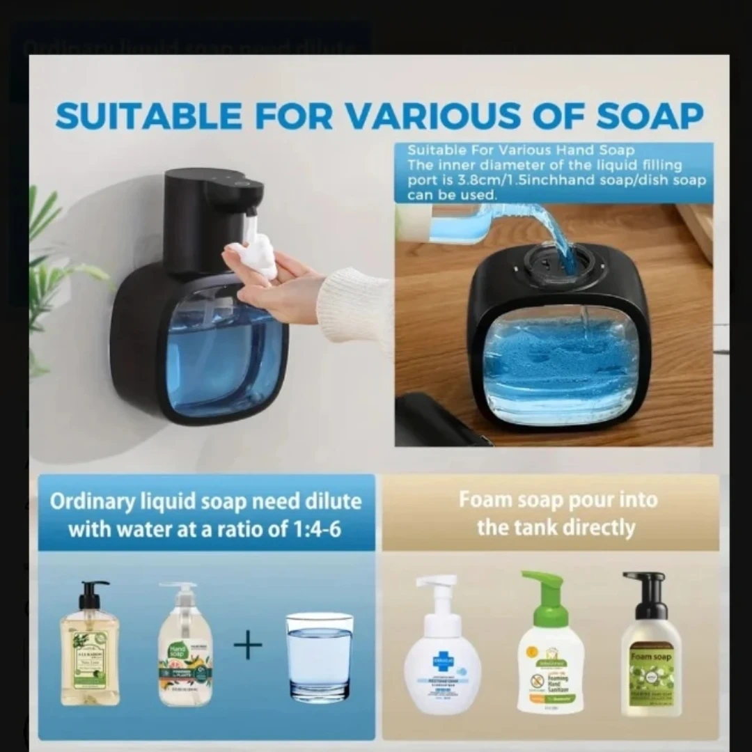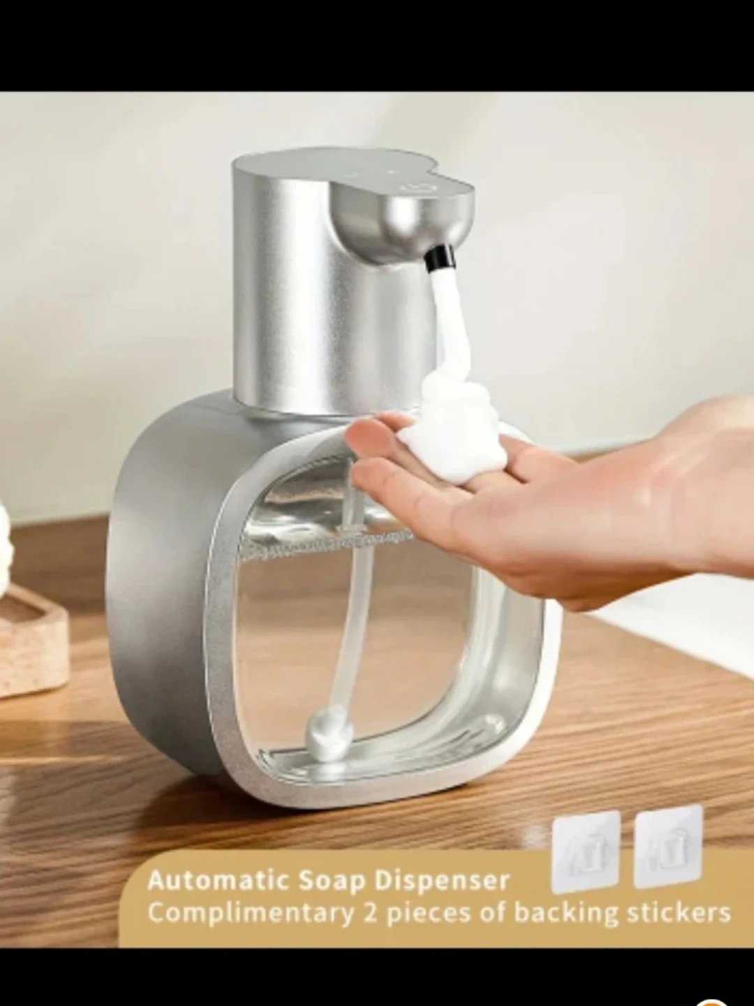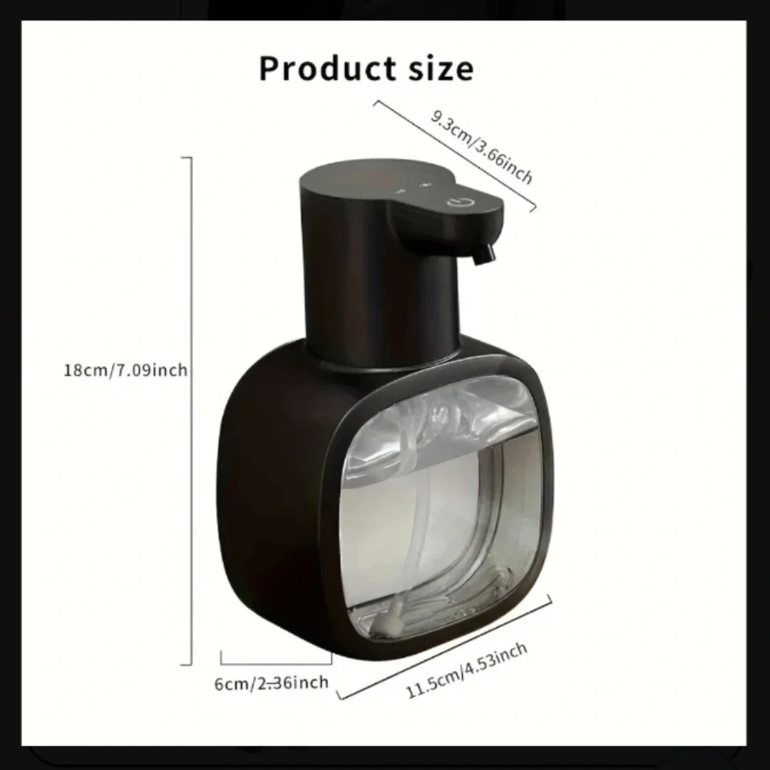 This automatic foam or liquid soap dispenser helps prevent cross-infection. It's rechargeable via Type-C and includes two backing stickers for installation. Dimensions are 18cm high, 11.5cm wide, and 6cm deep.