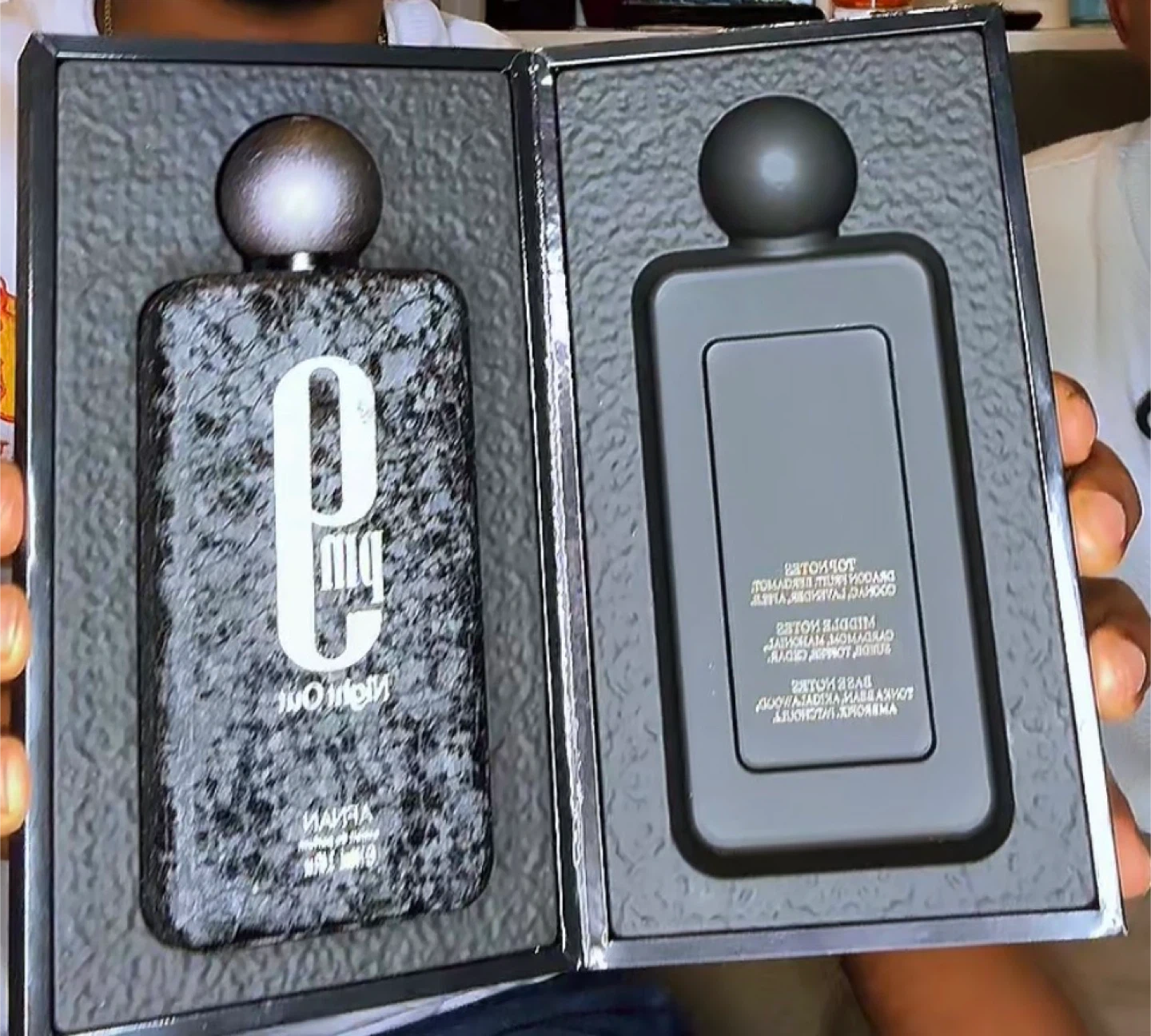 This is a bottle of Night Out parfum. It's a fragrance with a black speckled design and a silver top. Includes original box.