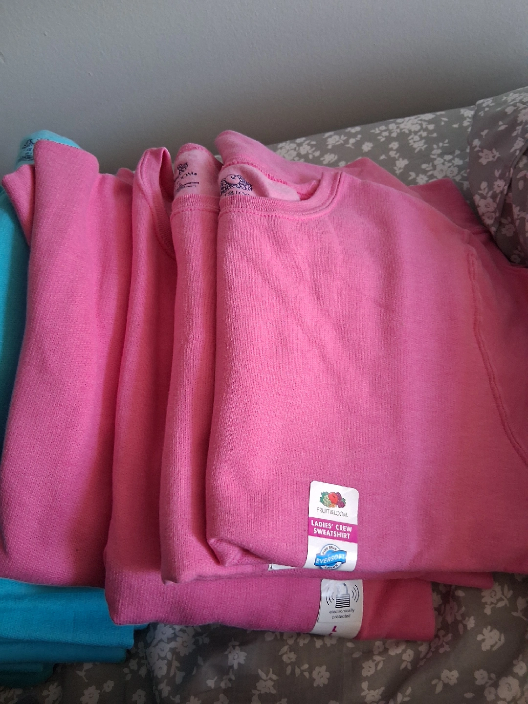 I have several Fruit of the Loom Ladies' Crew Sweatshirts available in size XL. They come in a variety of colors, including blue, pink, gray, and black. These sweatshirts are made from a comfortable material and are perfect for everyday wear. $4.00 ea