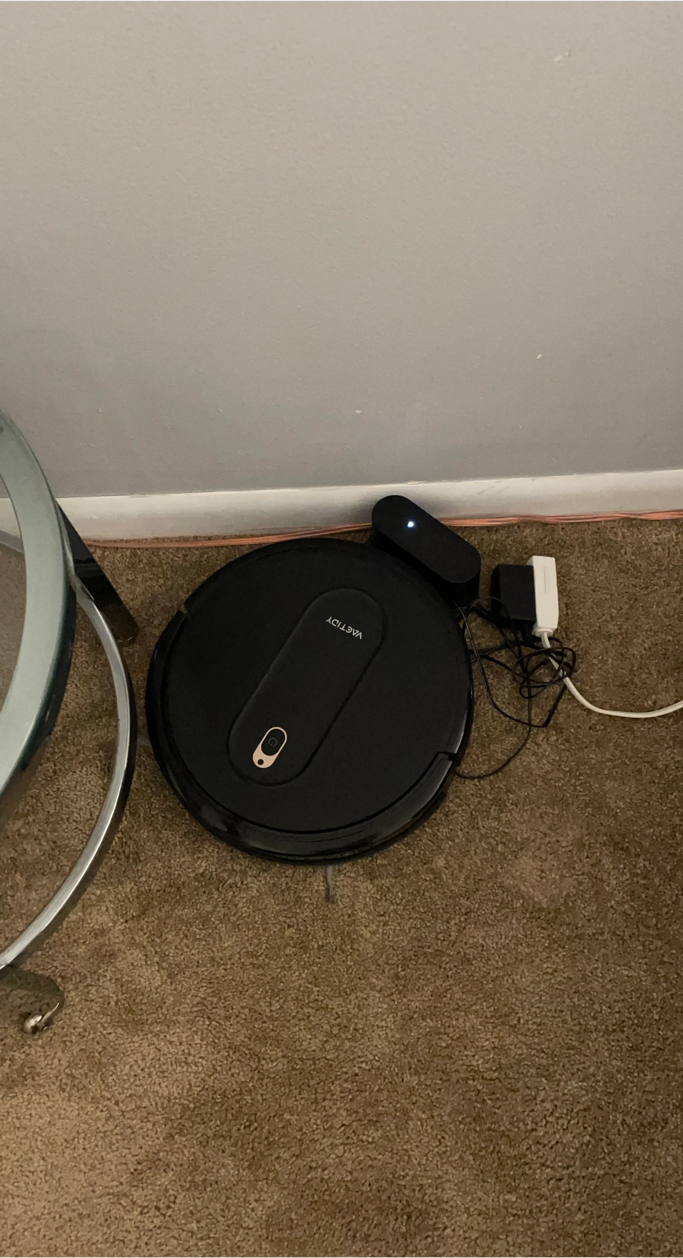 Black Vactidy robotic vacuum cleaner. It's a smart navigation robot vacuum with a charging base and power adapter. Cleans floors automatically.