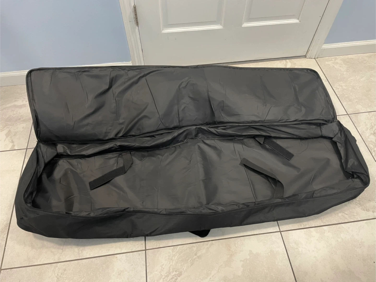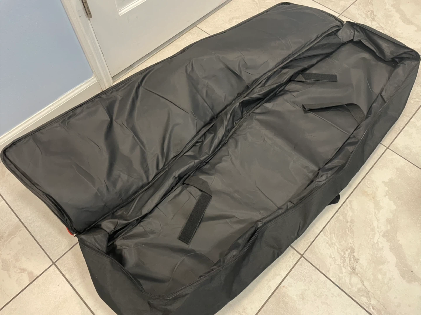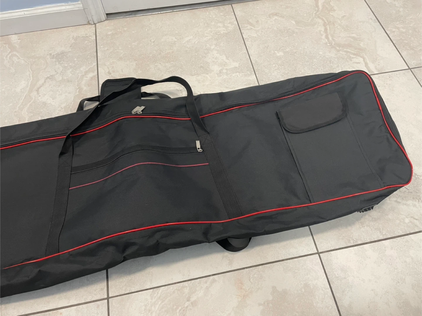 This is a padded gig bag designed for keyboards. It's black with red trim and features handles and straps for transport. The interior has velcro straps to secure your keyboard. It also has an exterior pocket for accessories. 88 keys