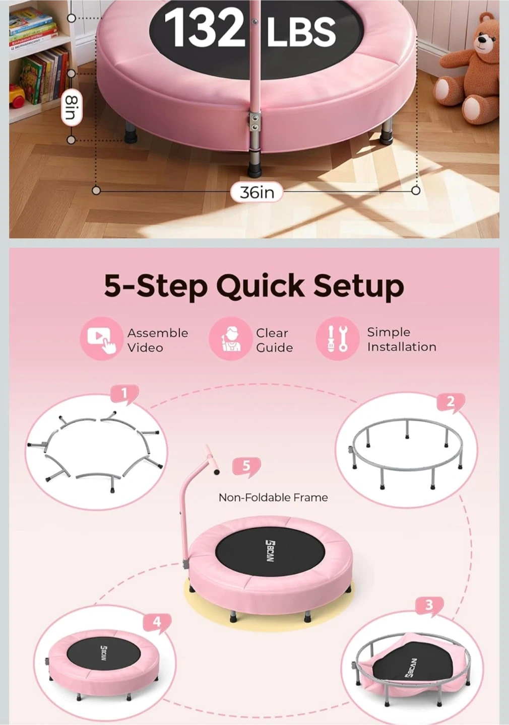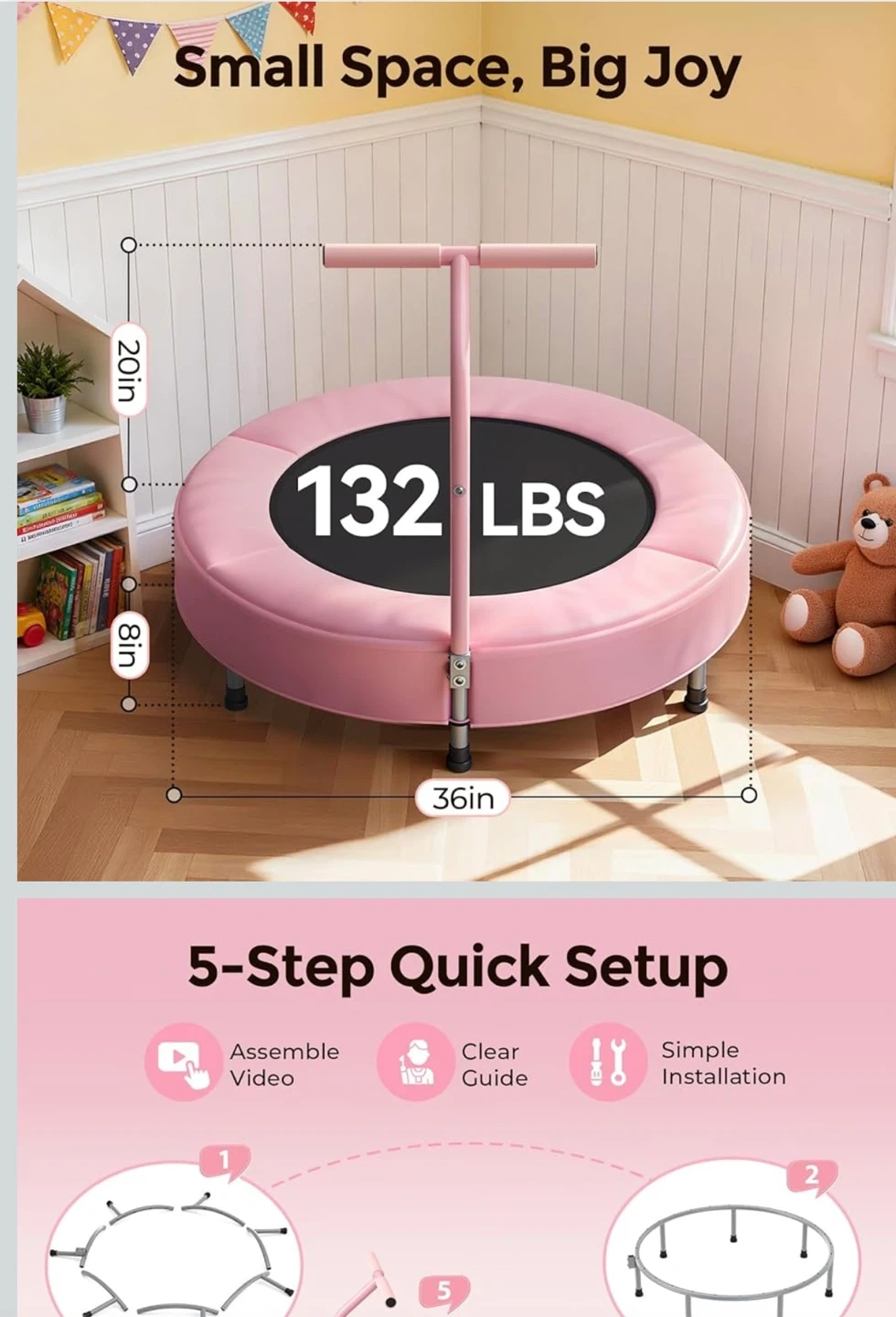 This pink toddler trampoline has a 36-inch diameter and is designed for indoor use. It supports up to 132 lbs and features a height-adjustable handle for safety. Assembly is quick and easy with a 5-step setup process. It's a fun way for kids to get active!