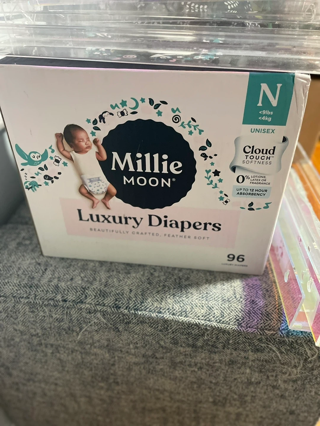 Selling a box of Millie Moon Luxury Diapers! These are size Newborn, suitable for babies under 9lbs or 4kg. They're unisex and feature Cloud Touch softness. These diapers are beautifully crafted and feather soft, with 0% lotions, latex, or fragrance, and up to 12-hour absorbency. Only used a couple for my baby but she grew out of them by the time i started using them