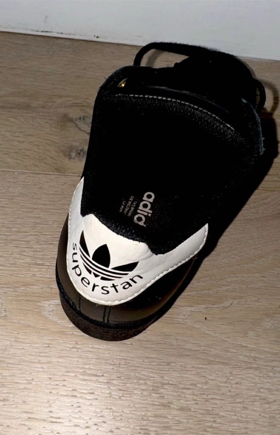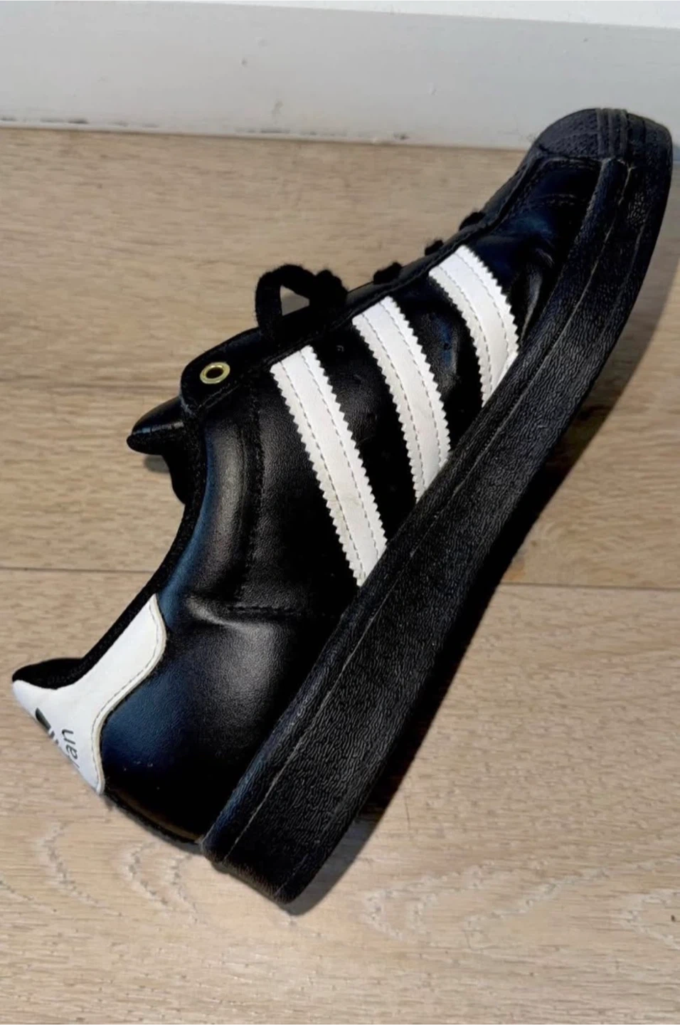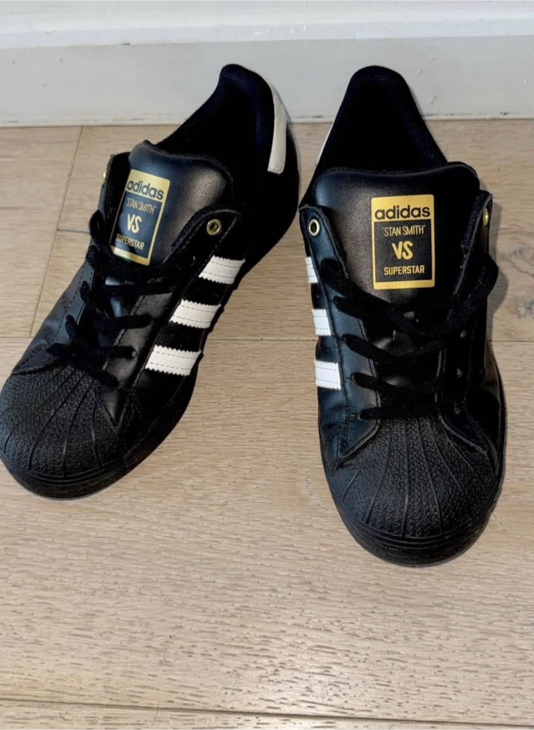 Selling a pair of Adidas Stan Smith Superstar sneakers in black. They feature the classic Adidas three stripes in white. Great for everyday wear!size 3.5 only worn once